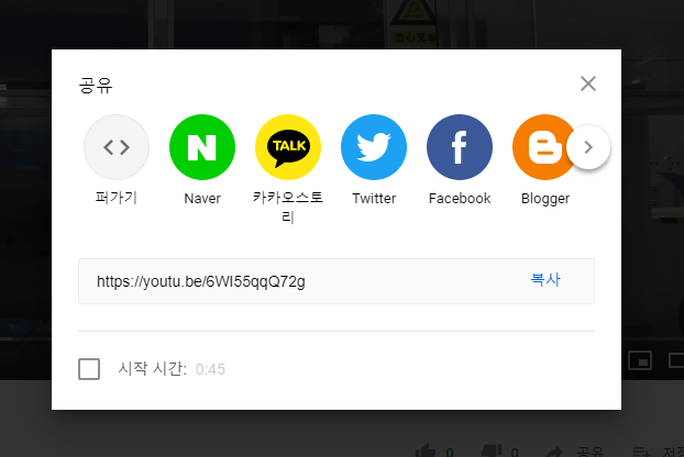 위 이미지처럼 유튜브에서 '공유' 버튼을 누르면 해당 창이 팝업되는데, 이때 '퍼가기'를 누르면,