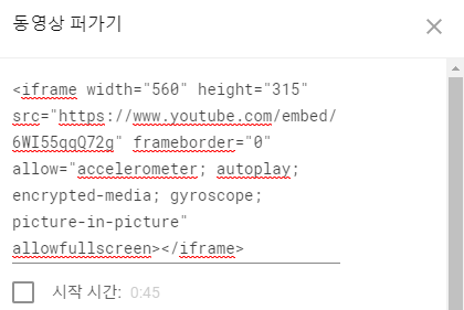 위 이미지처럼 유튜브에서 '공유' 버튼을 누르면 해당 창이 팝업되는데, 이때 '퍼가기'를 누르면,