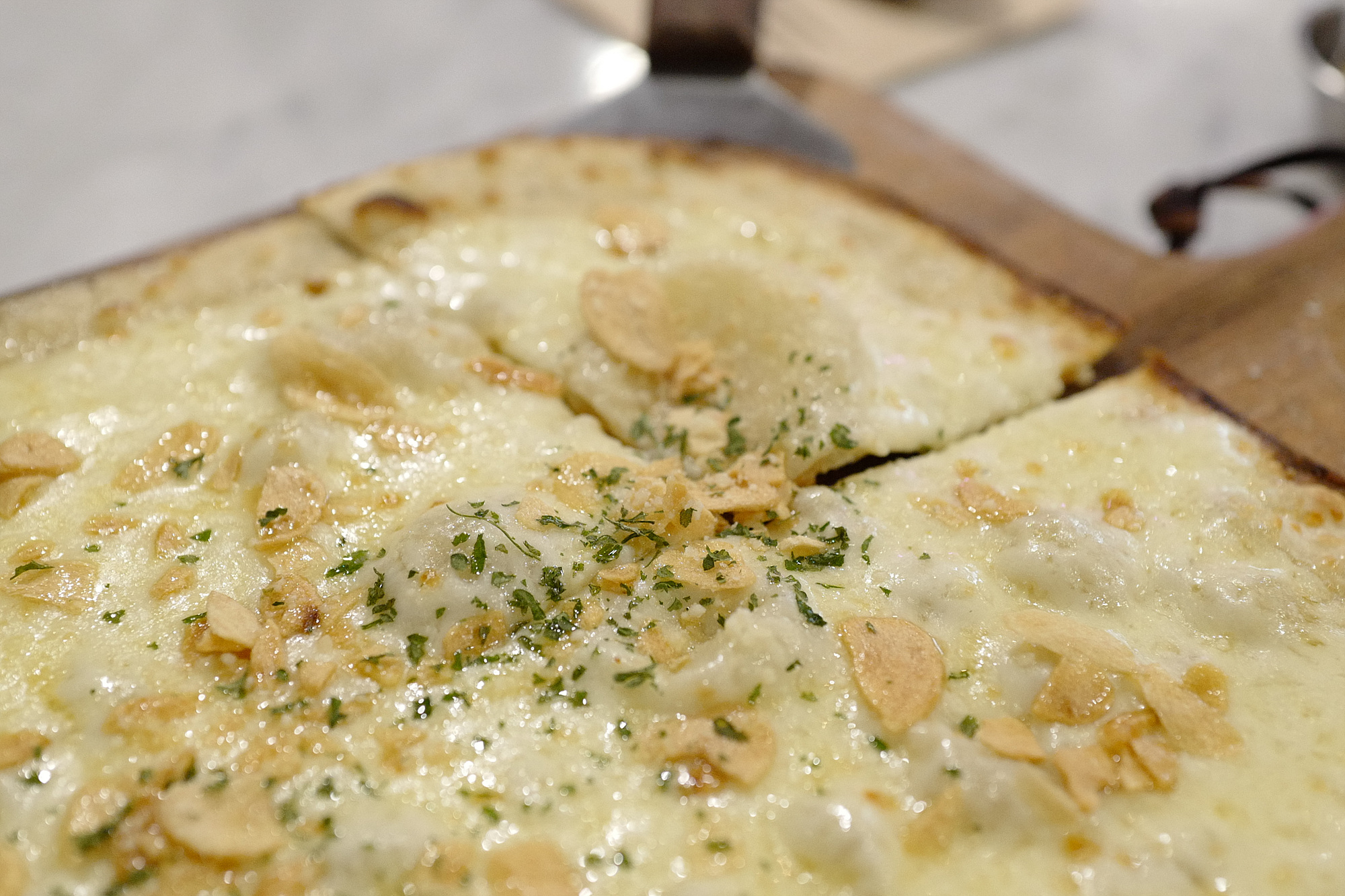 고르곤 치즈 소스, 모짜렐라, 마늘 후레이크, 그라나치즈 조합으로 만들어지는 고르곤졸라 피자
