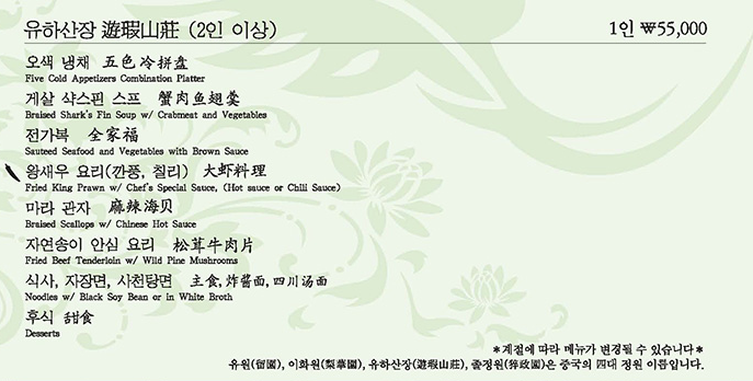 이 날 주문은 디너코스 '유하산장'으로 하였다.