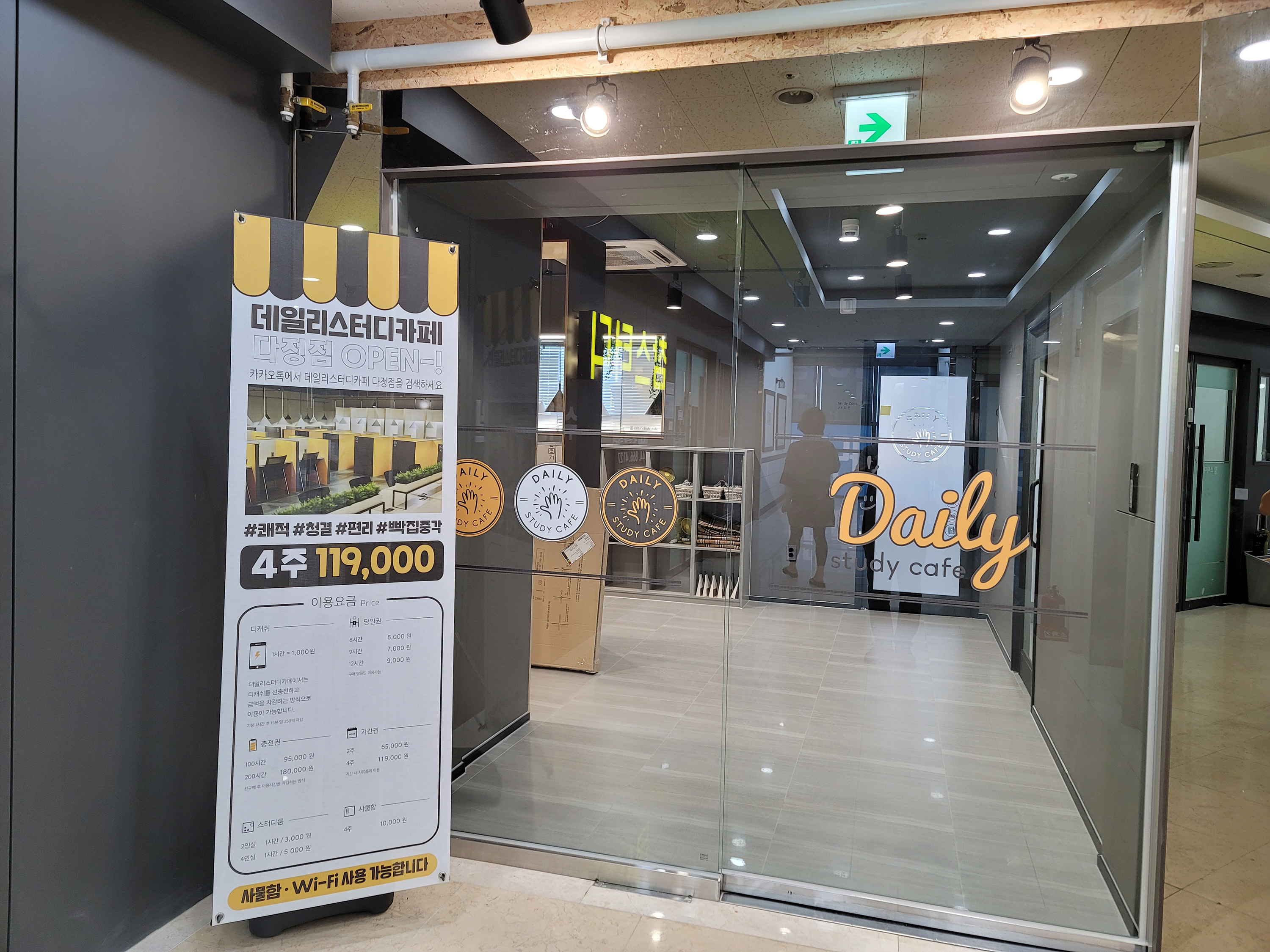 과거 독서실들이 폐쇄적인 느낌 탓에 답답한 감이 컸기 때문인데 여전히 스터디카페 중에서도 답답한 느낌으로 구성하는 곳들이 많은 편이다. 그런면에서 데일리스터디카페 다정점은 입구부터 좋은 인상을 주고 있다.