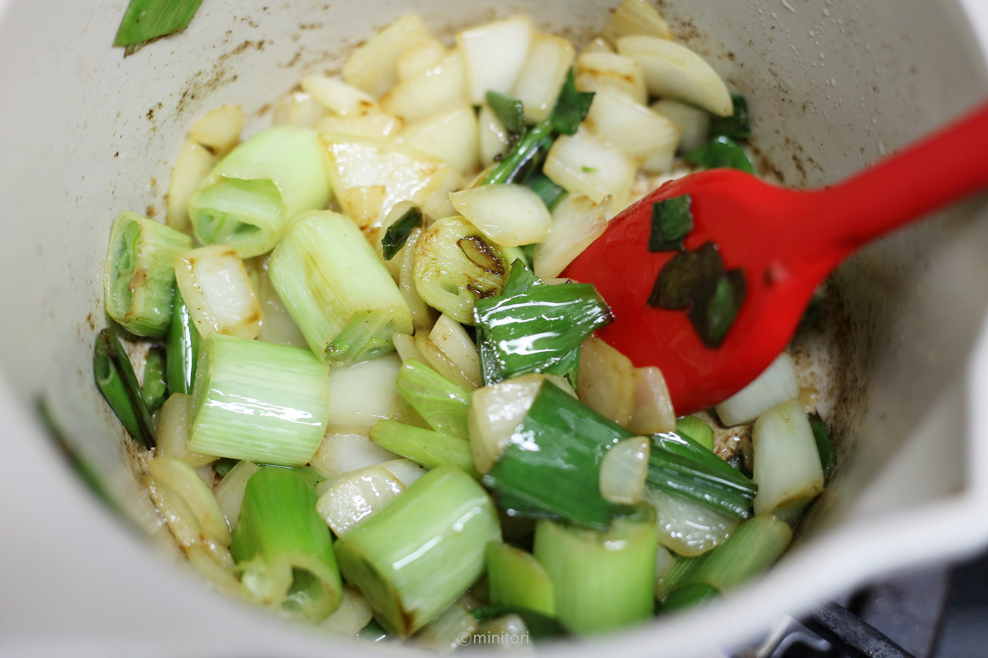 2. 팬에 버터를 녹이고 대파와 양파를 넣어 중약불에서 겉이 노릇해질때까지 볶아준다.