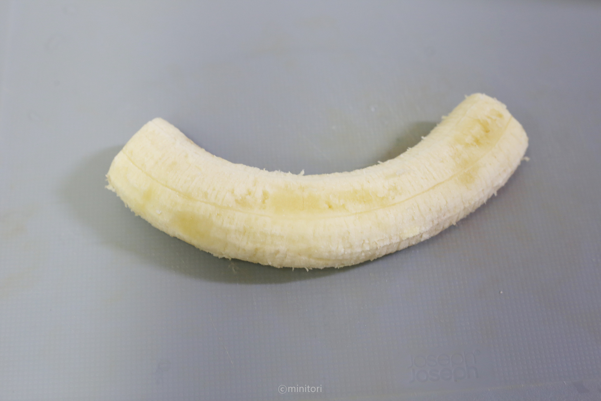 1. 바나나는 껍질을 벗겨내고 양끝을 자르고 얇게 슬라이스하여 반으로 나눈다