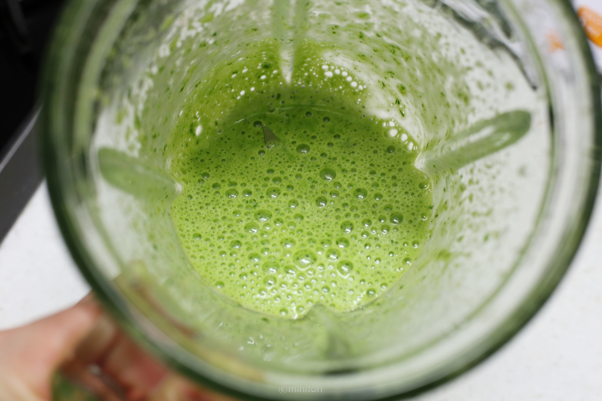 2. 믹서에 바나나반개 깨끗이 씻어 물기를 제거한 시금치 달걀 한개를 넣어 곱게 갈아준다.