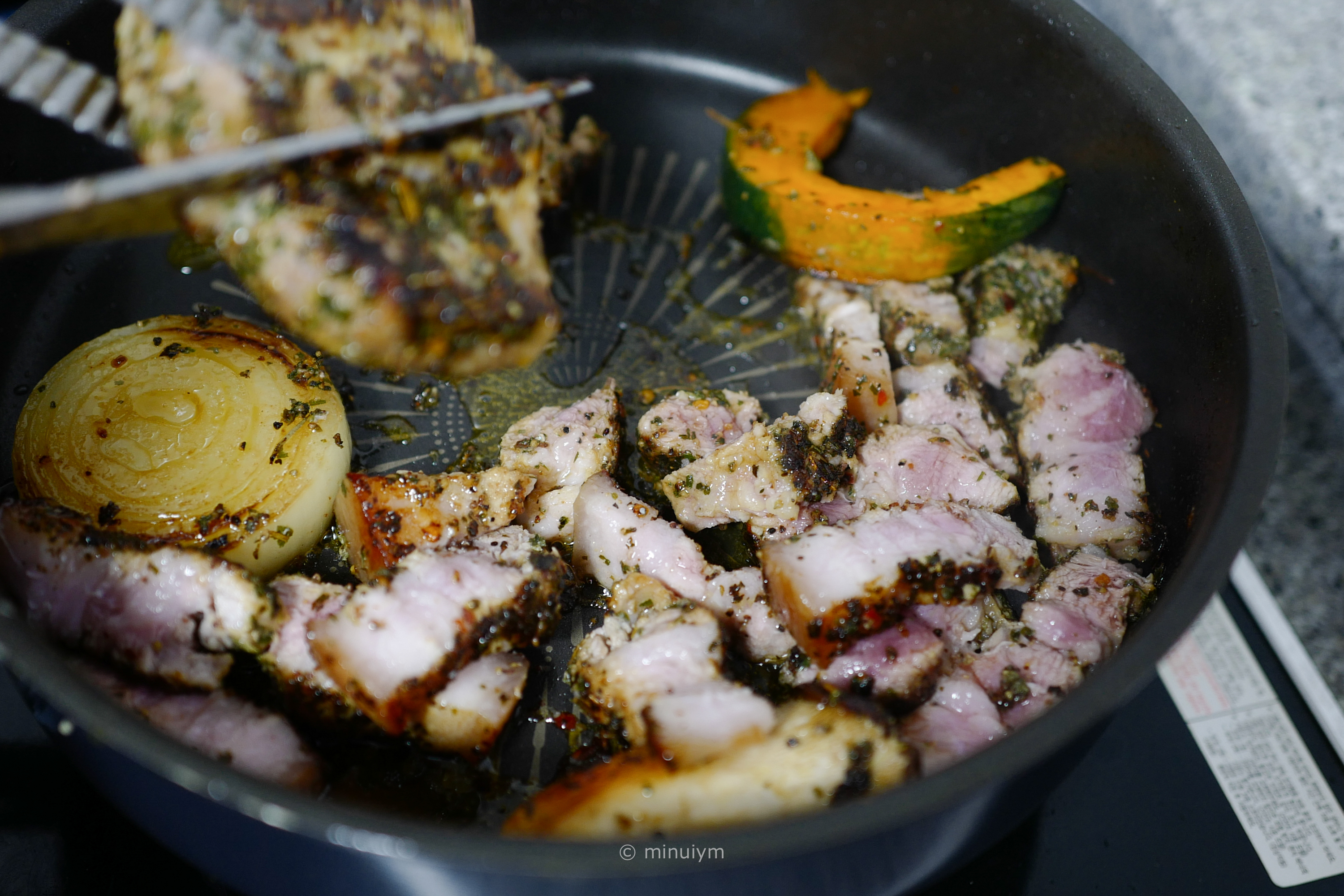 고기와 곁들여 먹을 양파, 단호박, 버섯도 함께 그리들 위에 올려주고 센불에 구워주었다.