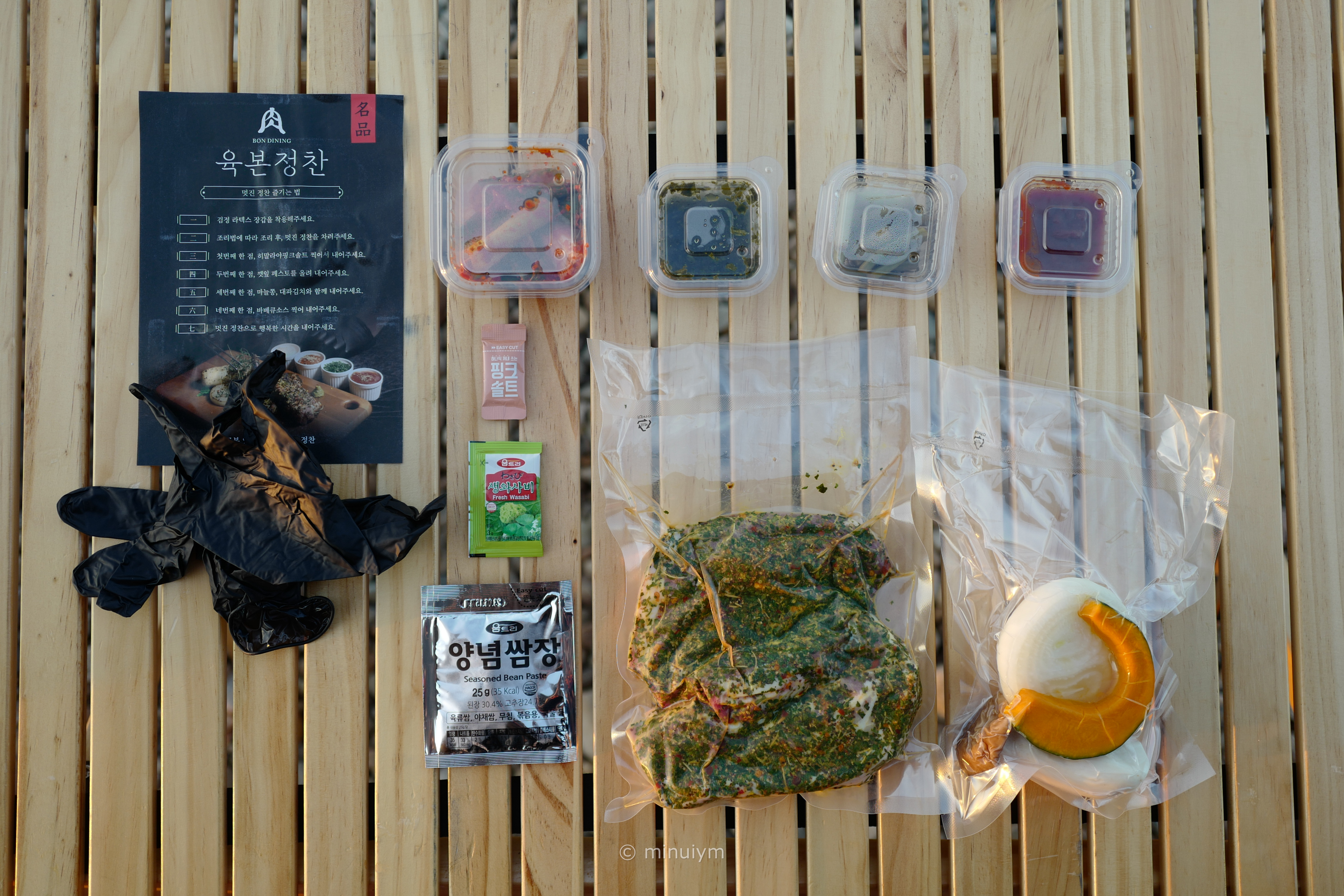 육본정찬, 맛있게 즐기는 방법이 적혀있는 안내종이와 검정 라텍스 장갑