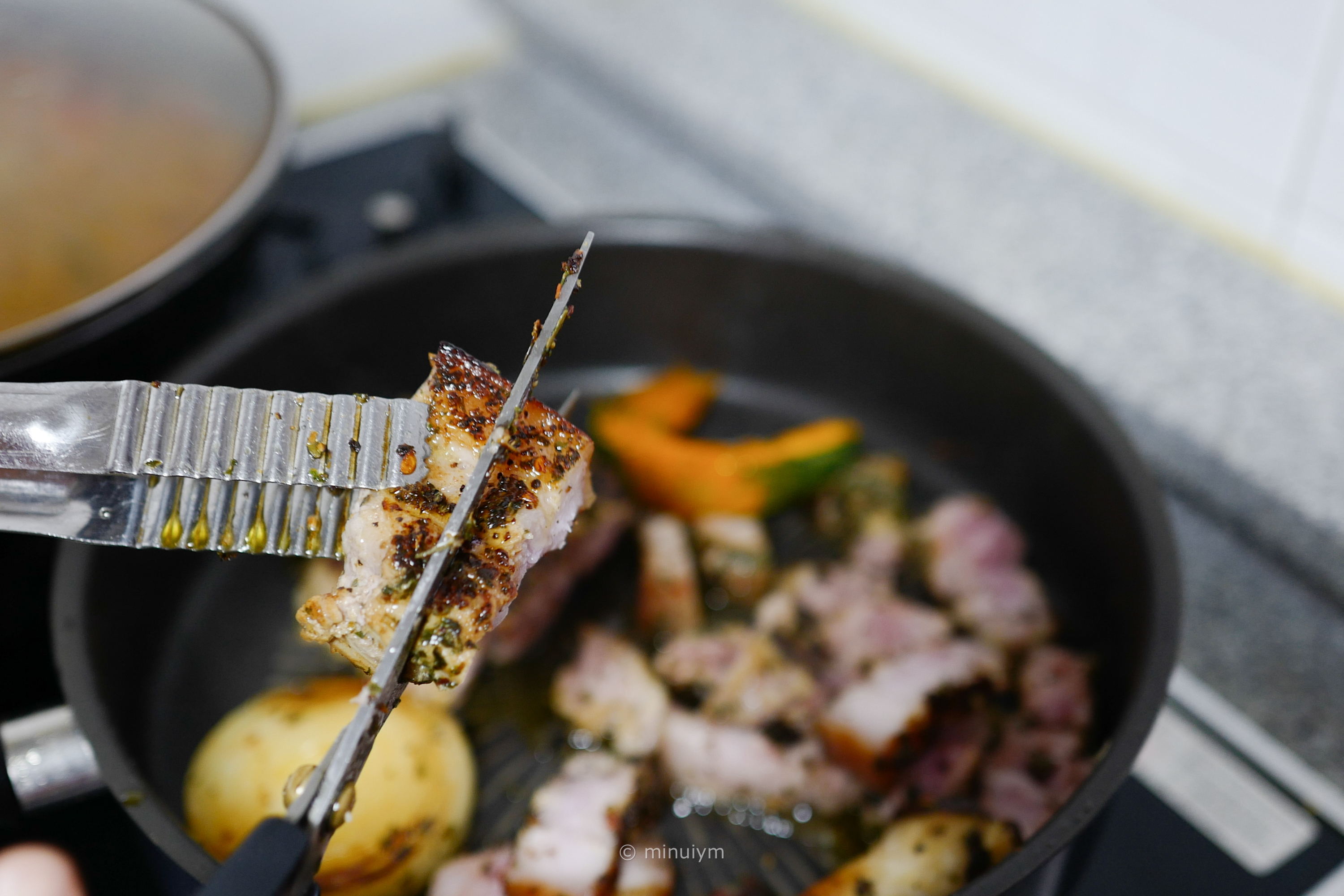 겉을 센불에 구워 육즙을 가두어주고 약한불에 고기를 잘게 잘라서 속까지 익혀주면 된다.