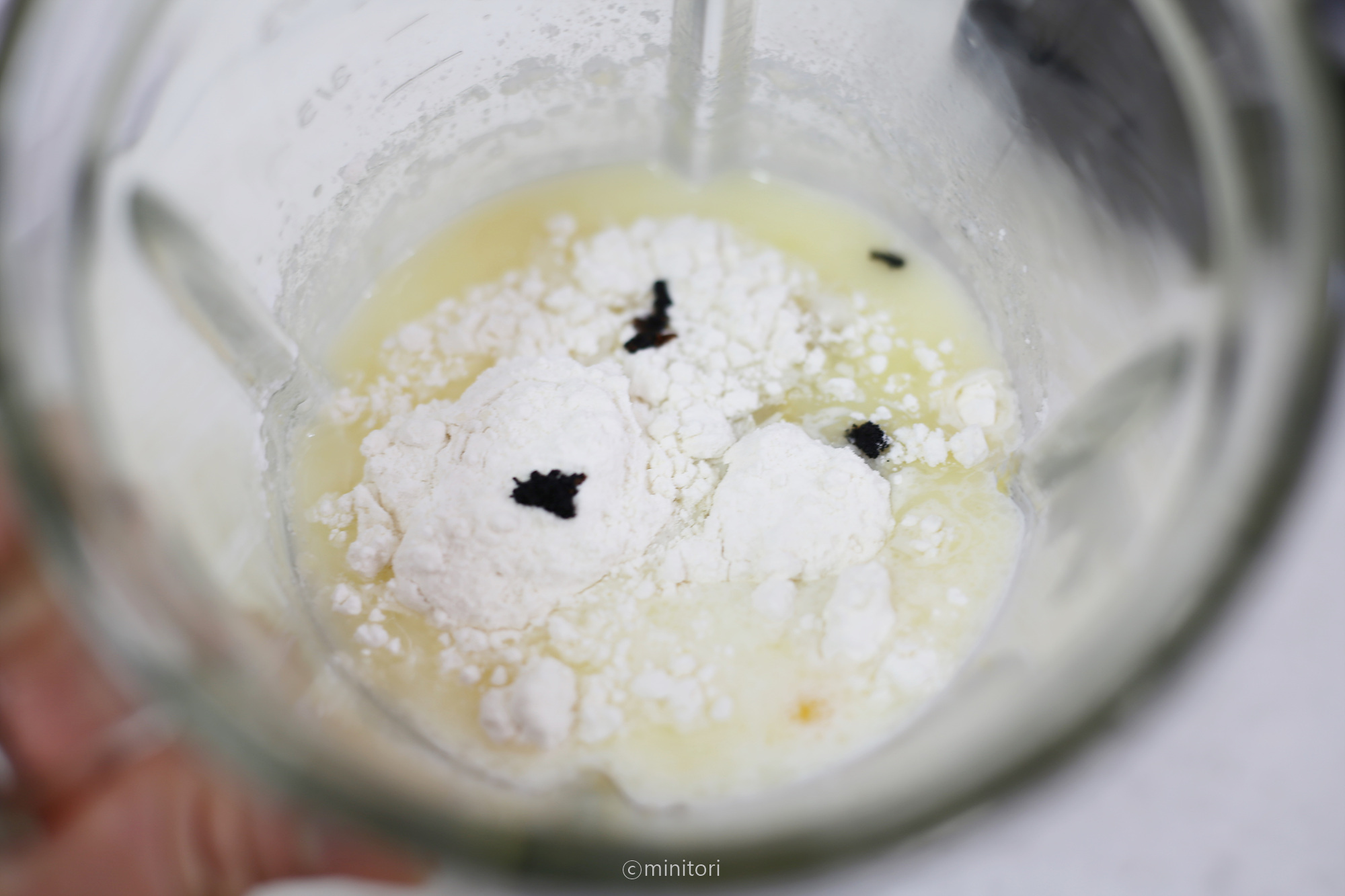 믹서에 구운고구마와 달걀노른자, 녹인버터, 우유, 박력분, 바닐라빈씨를 넣고 곱게 갈아줍니다.