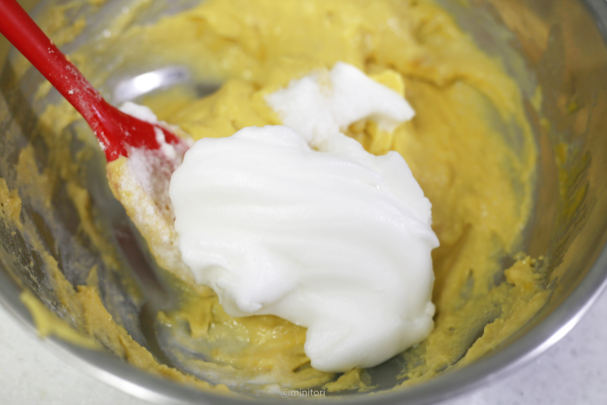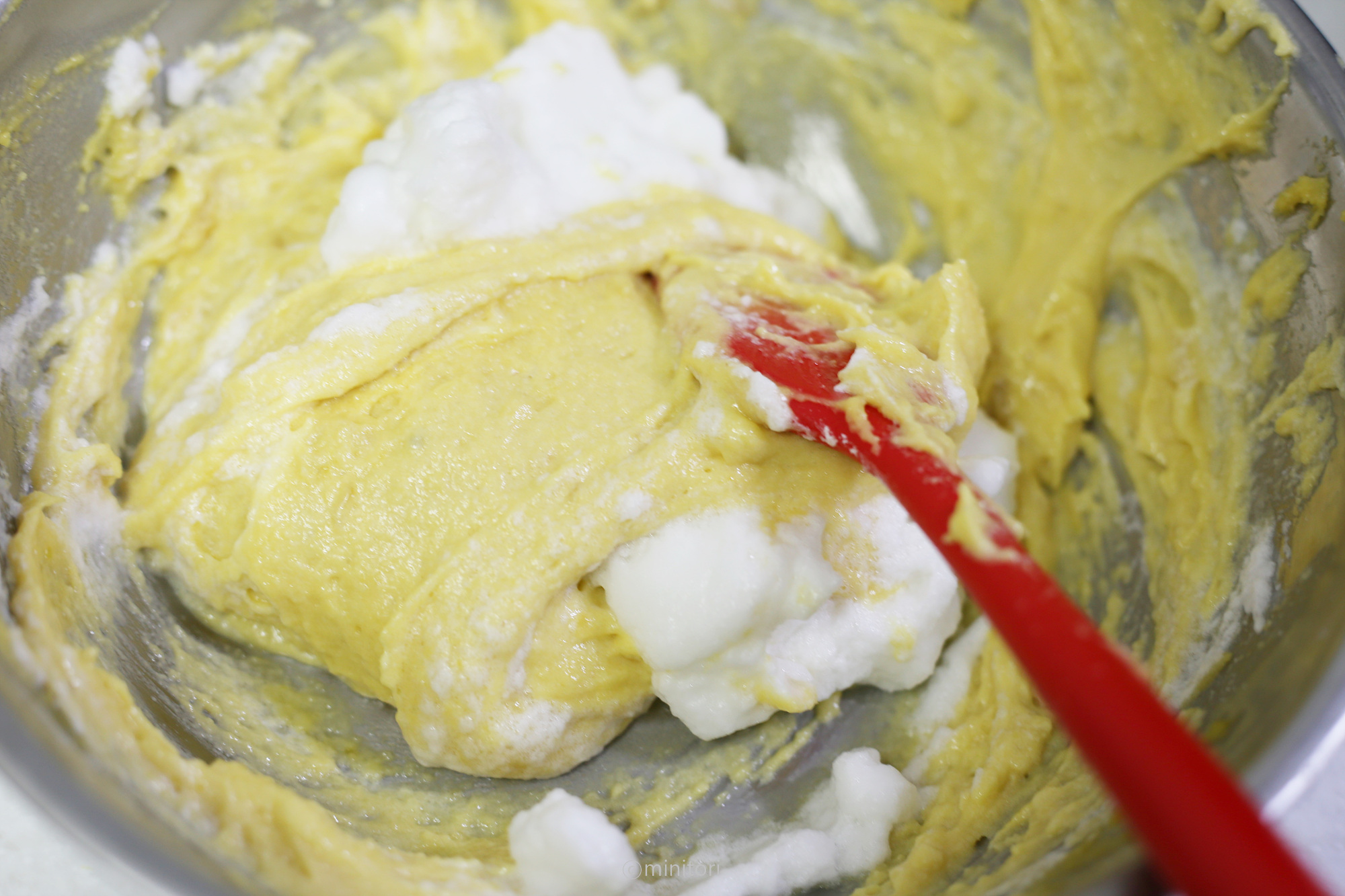7. 머랭을 노른자 반죽에 3번에 걸쳐 나눠 거품이 꺼지지 않게 섞어준다.