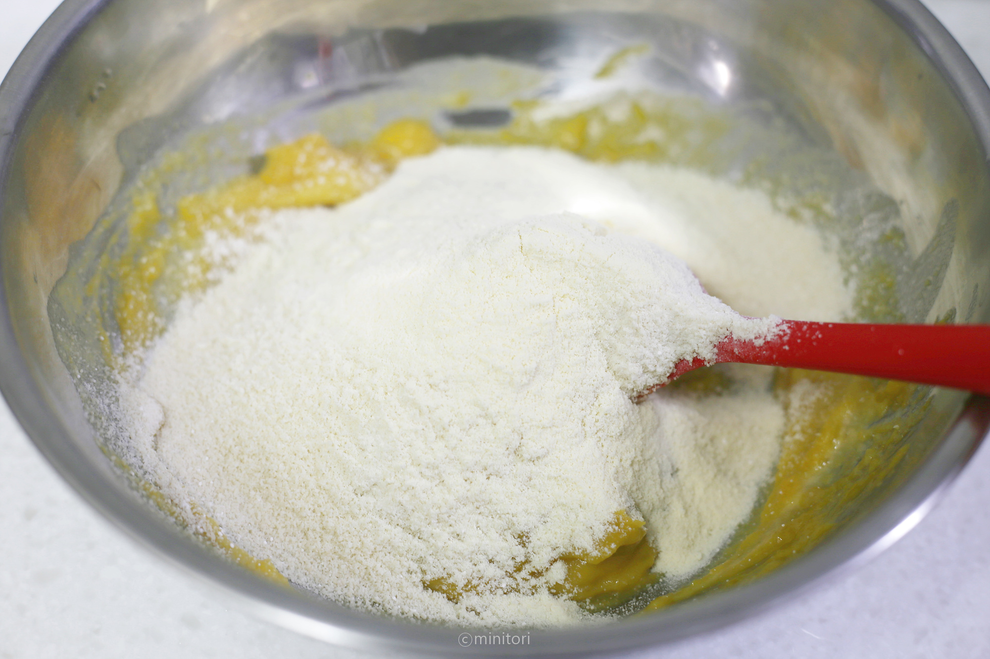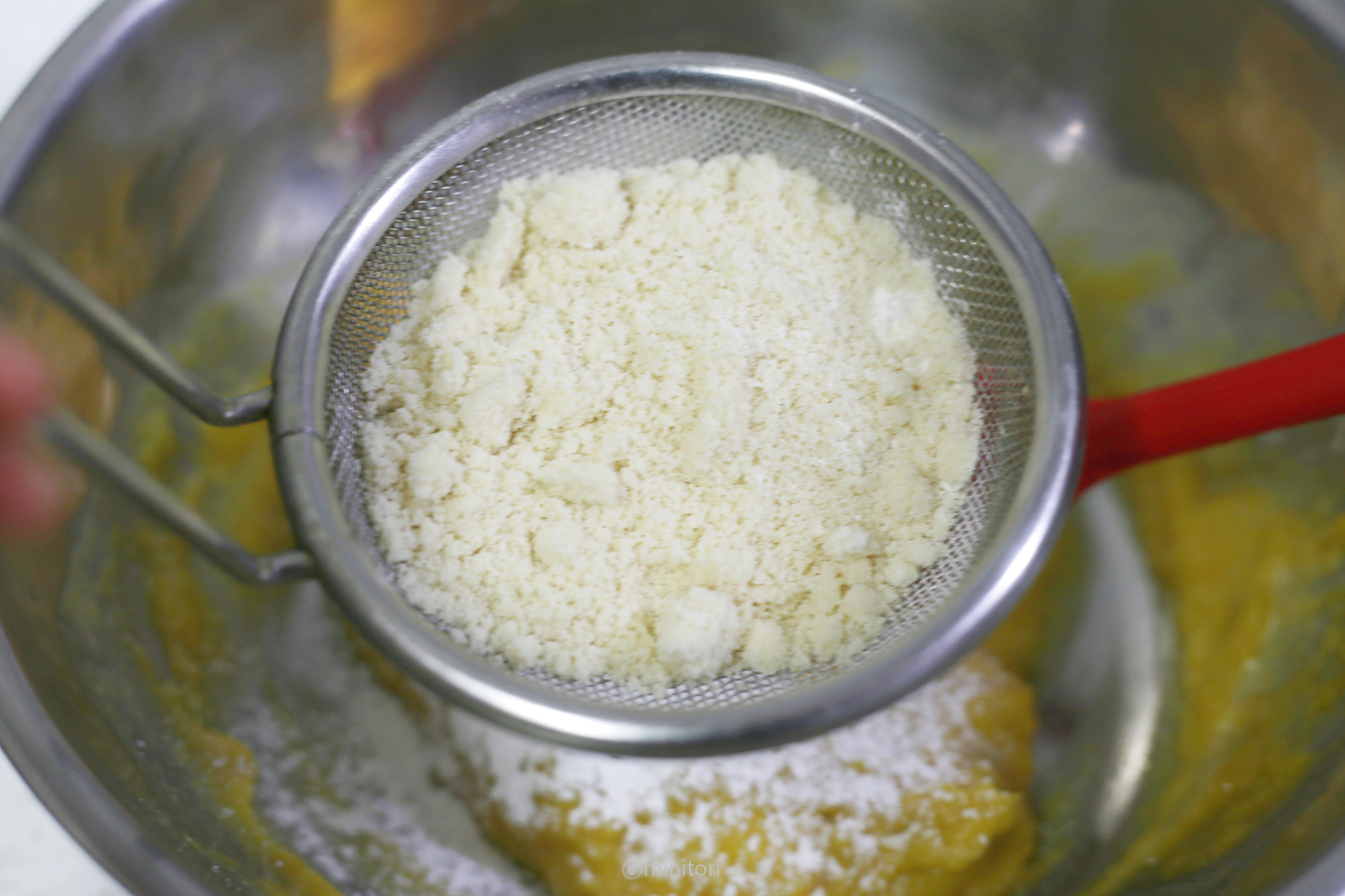 4. 코코넛오일과 아몬드가루, 박력분, 분유가루, 베이킹파우더를 체쳐 넣는다.