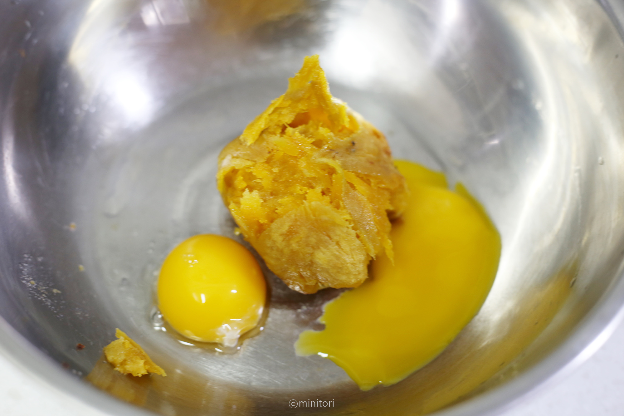 2. 마른볼 두개를 준비하여 계란을 노른자와 흰자로 분리하여 나누고 노른자볼에 고구마를 넣고 으깨면서 섞는다.