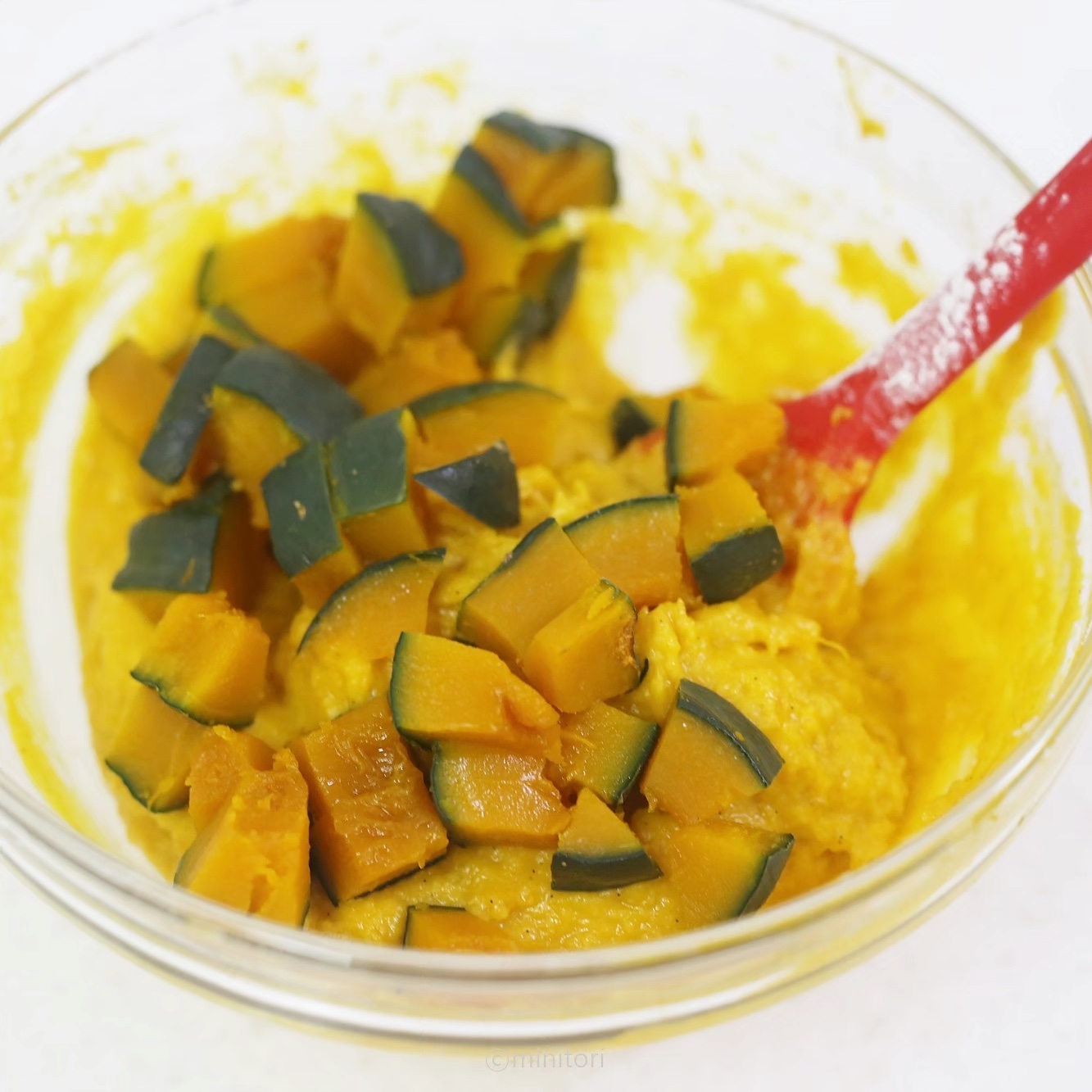 9. 8에 깍둑썰기한 밤호박을 넣고 섞는다.
