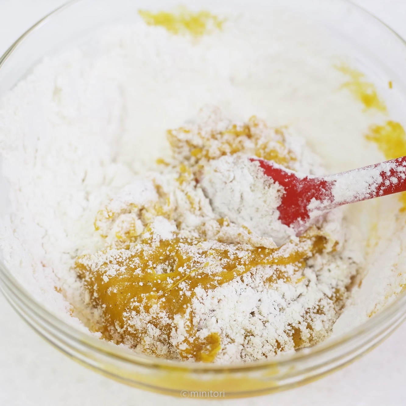 13. 12를 반죽볼에 모두 넣고 주걱을 들어올리며 거품이 꺼지지 않도록 잘 섞는다.