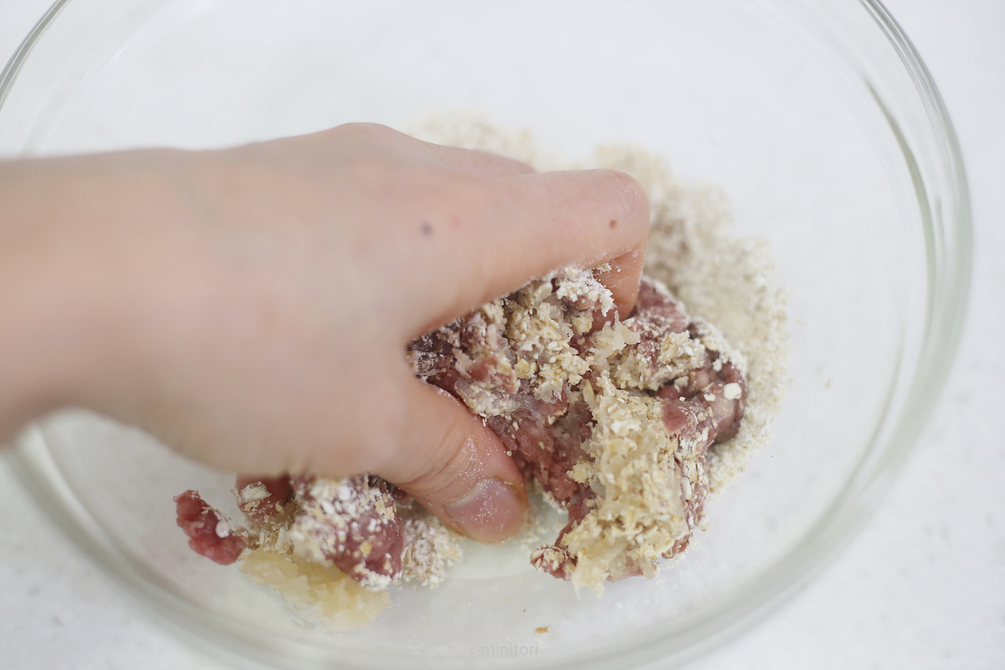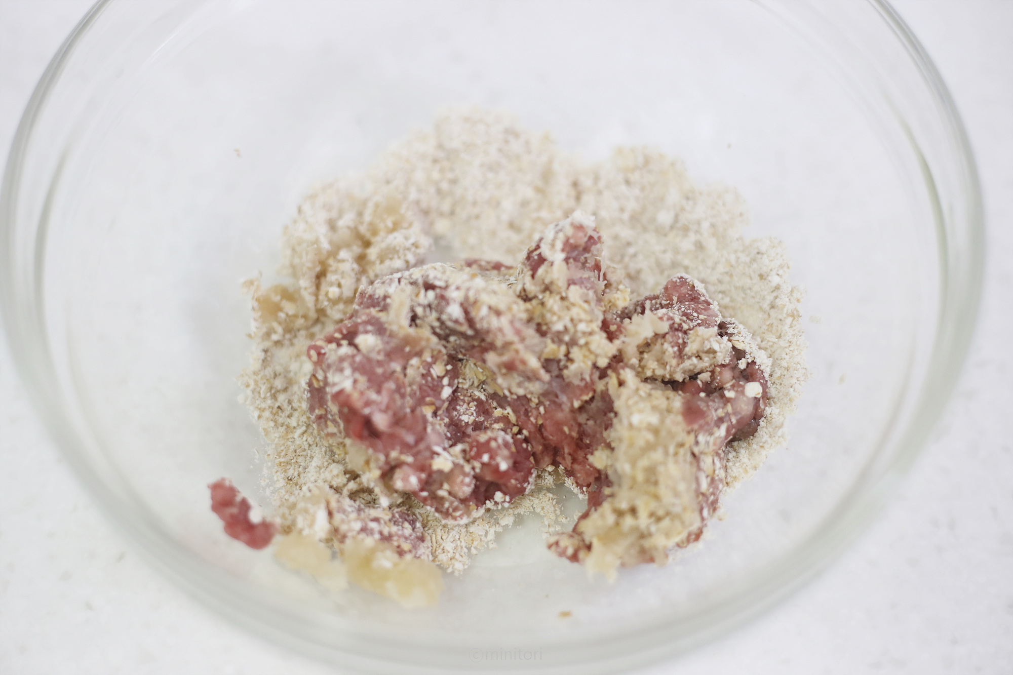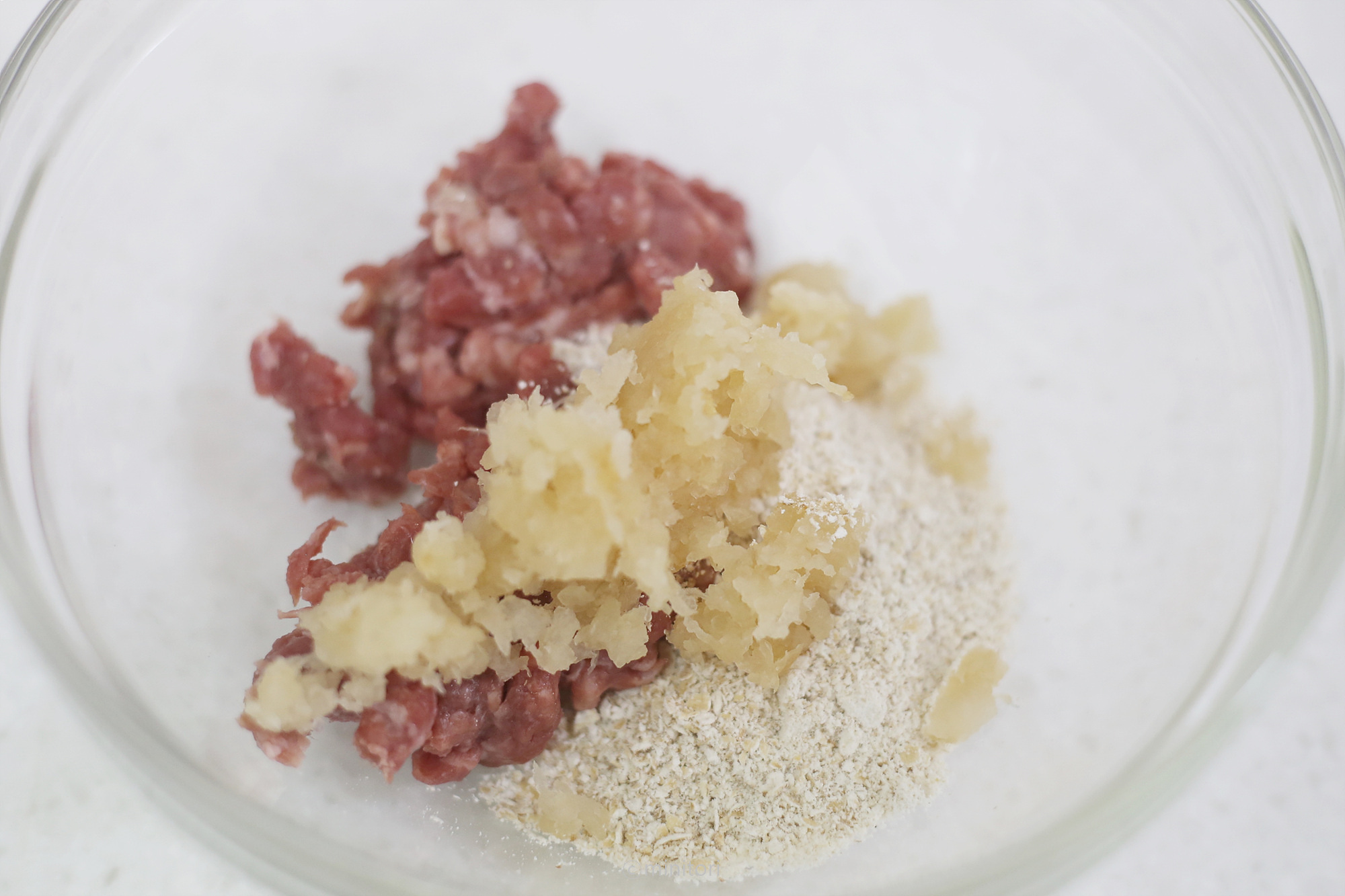 3. 볼에 다진소고기, 볶은무, 오트밀가루를 넣고 재료가 잘 섞이도록 치대어 반죽한다.