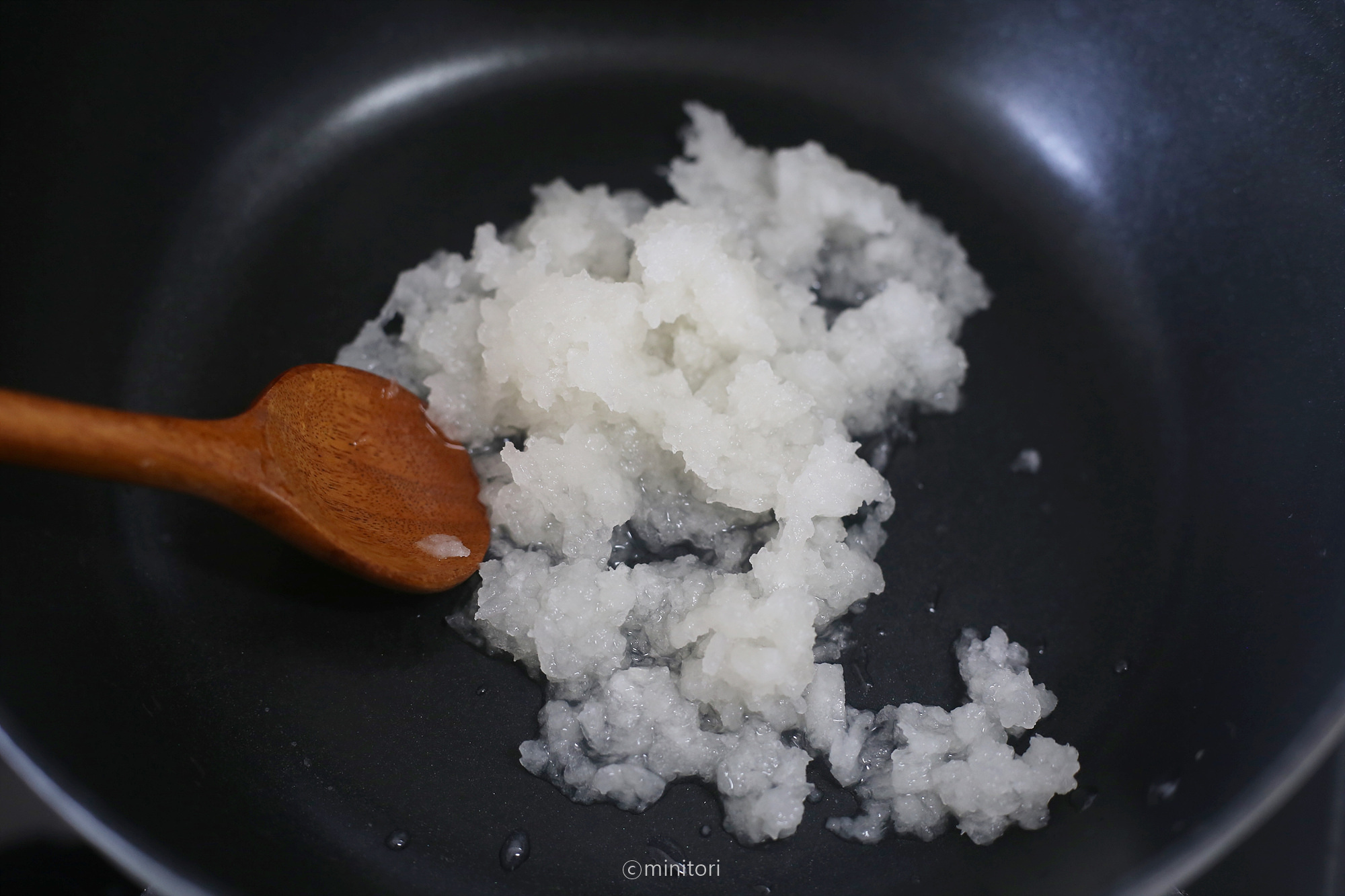 2. 간 무를 팬에 넣고 수분을 날리며 볶는다. 무가 바닥에 눌러붙을때쯤 약불로 줄이고 노릇노릇해질때까지 볶고 한김 식혀둔다.