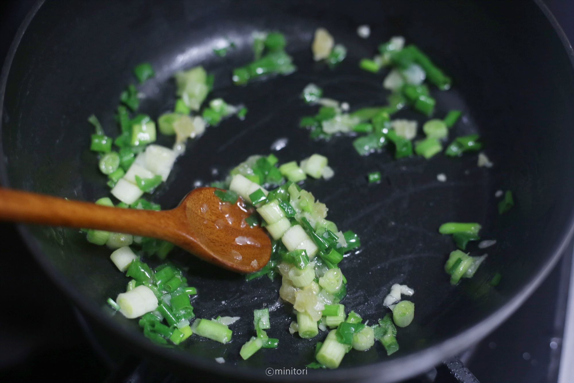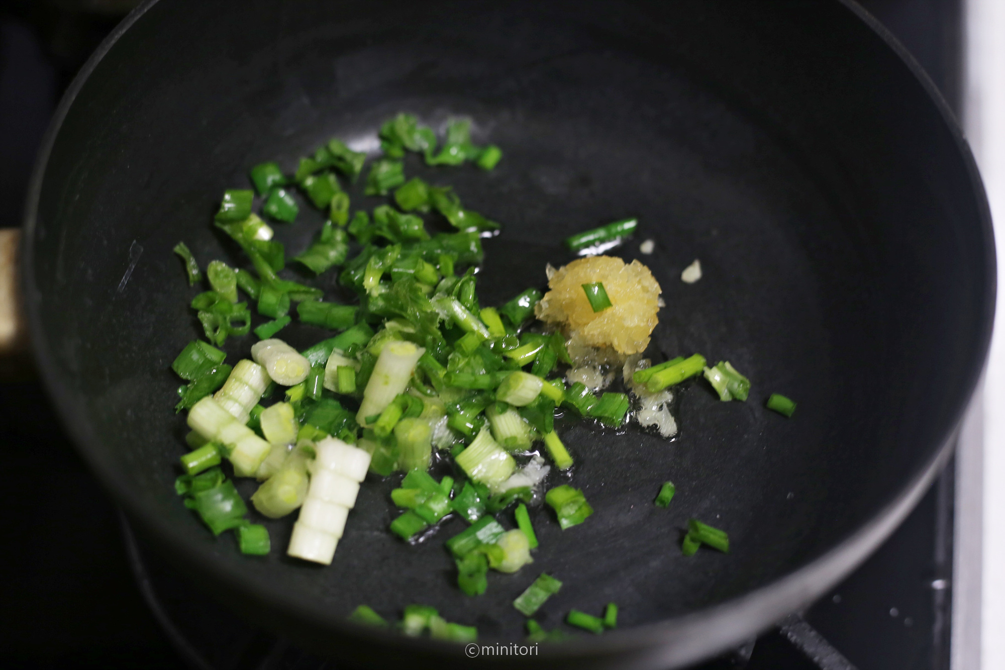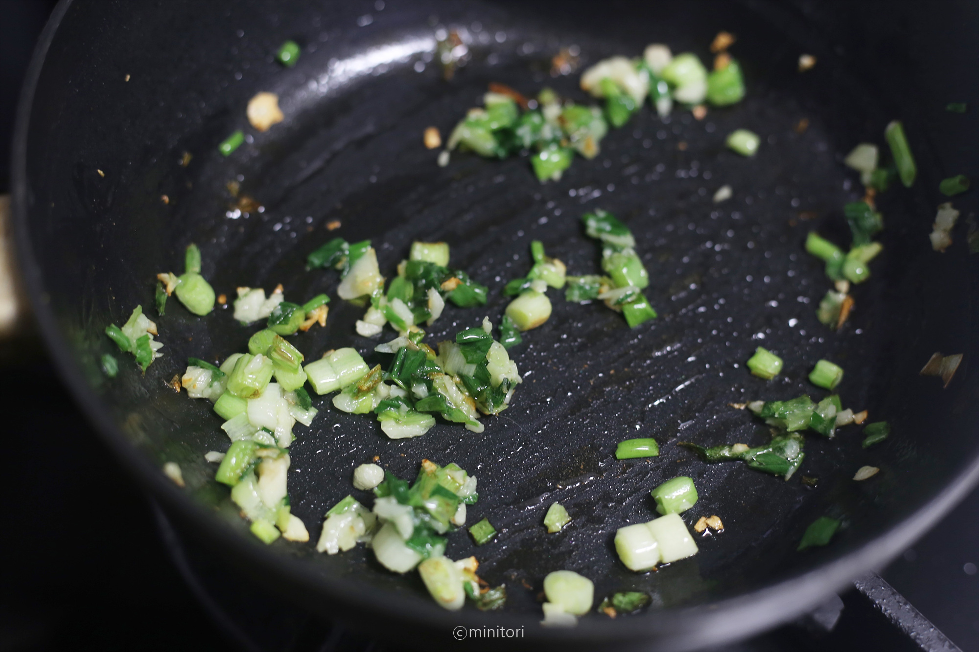5. 팬에 현미유를 두르고 다진마늘과 쪽파를 넣고 중약불에서 마늘이 노릇해질때까지 볶는다.