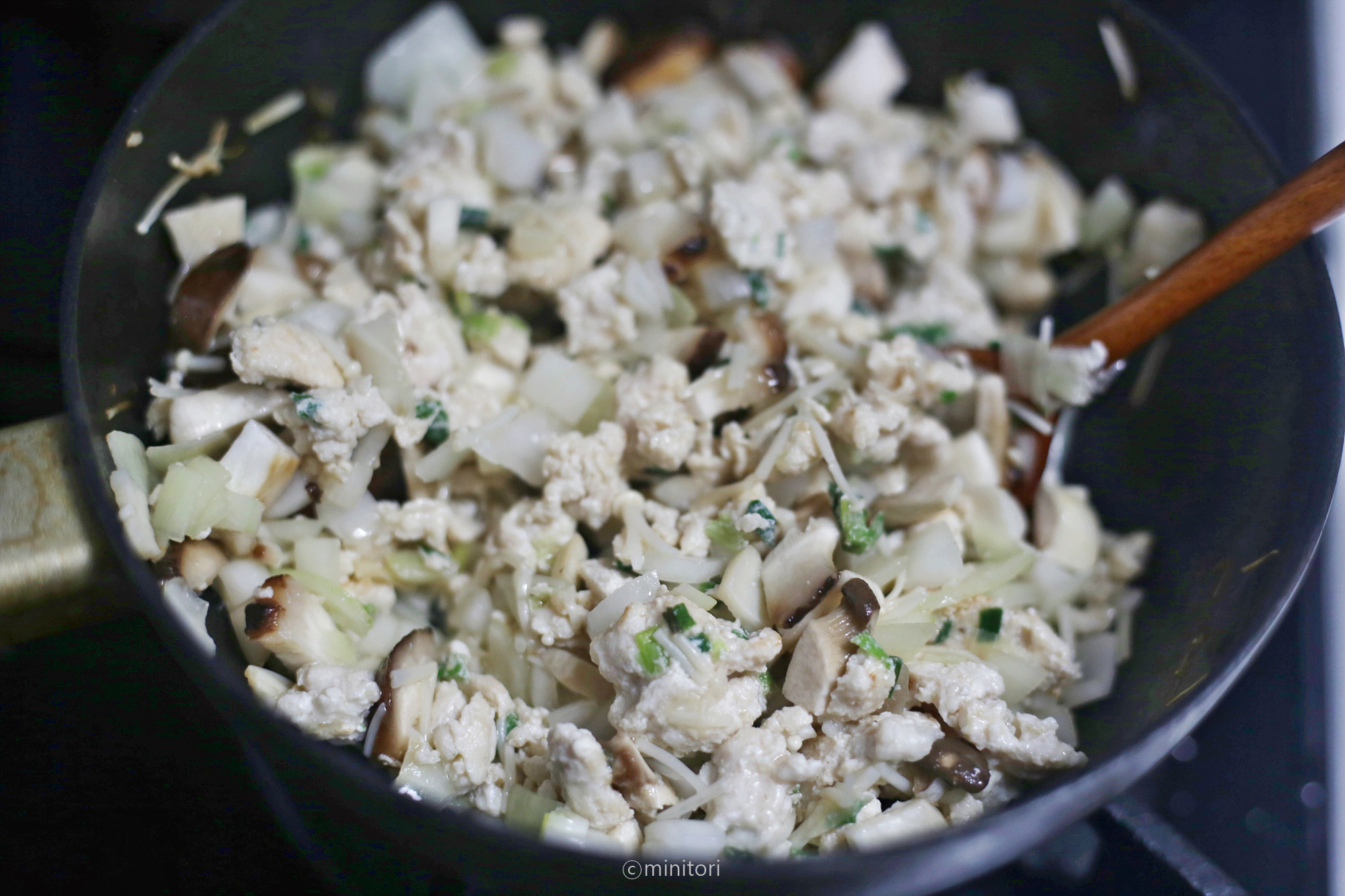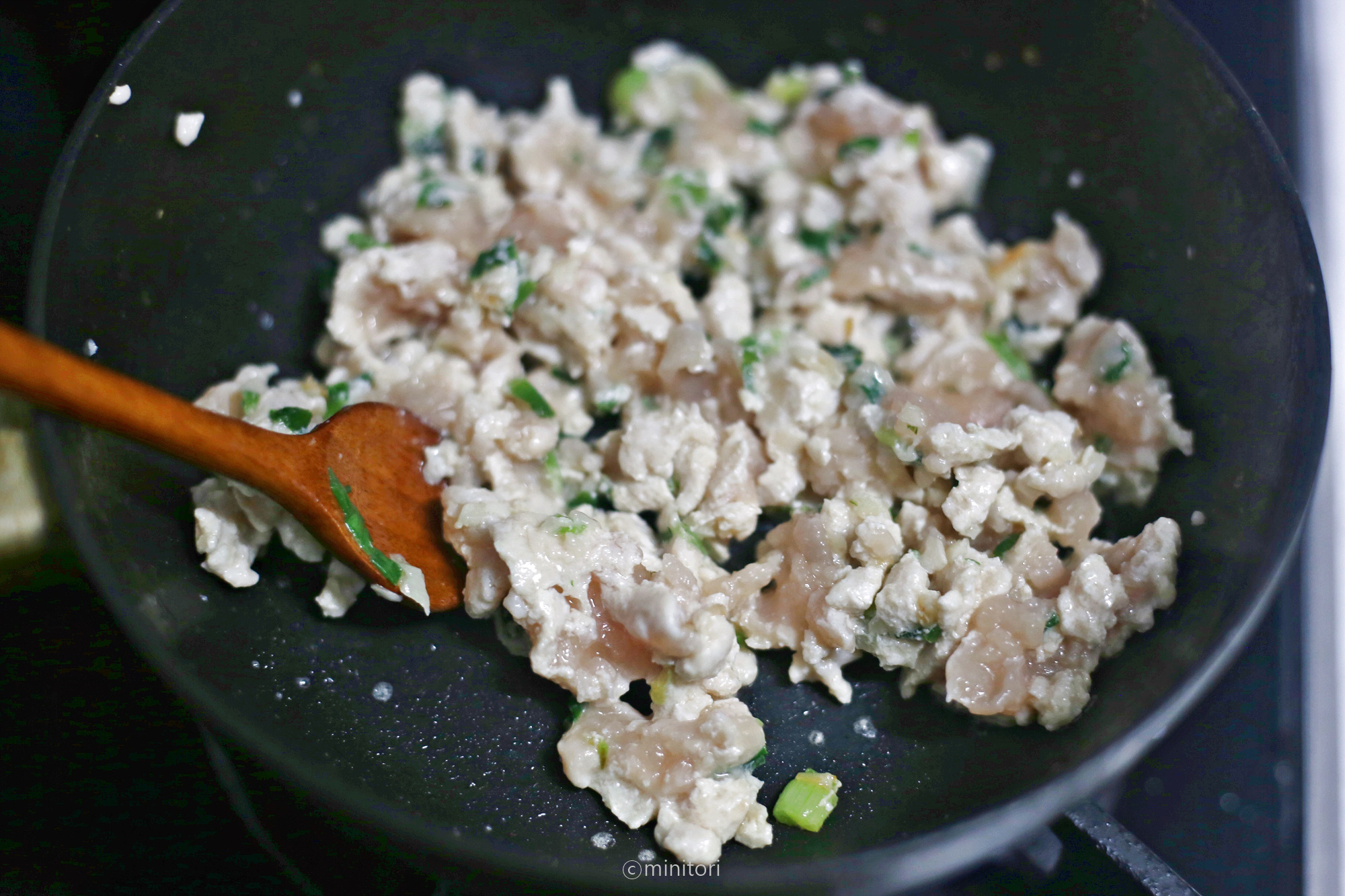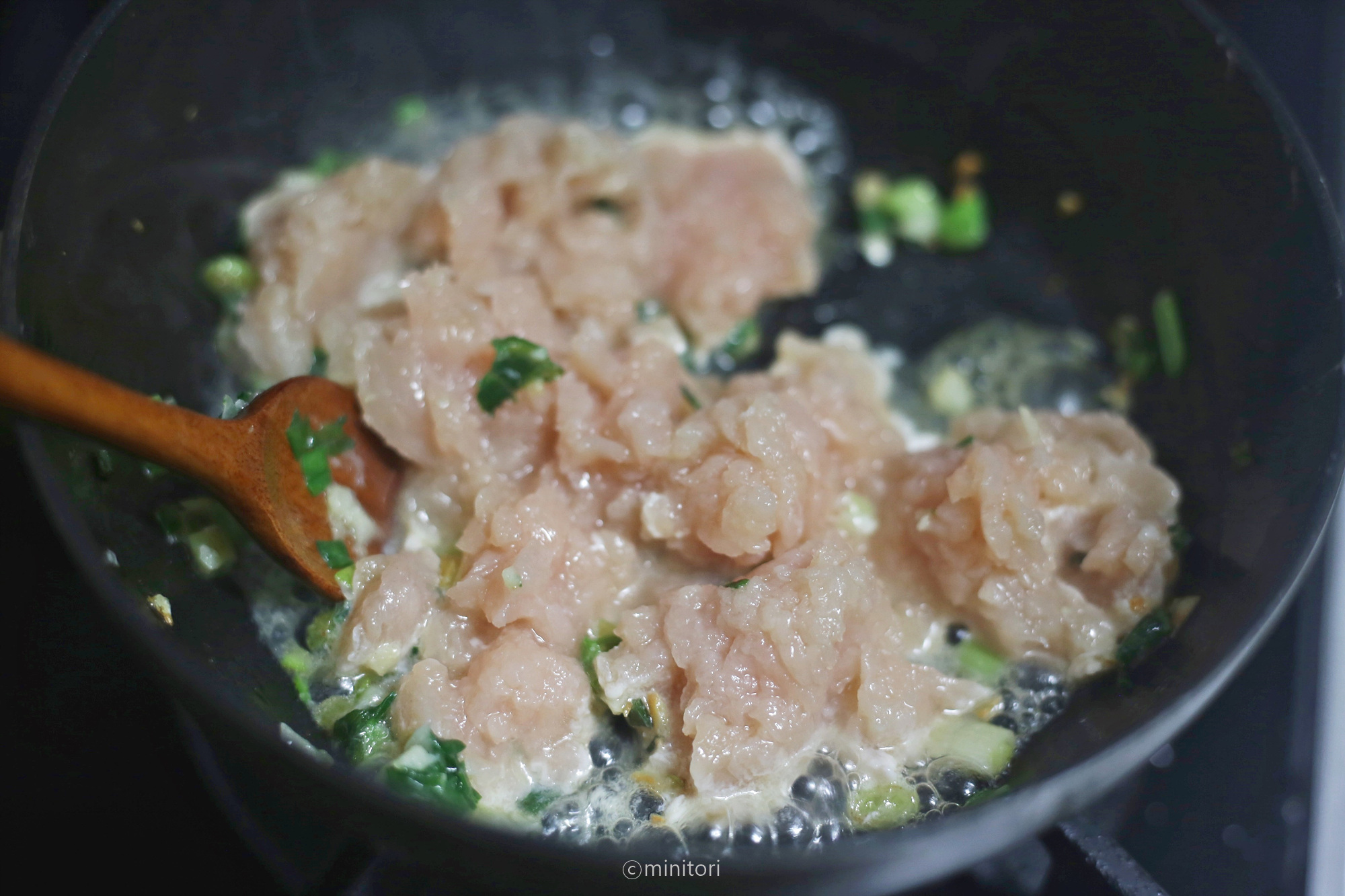 5. 팬에 현미유를 두르고 다진마늘과 쪽파를 넣고 중약불에서 마늘이 노릇해질때까지 볶는다.