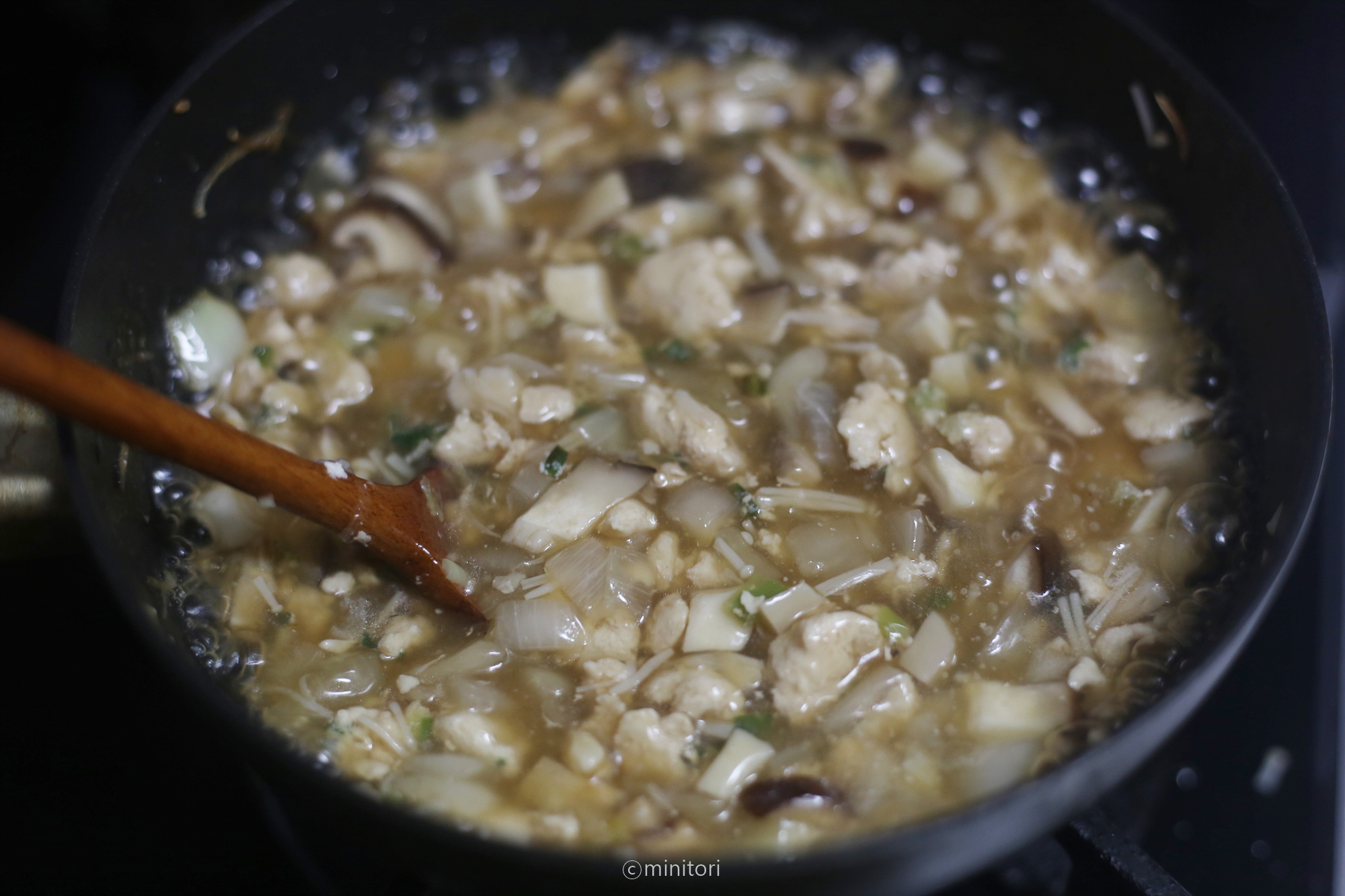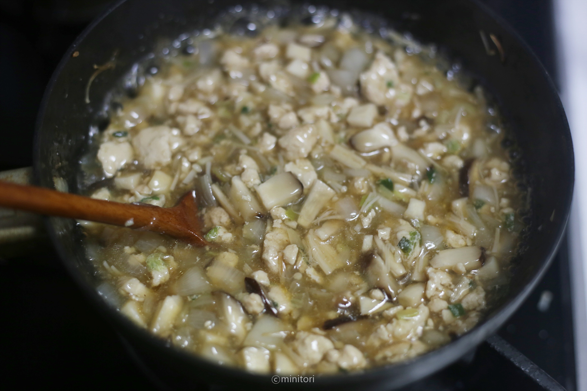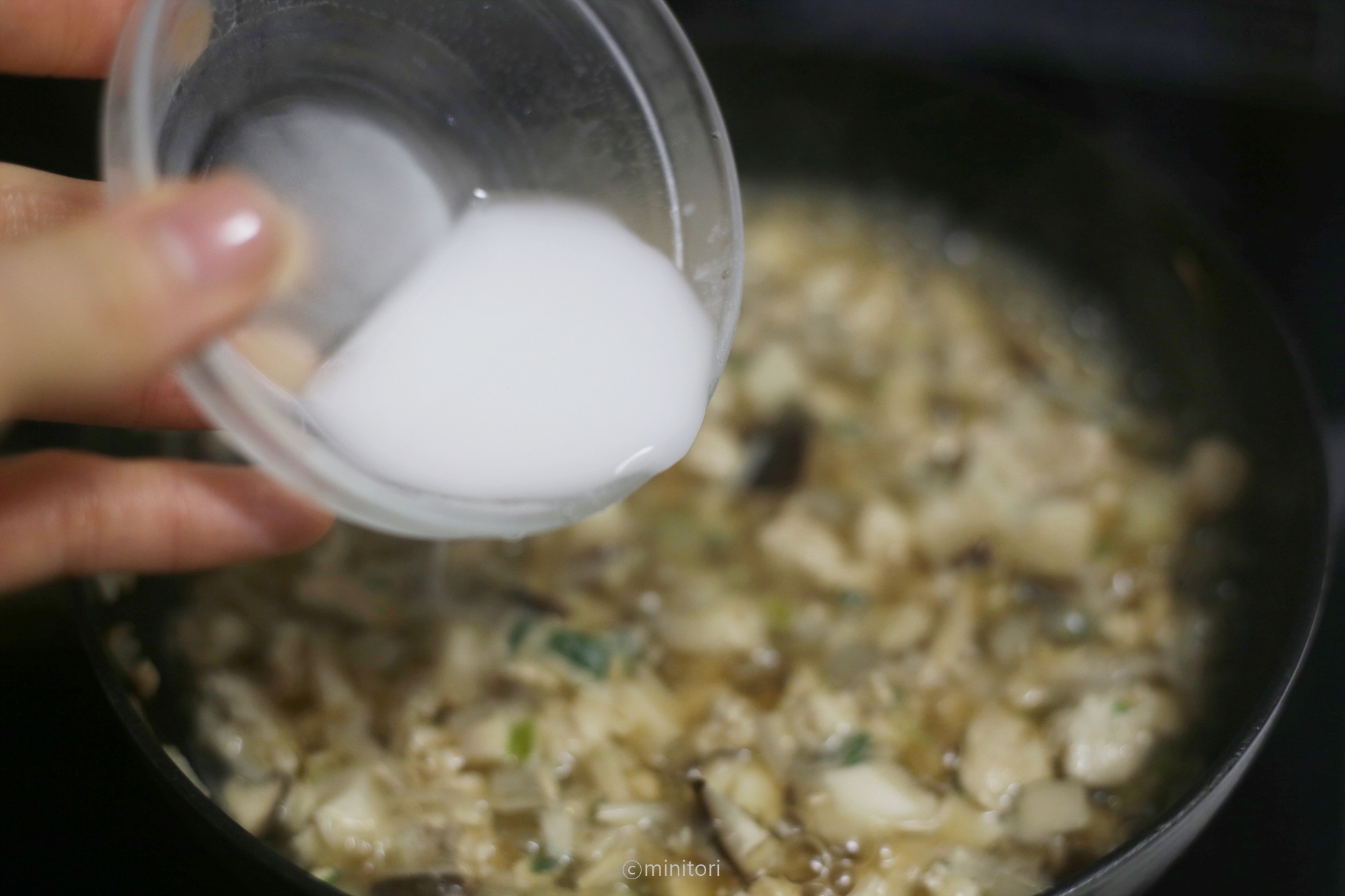 10. 전분과 물을 1:1 비율로 섞어 전분물을 만들고 바글바글 끓어오르면 약불로 줄이고 전분물을 둘러붓고 소스의 농도를 맞춘다. (전분물을 붓고 숟가락으로 계속 저어주어야 전분물이 뭉치지 않아요.)