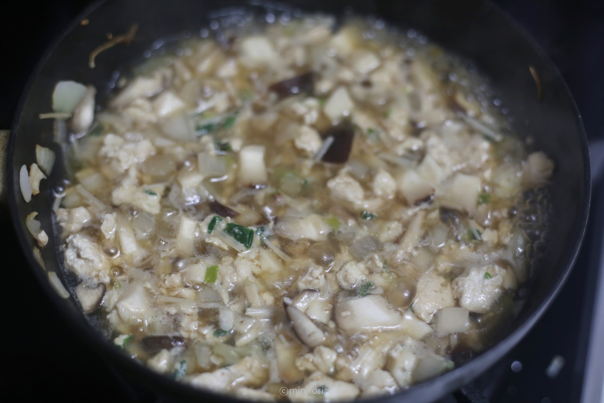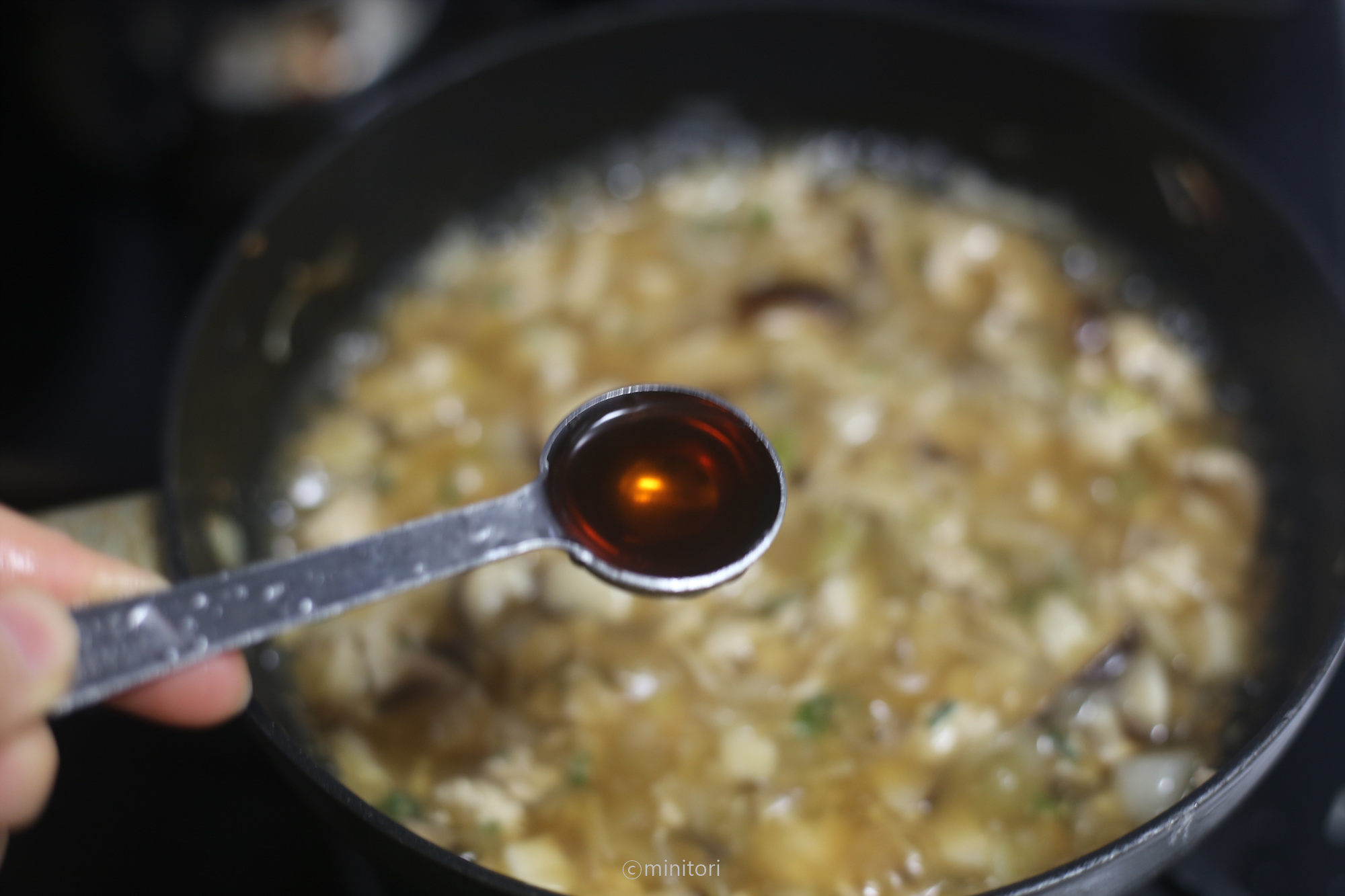 11. 1~2분정도 더 끓이고 참기름을 넣어 섞고 불을 끈다.