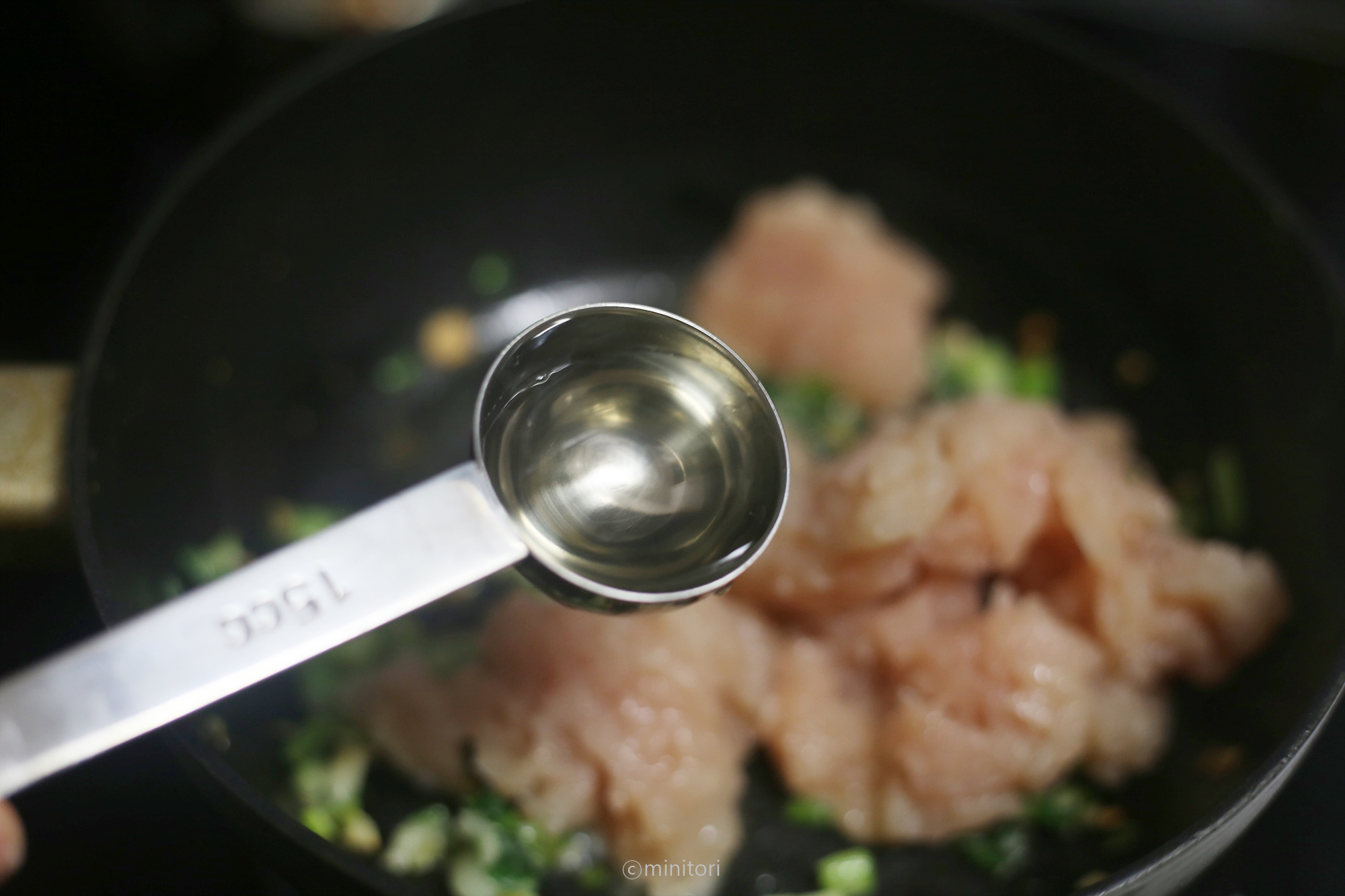 6. 닭안심은 힘줄을 제거하고 아기가 먹기좋은 크기로 썰거나 다져서 청주 1스푼과 함께 넣어 볶는다.