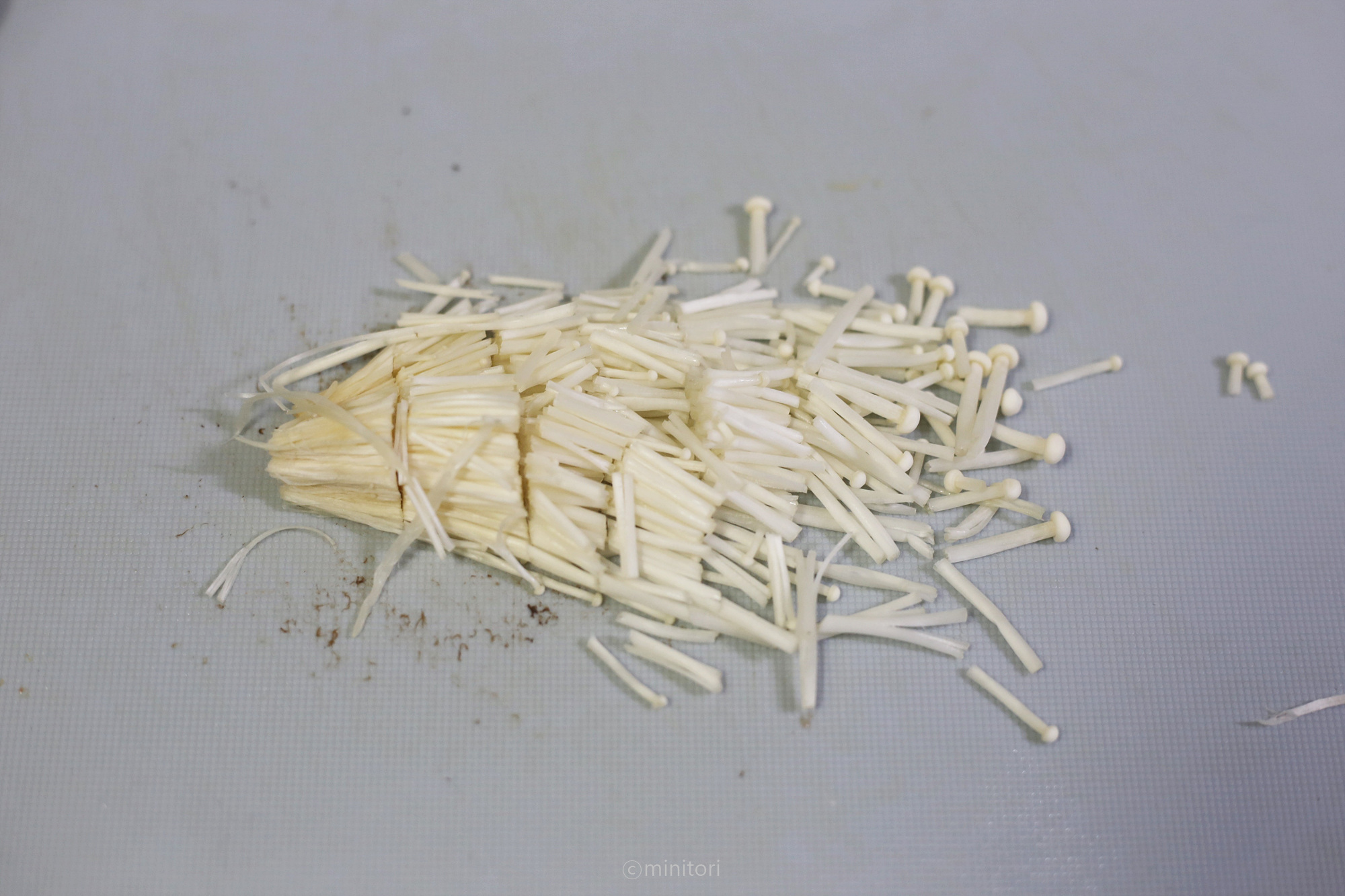 2. 팽이버섯은 밑동을 잘라내고 1~2cm 길이로 자른다.