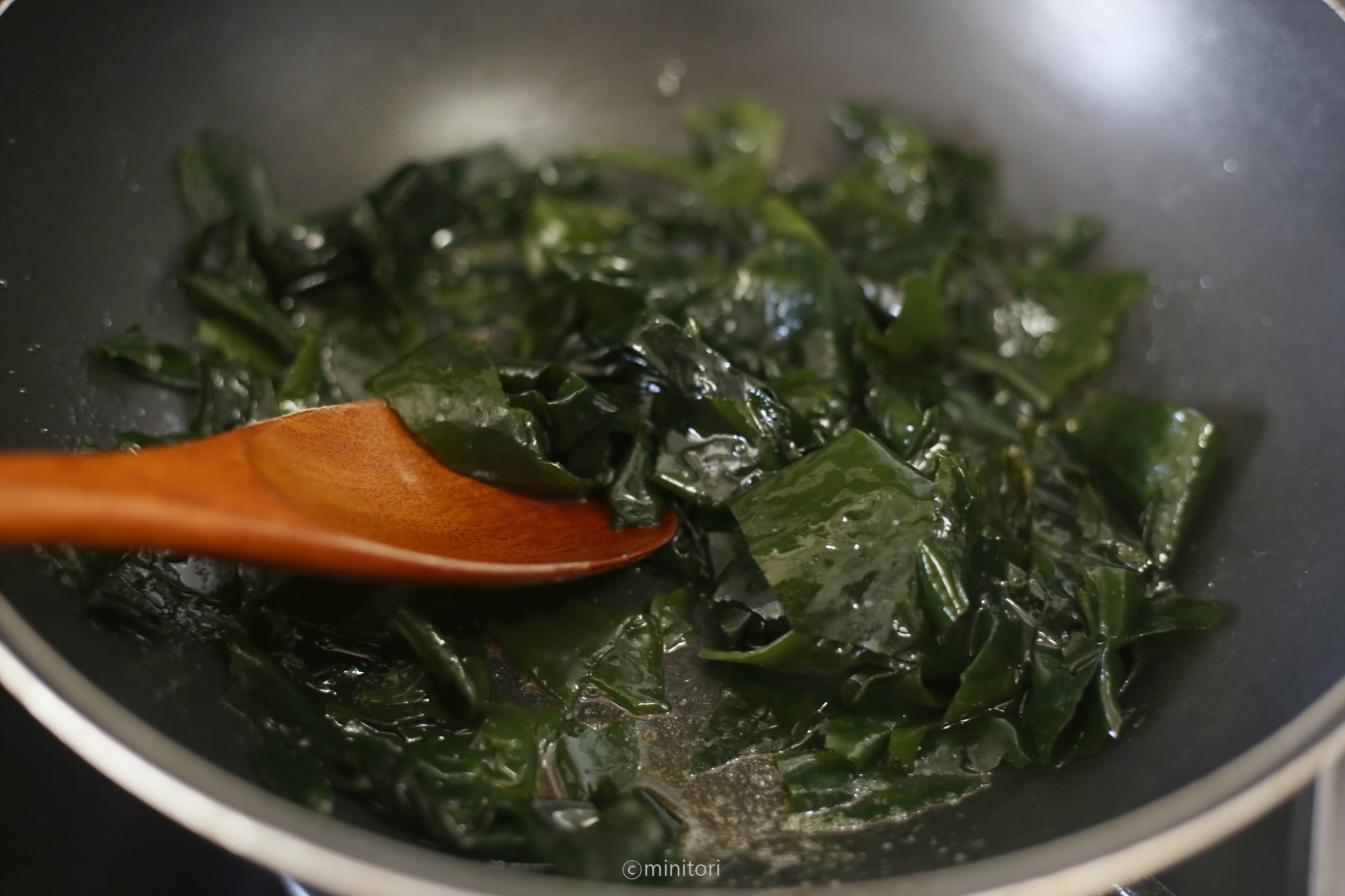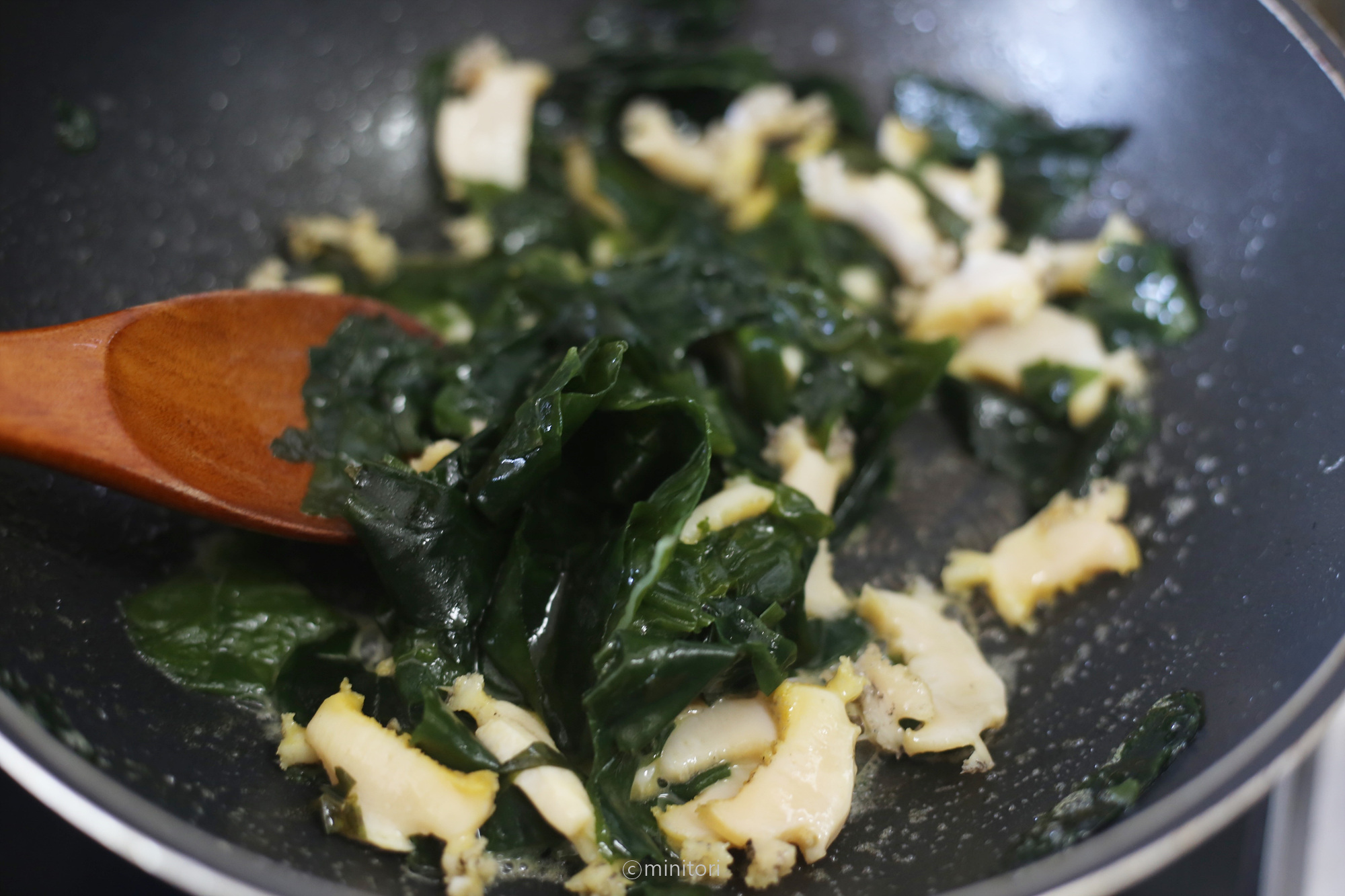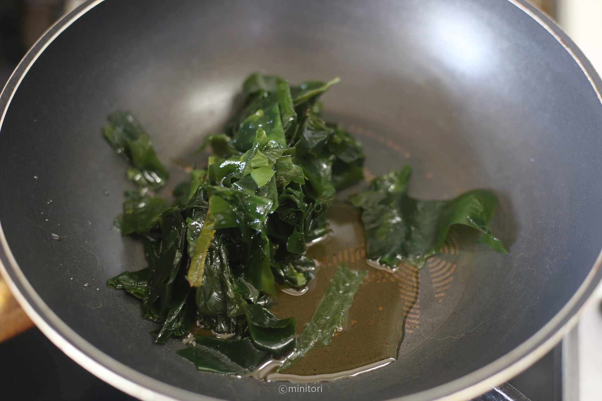 12. 냄비에 들기름을 두르고 미역을 넣어 중약불에서 1~2분정도 볶아주세요.