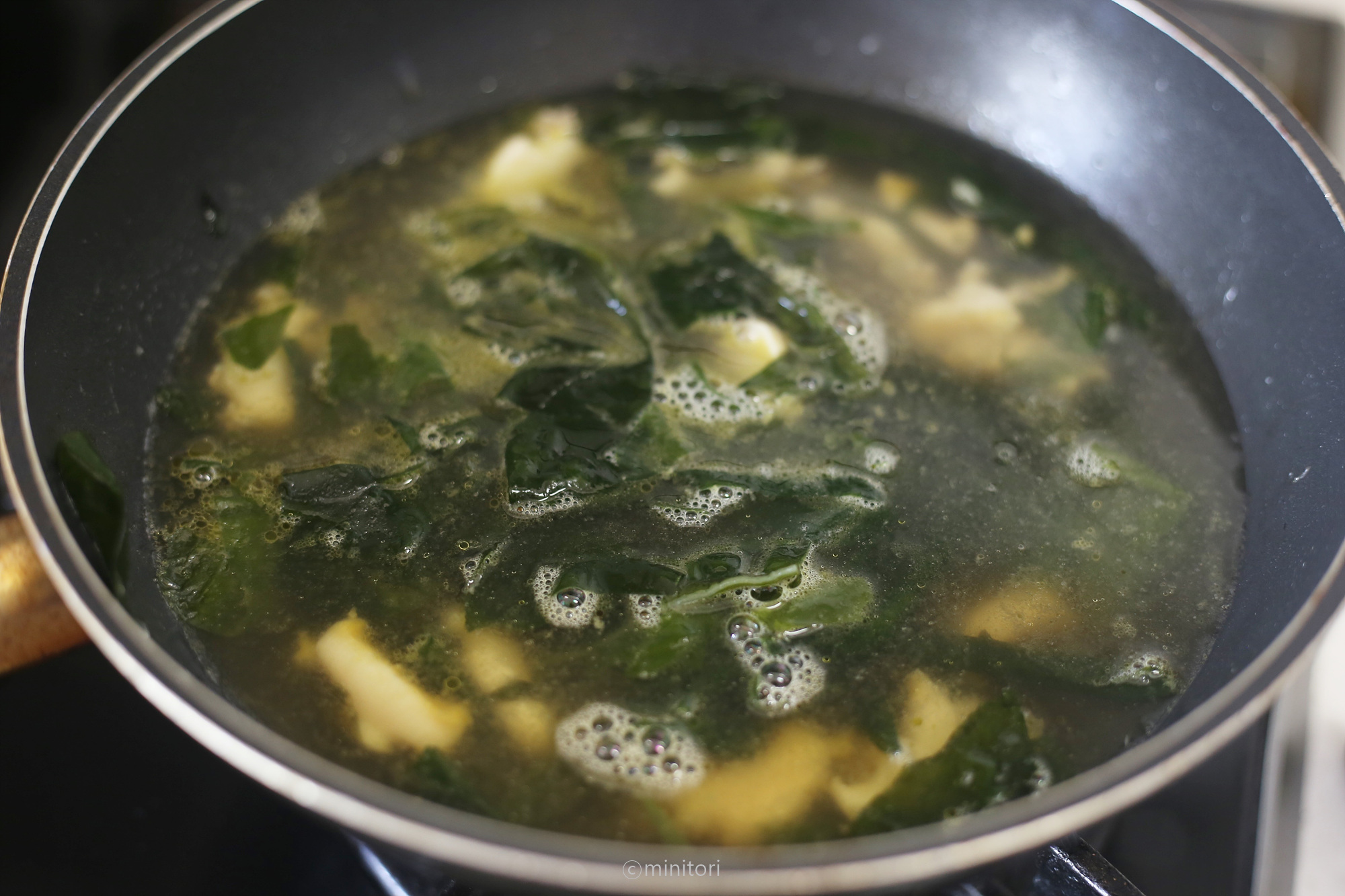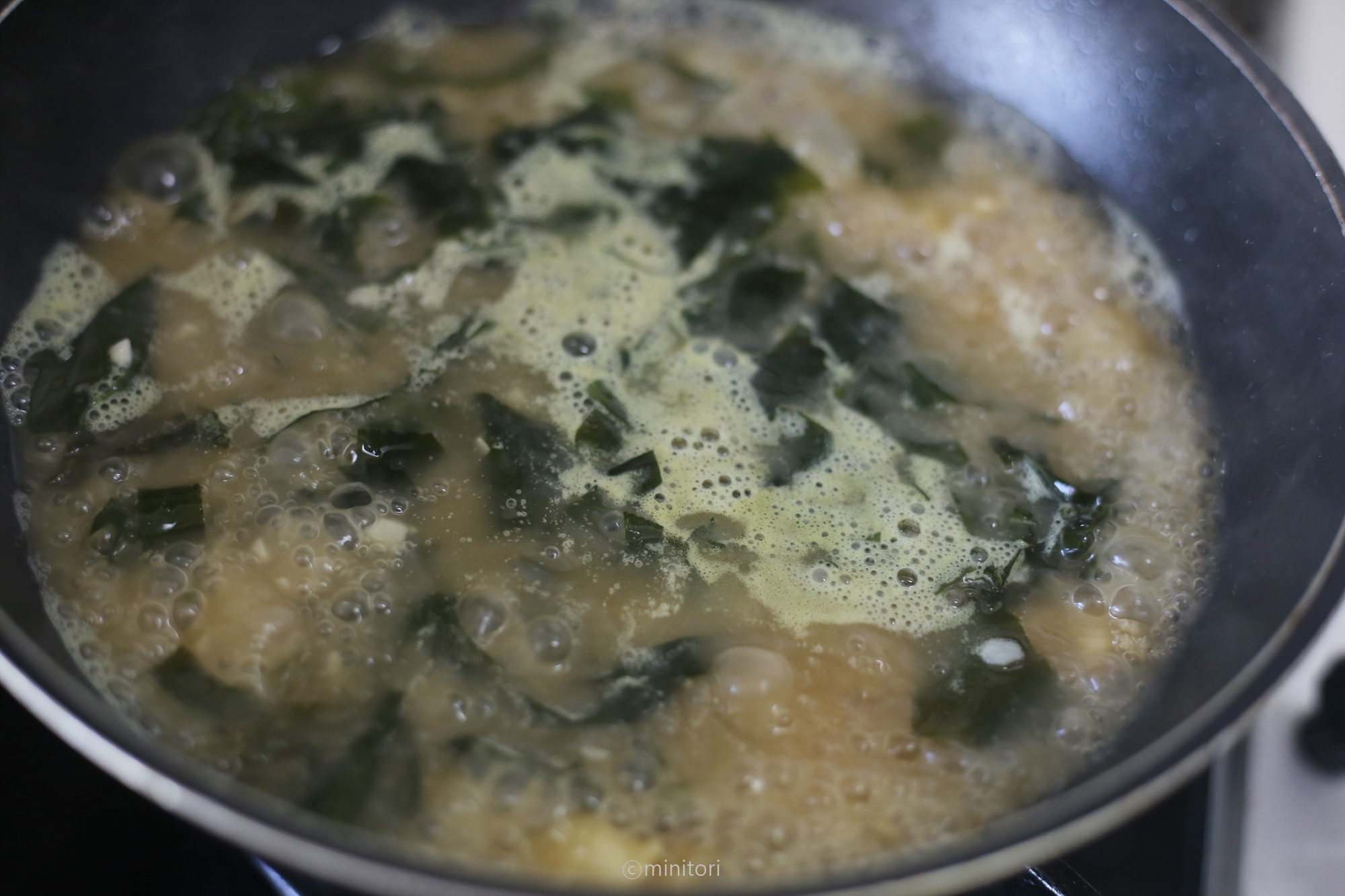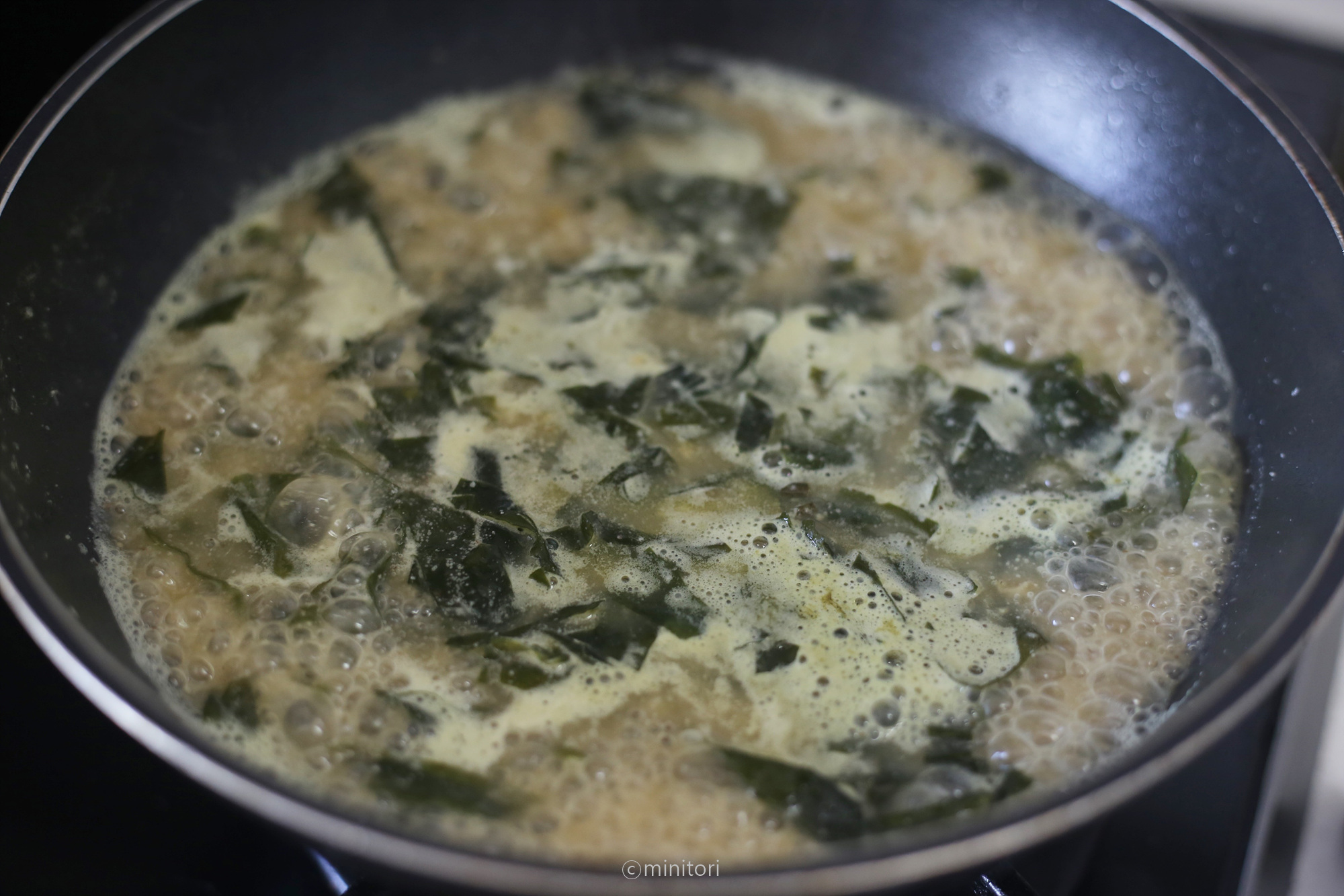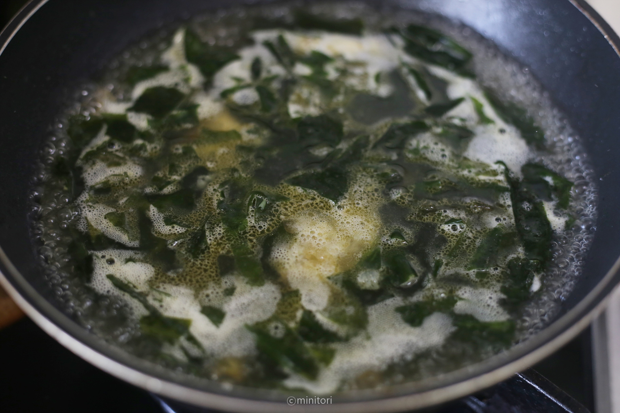12. 냄비에 들기름을 두르고 미역을 넣어 중약불에서 1~2분정도 볶아주세요.