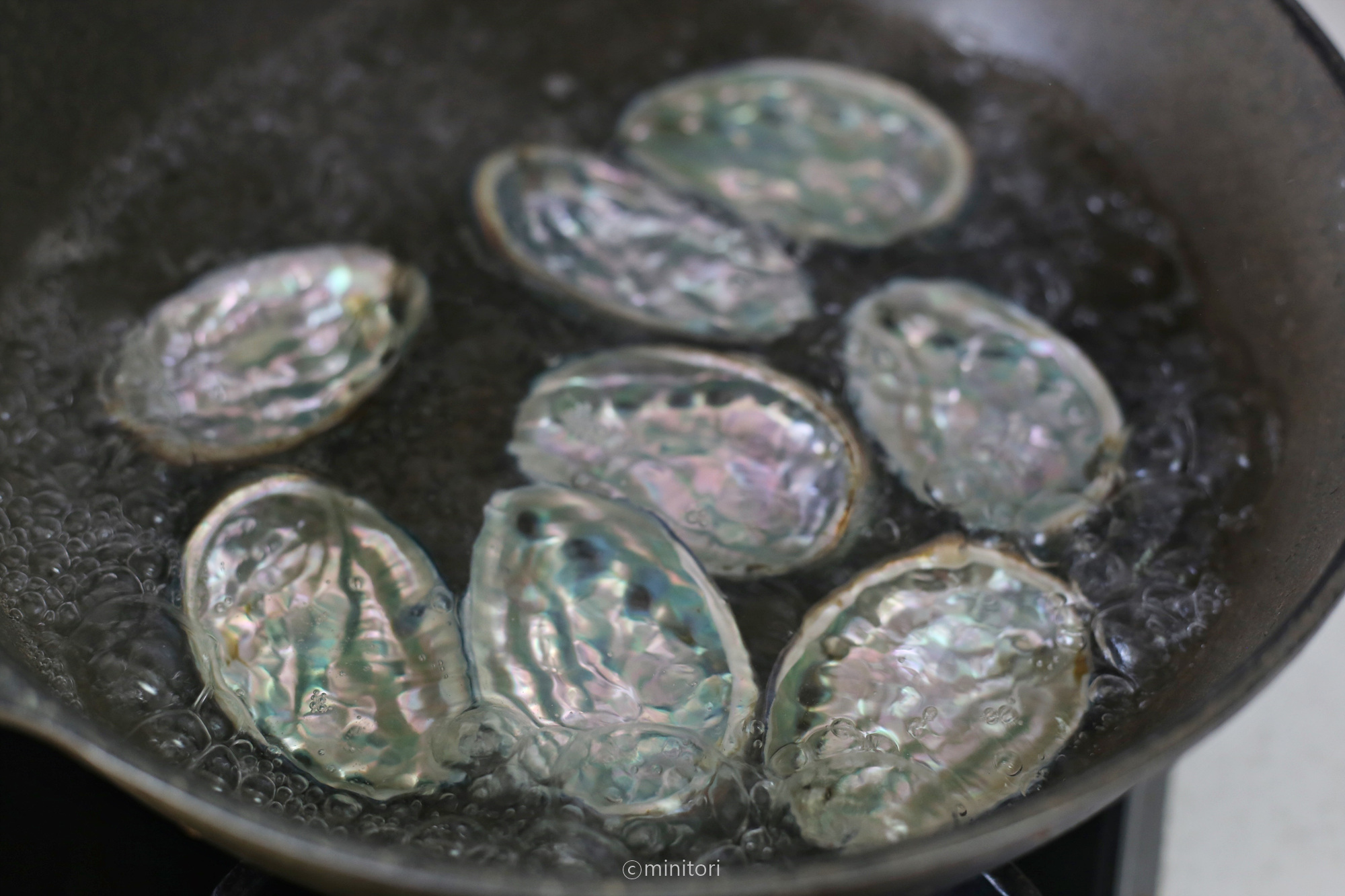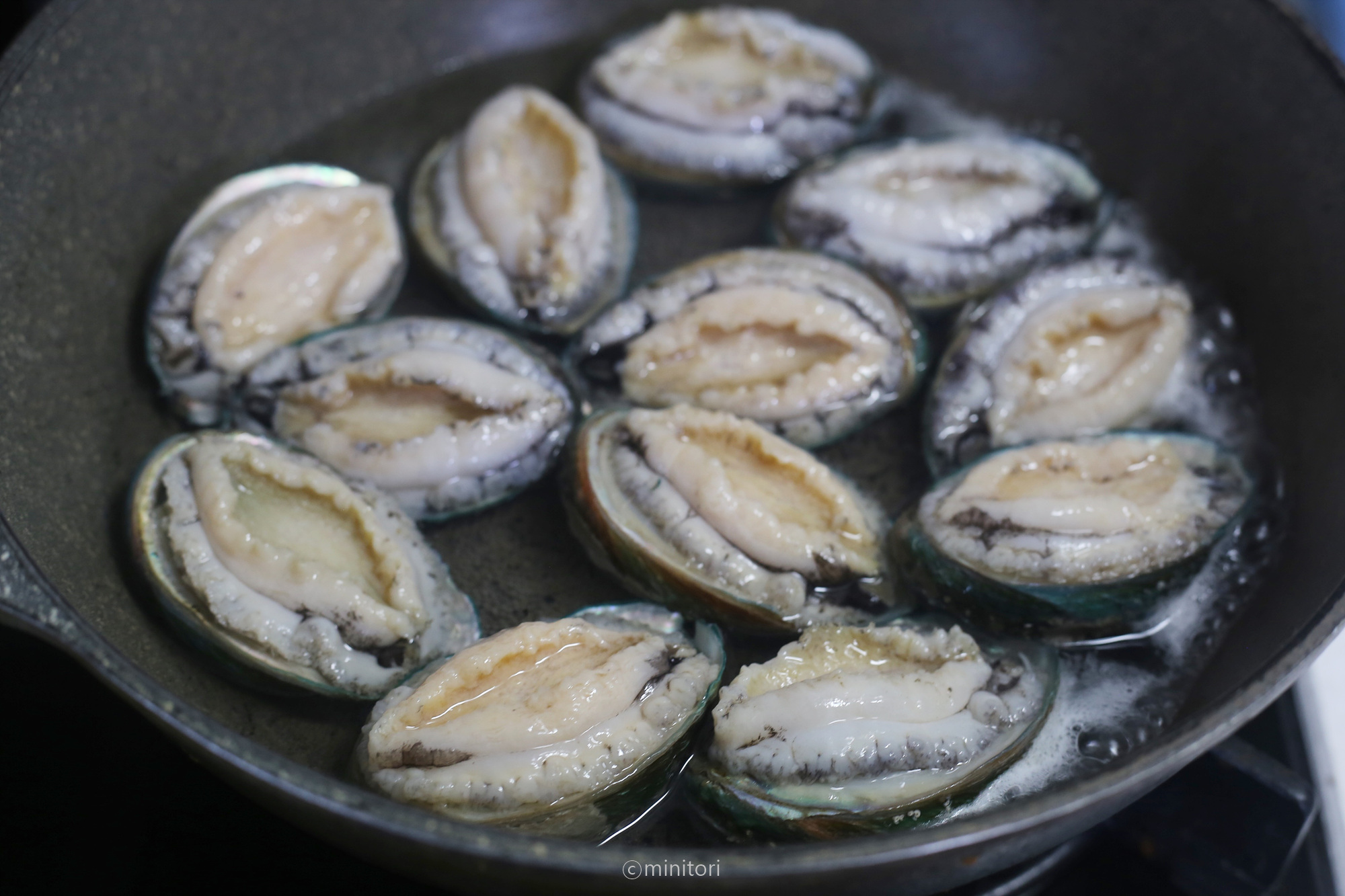 2. 넓은팬 또는 냄비에 전복껍데기만 잠길 정도로 물을 넣어 끓인 후 끓는물에 전복을 30초정도 담갔다가 건져냅니다. (끓는물에 살짝 데치면 전복 껍데기를 쉽게 분리할 수 있어요.