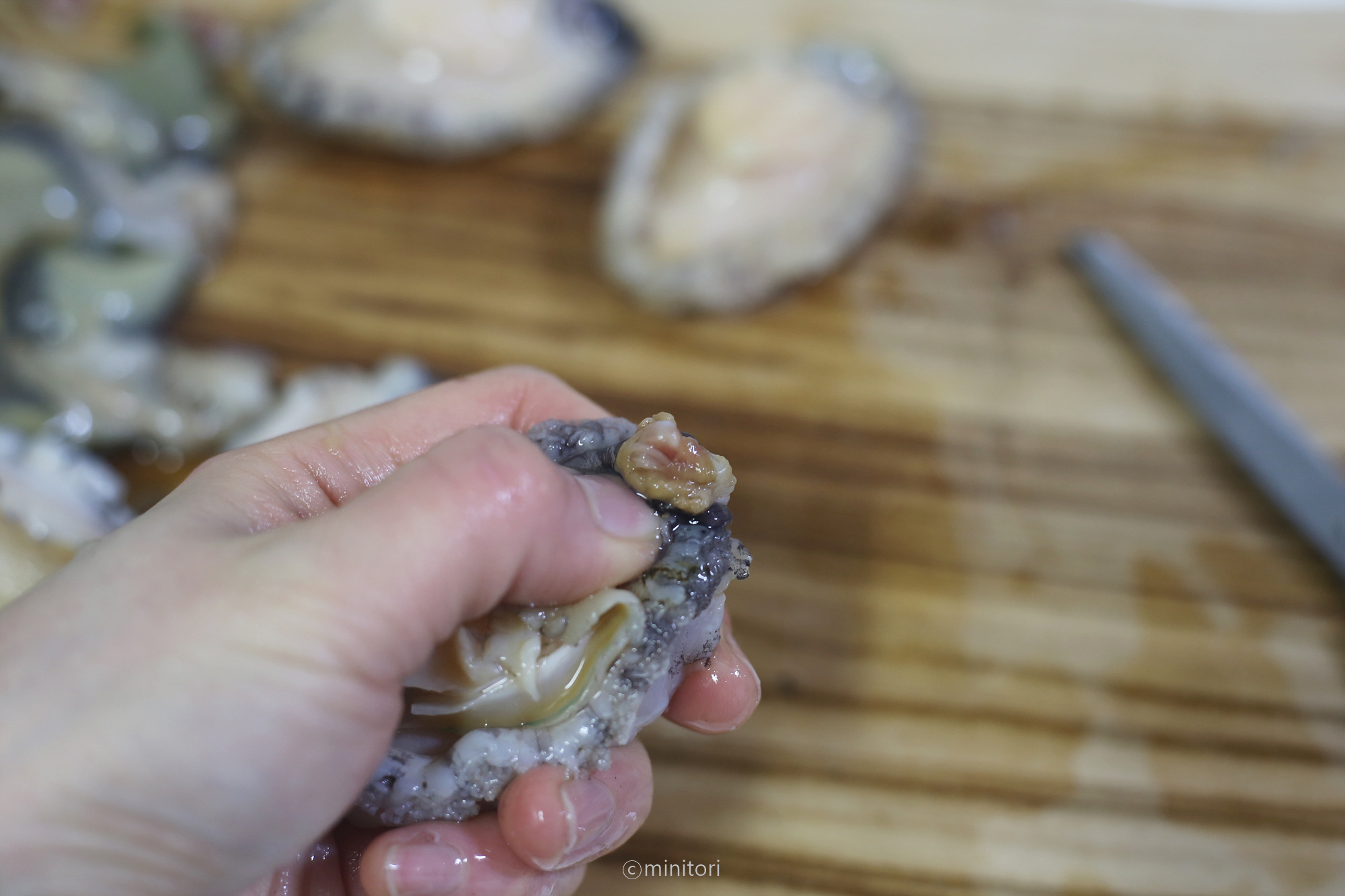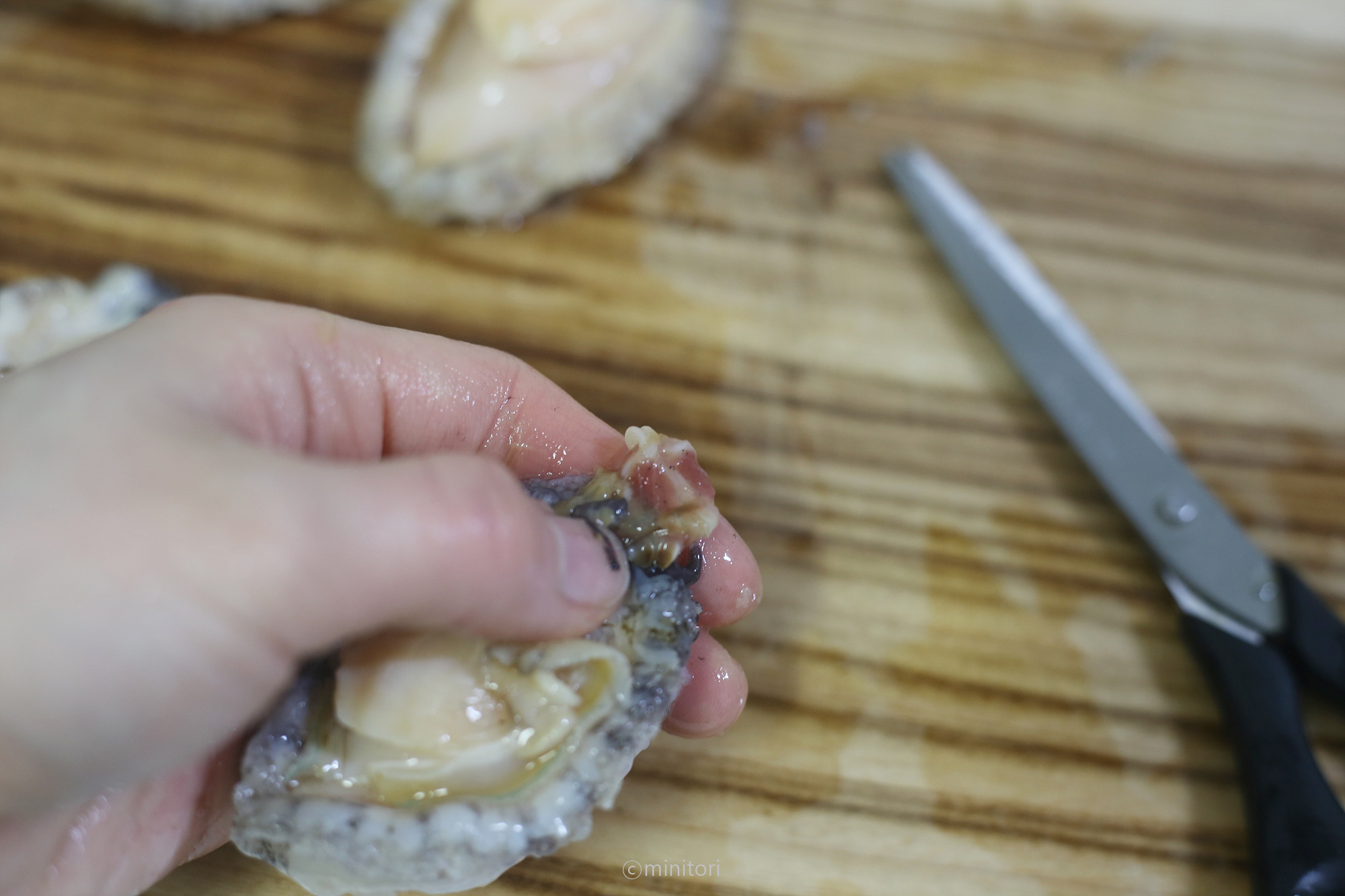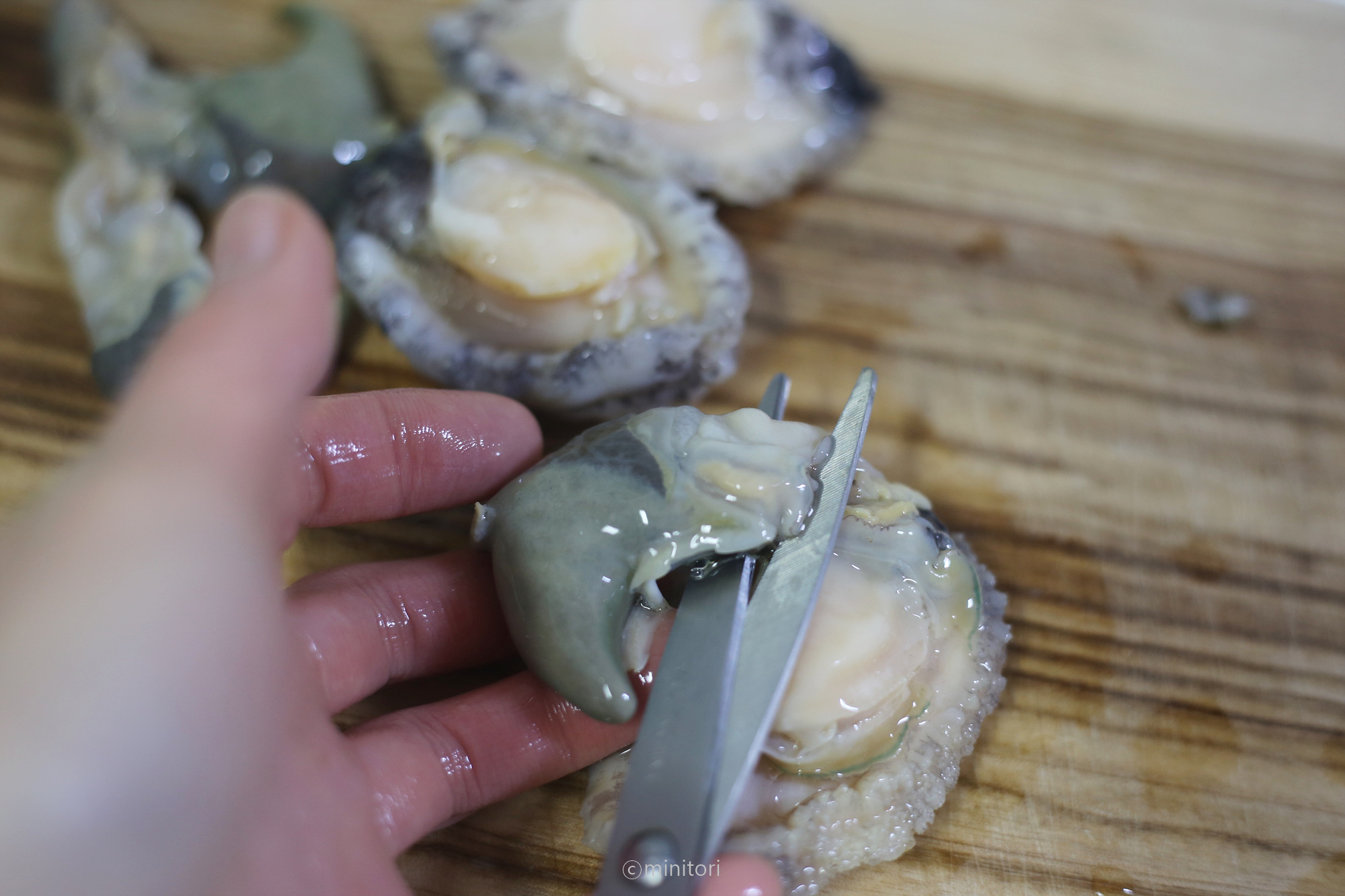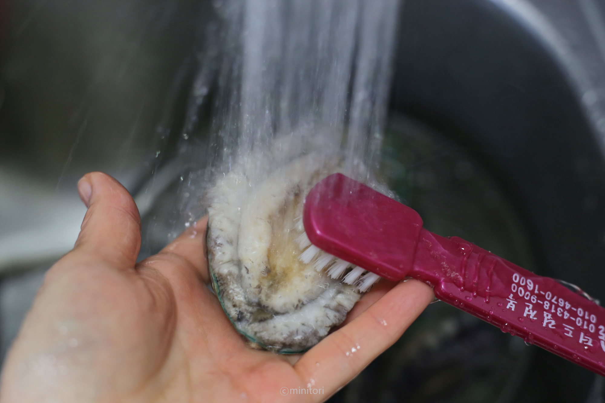 1. 부드러운 솔로 전복의 살과 가장자리에 있는 이물질을 박박 문질러 제거해주세요.