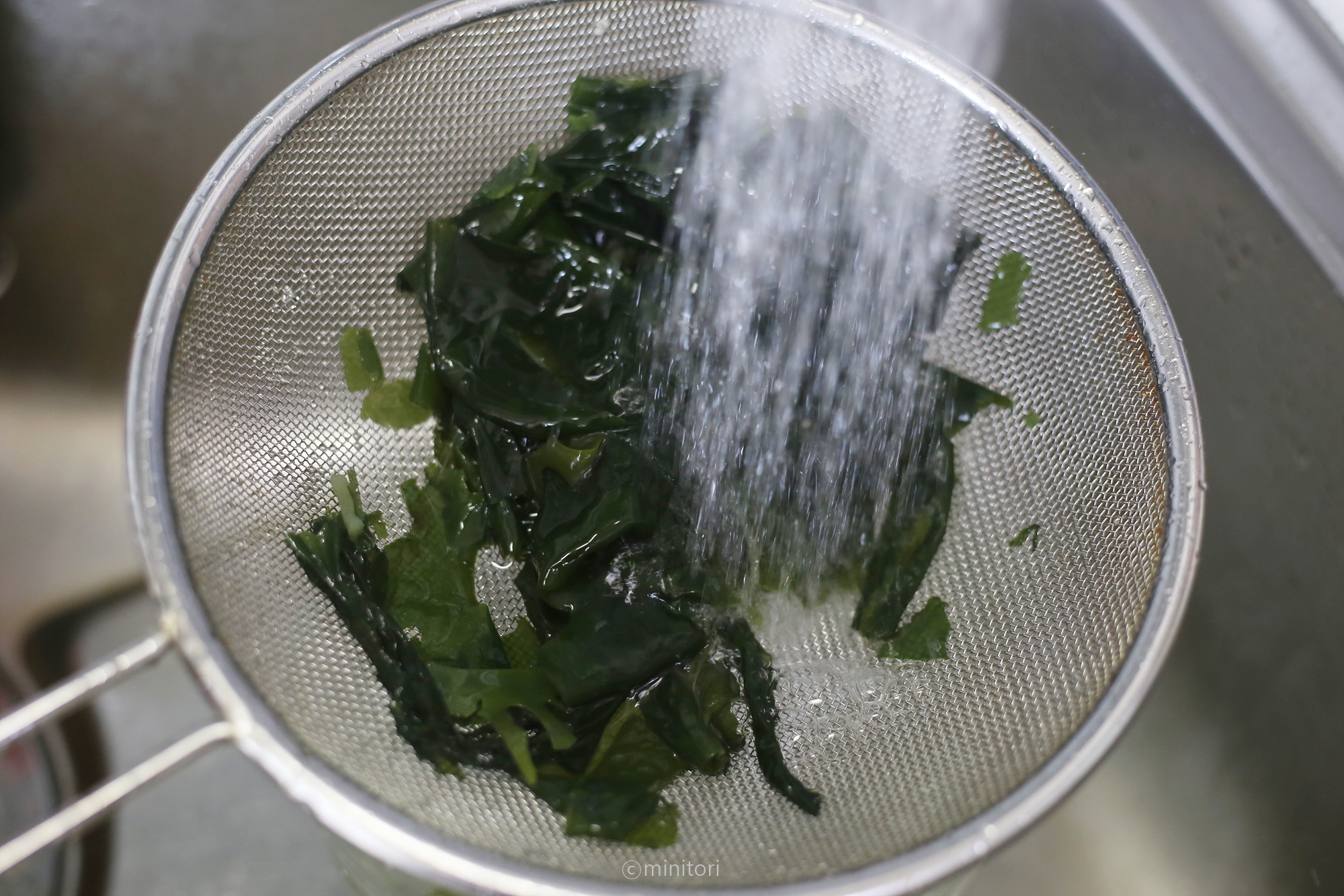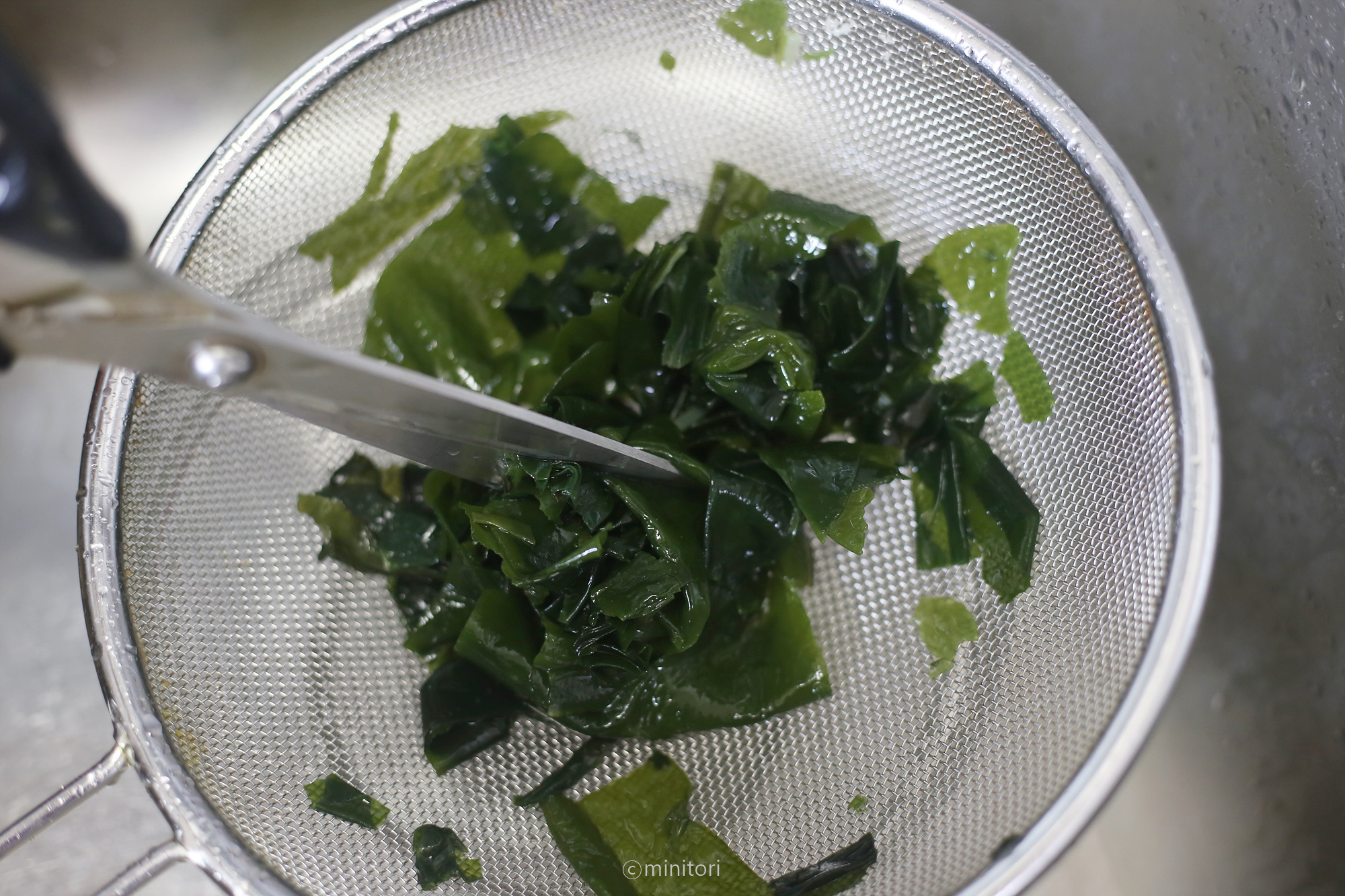 10. 불린 미역을 체에 밭쳐 깨끗이 씻고 가위나 칼로 아기가 먹기 좋은 크기로 잘라주세요.