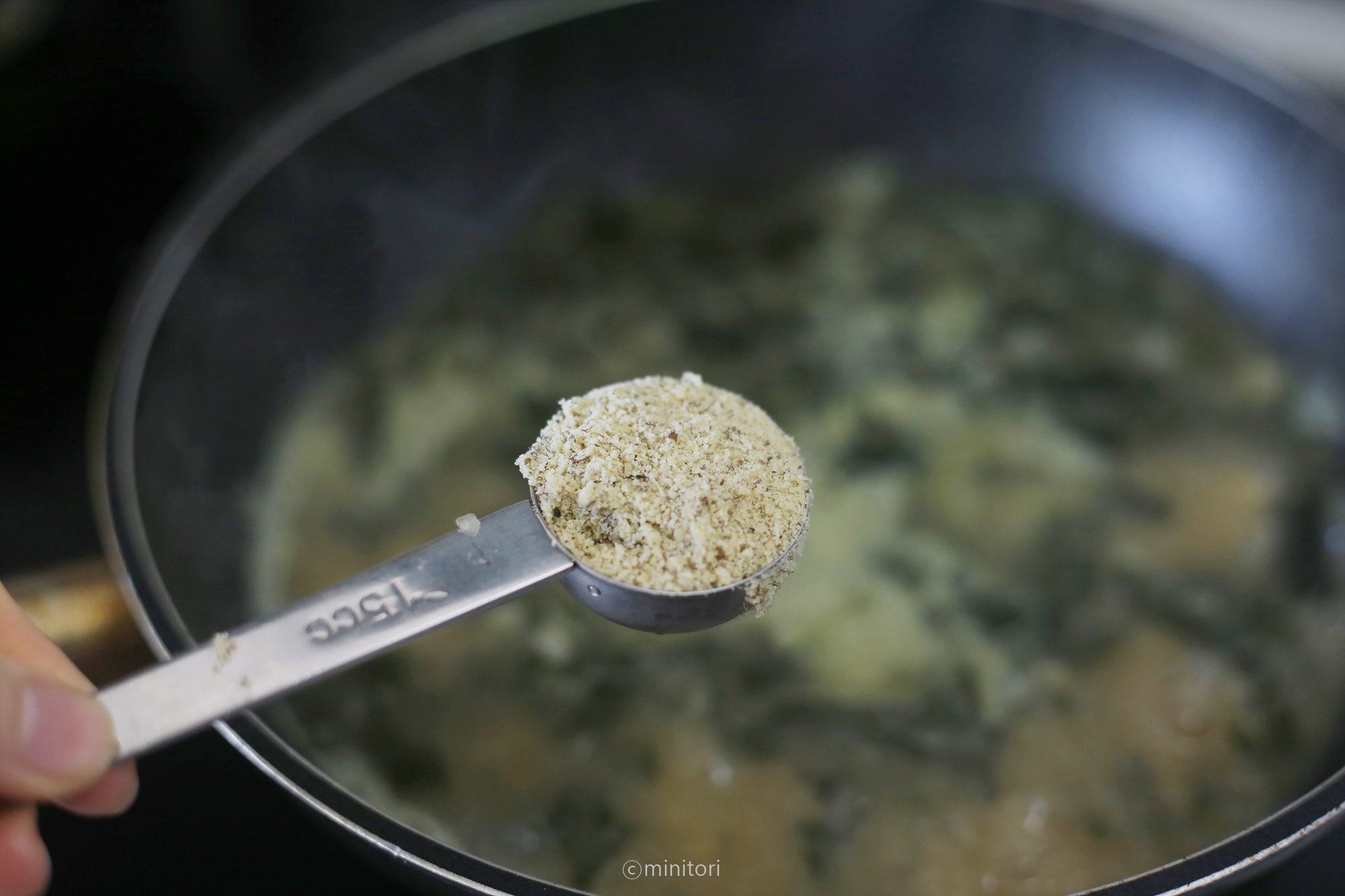 17. 마무리로 들깨가루를 넣고 섞어줍니다. 2~3분정도 더 끓인 뒤 불을 끕니다.