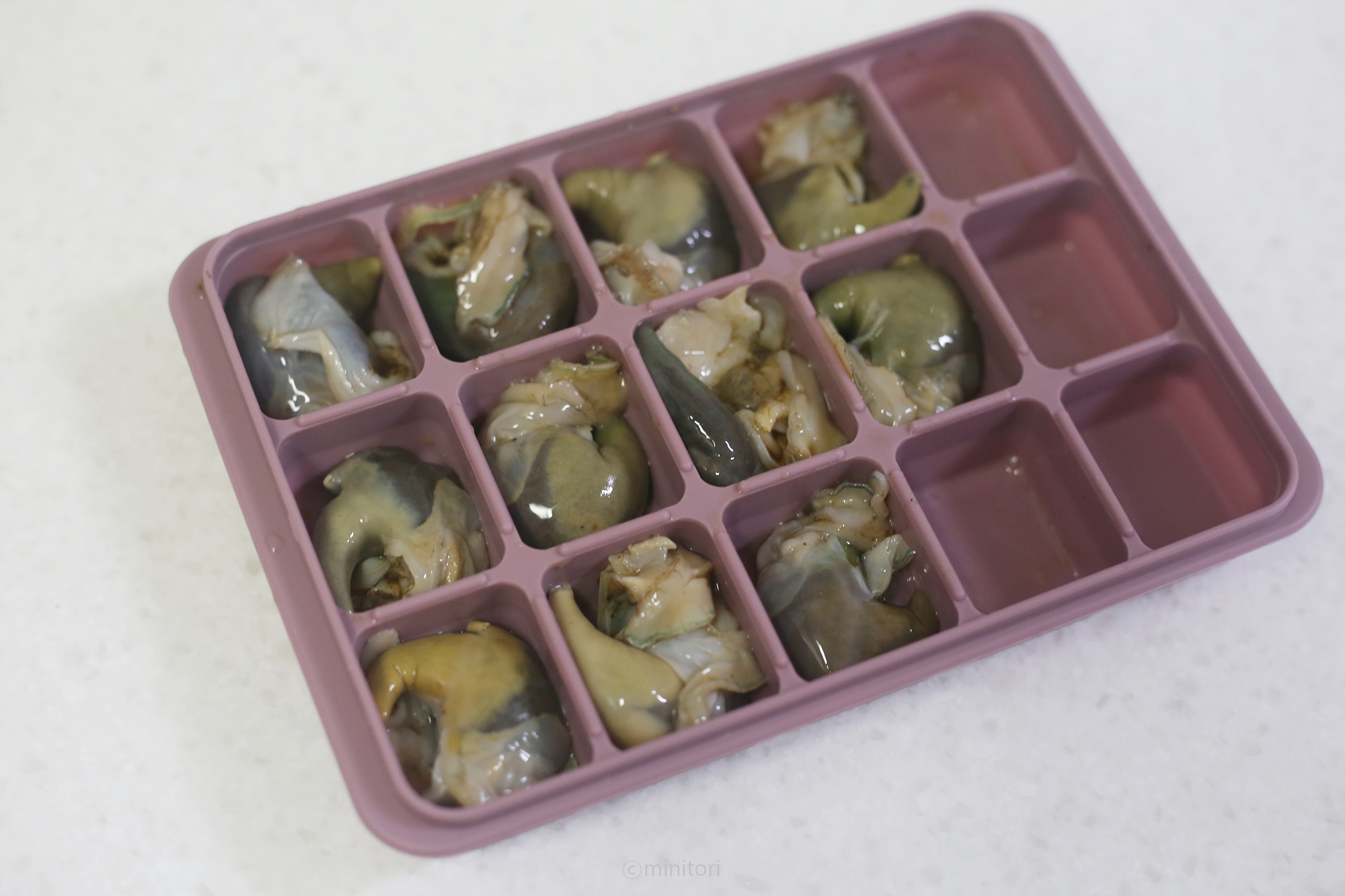 7. 싱싱한 내장은 해동해두면 죽이나 볶음밥, 솥밥 등 다양한 요리에 활용할 수 있어요. 얼음틀이나 이유식큐브에 하나씩 담아 냉동하고 딱딱하게 얼었을때 지퍼백이나 밀폐용기에 옮겨 담아 다시 냉동하면 하나하나 잘 떨어져서 필요한 만큼 해동해서 사용하기 좋아요.
