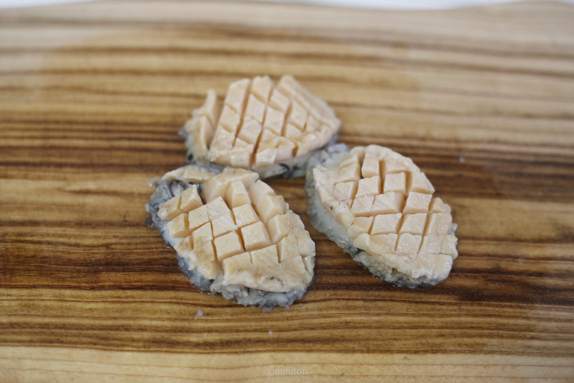 1. 손질한 전복에 격자무늬로 칼집을 넣어주세요. (칼집을 깊게 내면 모양이 더 예쁘게 잡혀요)
