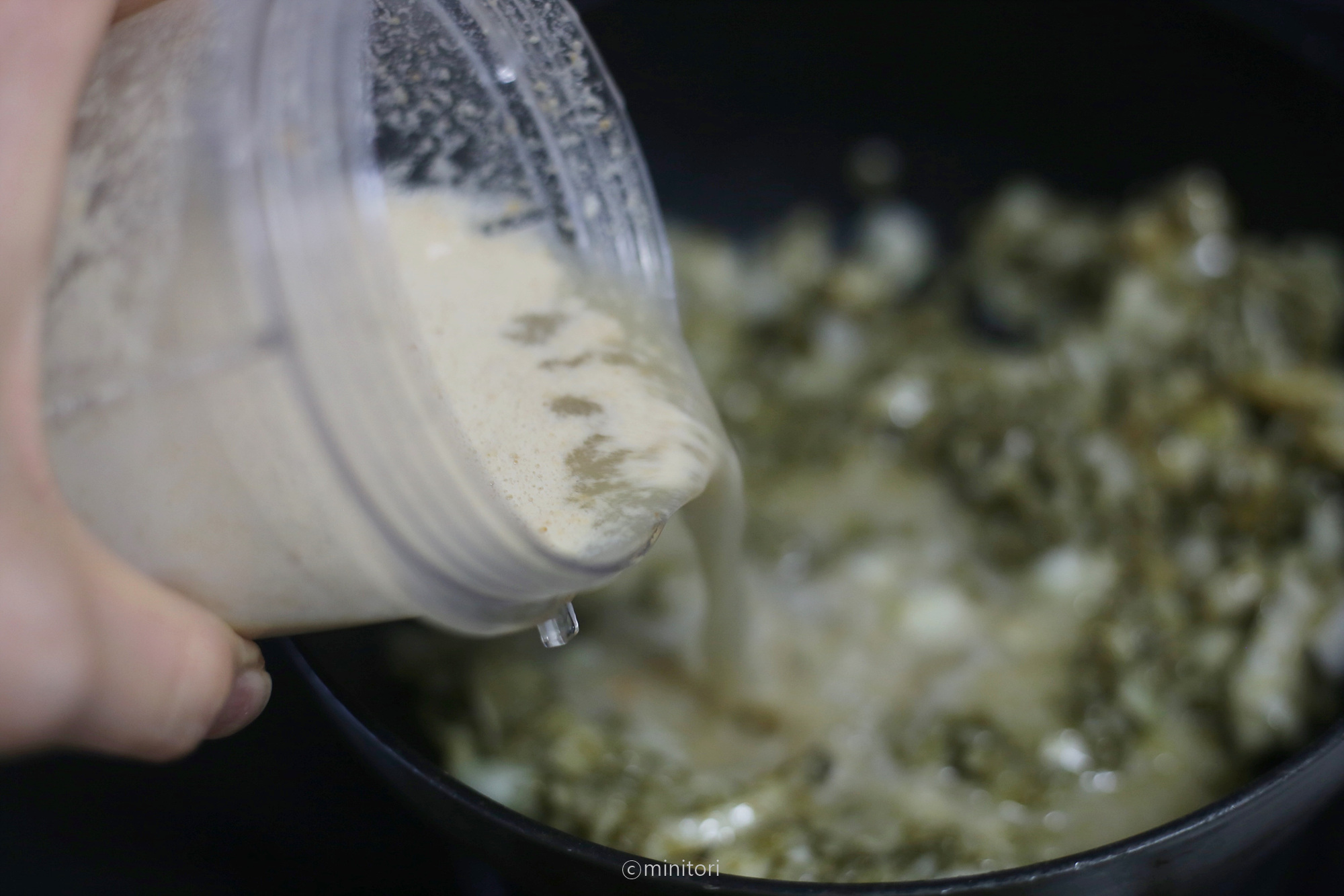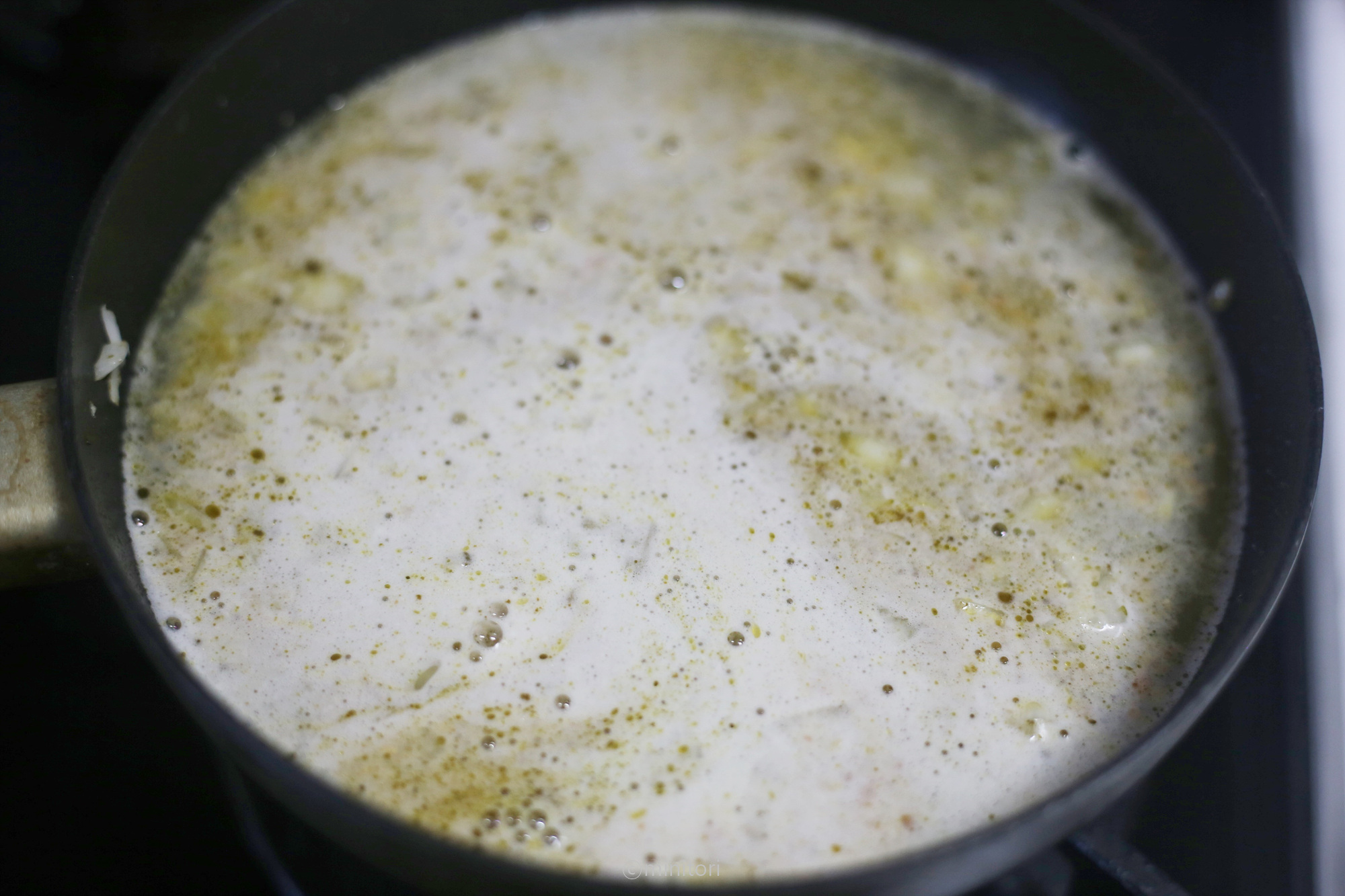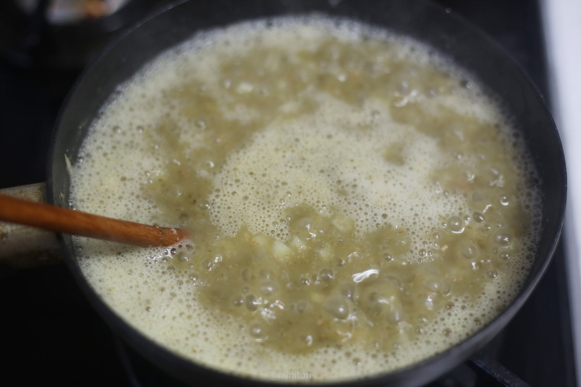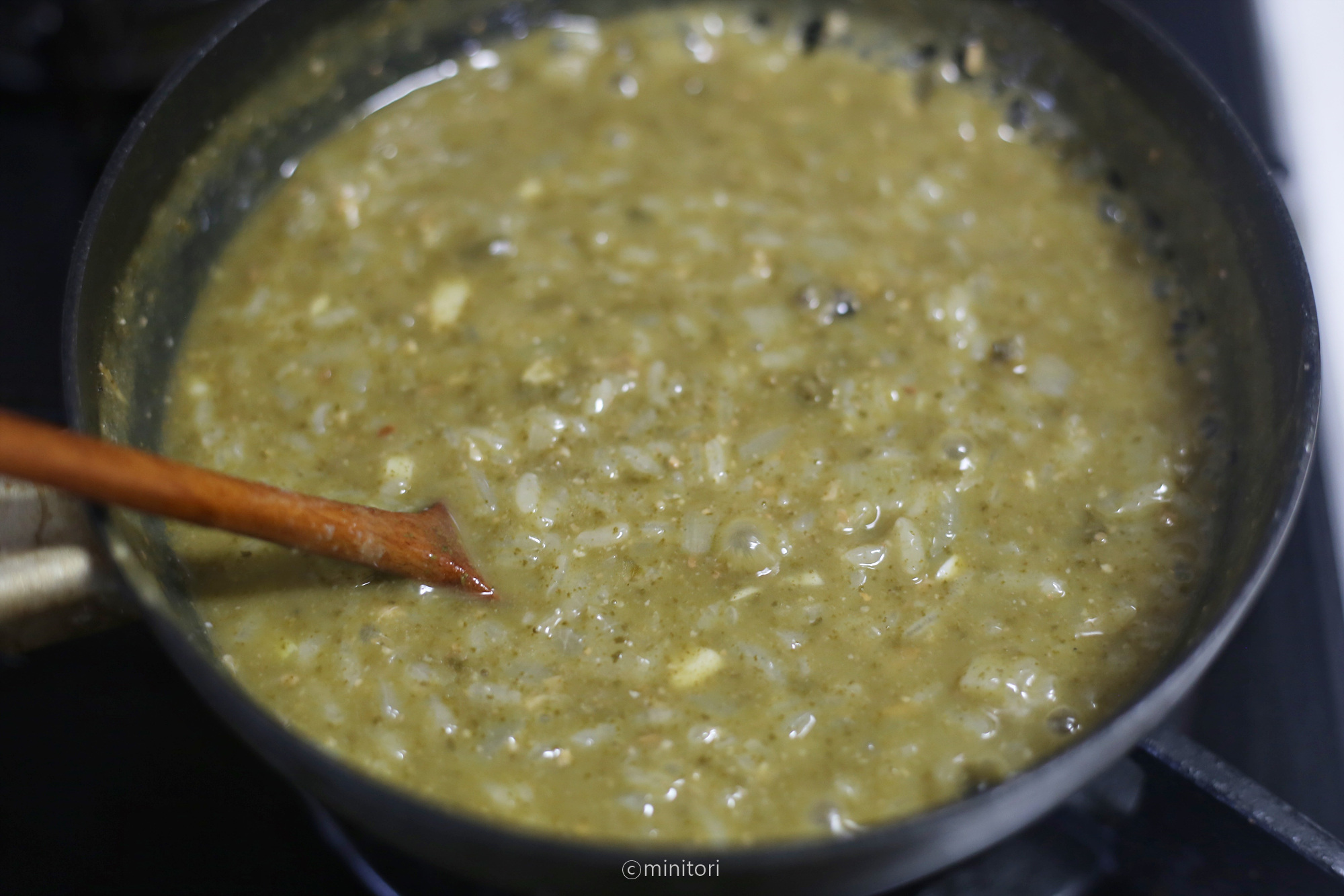 10. 쌀알이 투명해지면 믹서에 갈아놓은 잣+채수와 물을 부어 센불에서 끓여주세요.