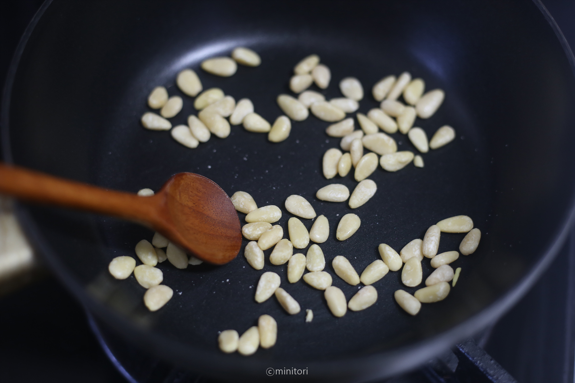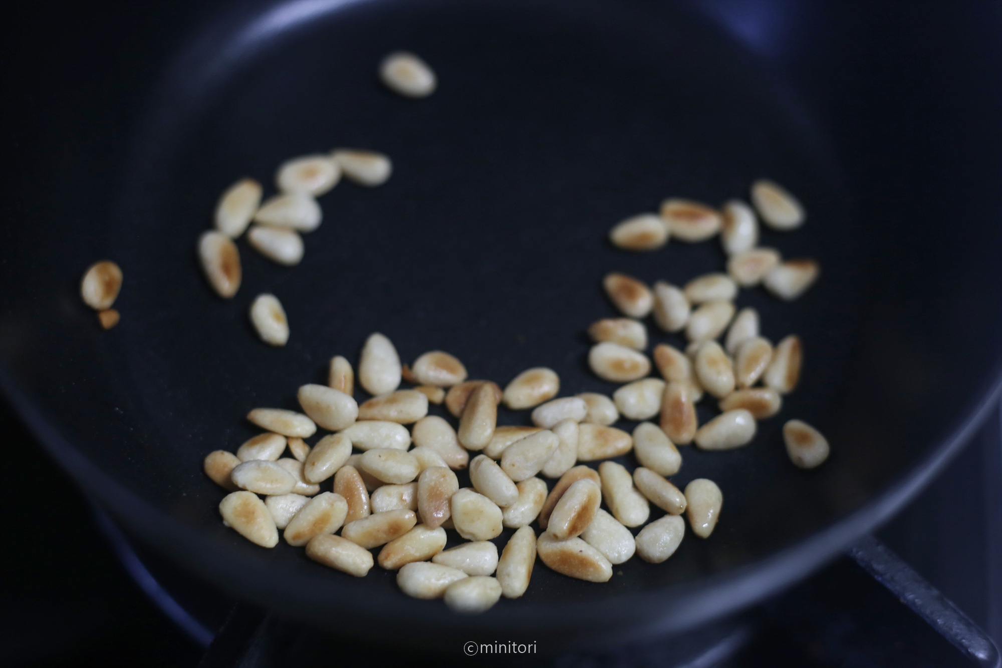 2. 마른팬에 잣을 넣고 약불에서 타지 않게 노릇하게 볶고 한김 식혀주세요.