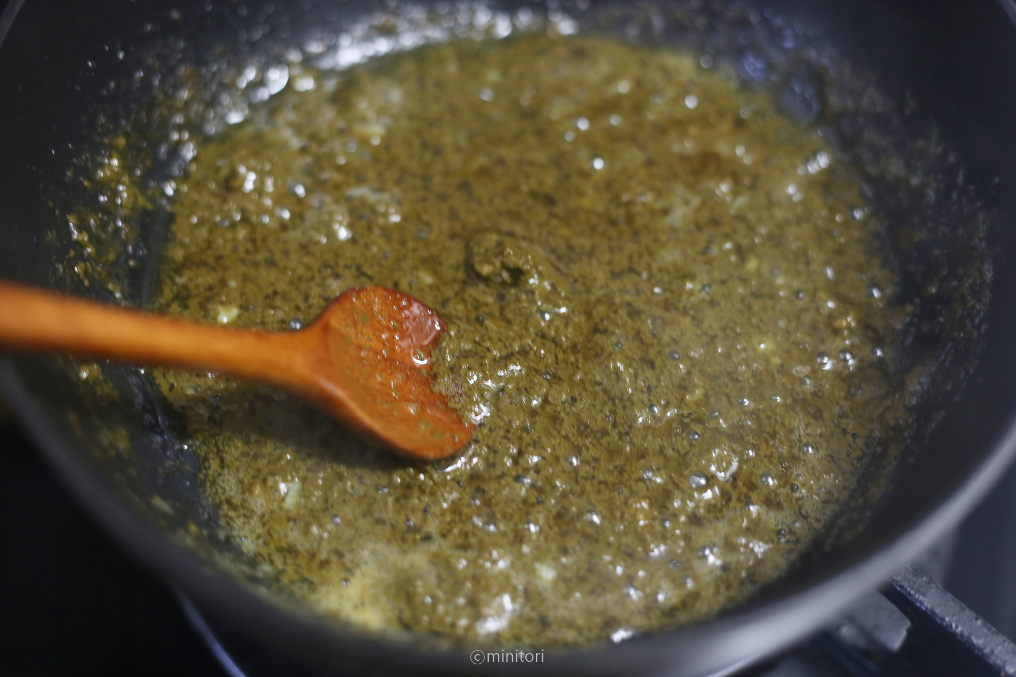 7. 냄비에 참기름을 두르고 믹서에 갈은 내장 다진마늘을 넣고 중약불에서 타지 않게 볶아주세요. 3~4분정도 충분히 볶아주어야 비리지 않아요.