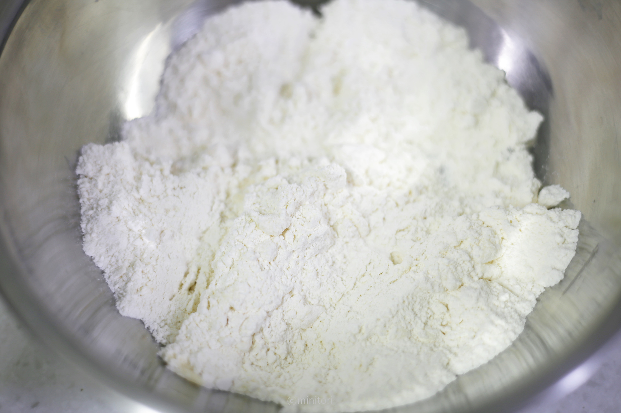5. 다른볼에 박력분, 차가운 무염버터, 분유가루, 베이킹파우더를 넣고 스크래퍼로 버터가 쌀알크기가 될때까지 자르면서 가루류와 섞는다.