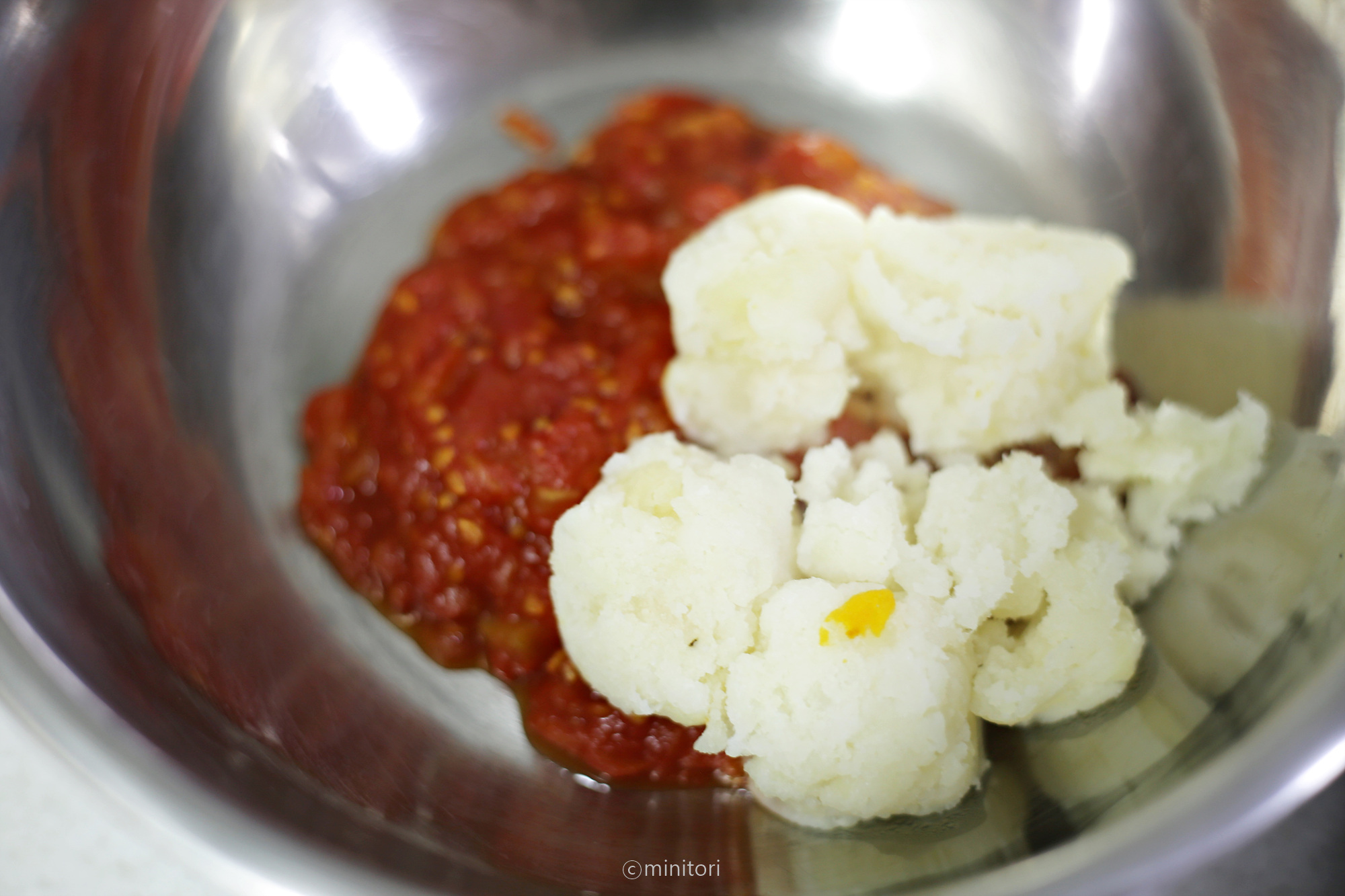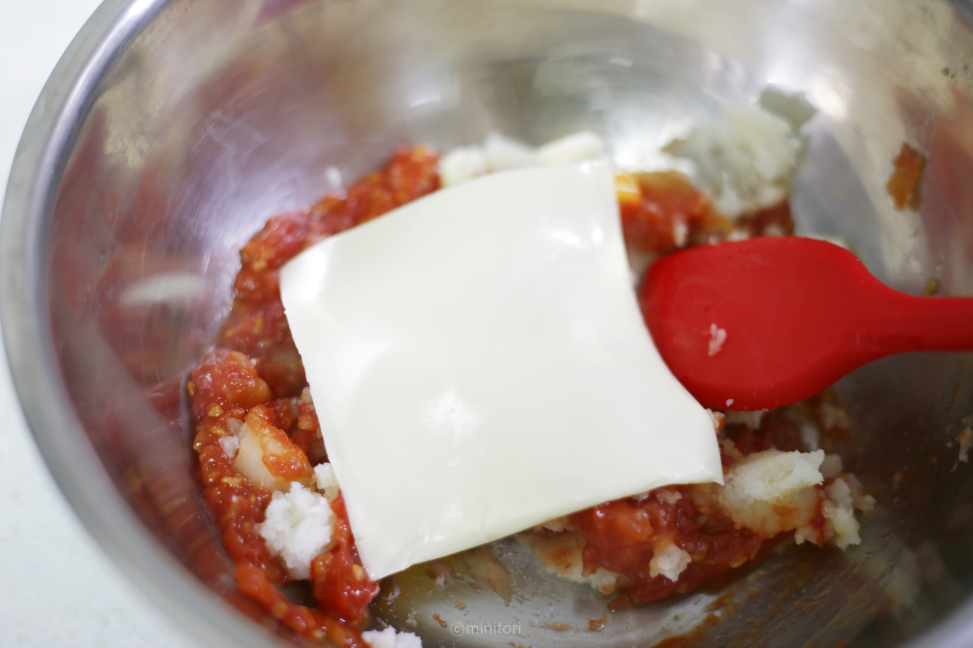 4. 사과즙에 조린 토마토, 삶아서 으깬감자, 아기치즈 한장을 넣고 감자와 토마토가 뜨거울때 녹이면서 섞고 그대로 두어 차게 식힌다.