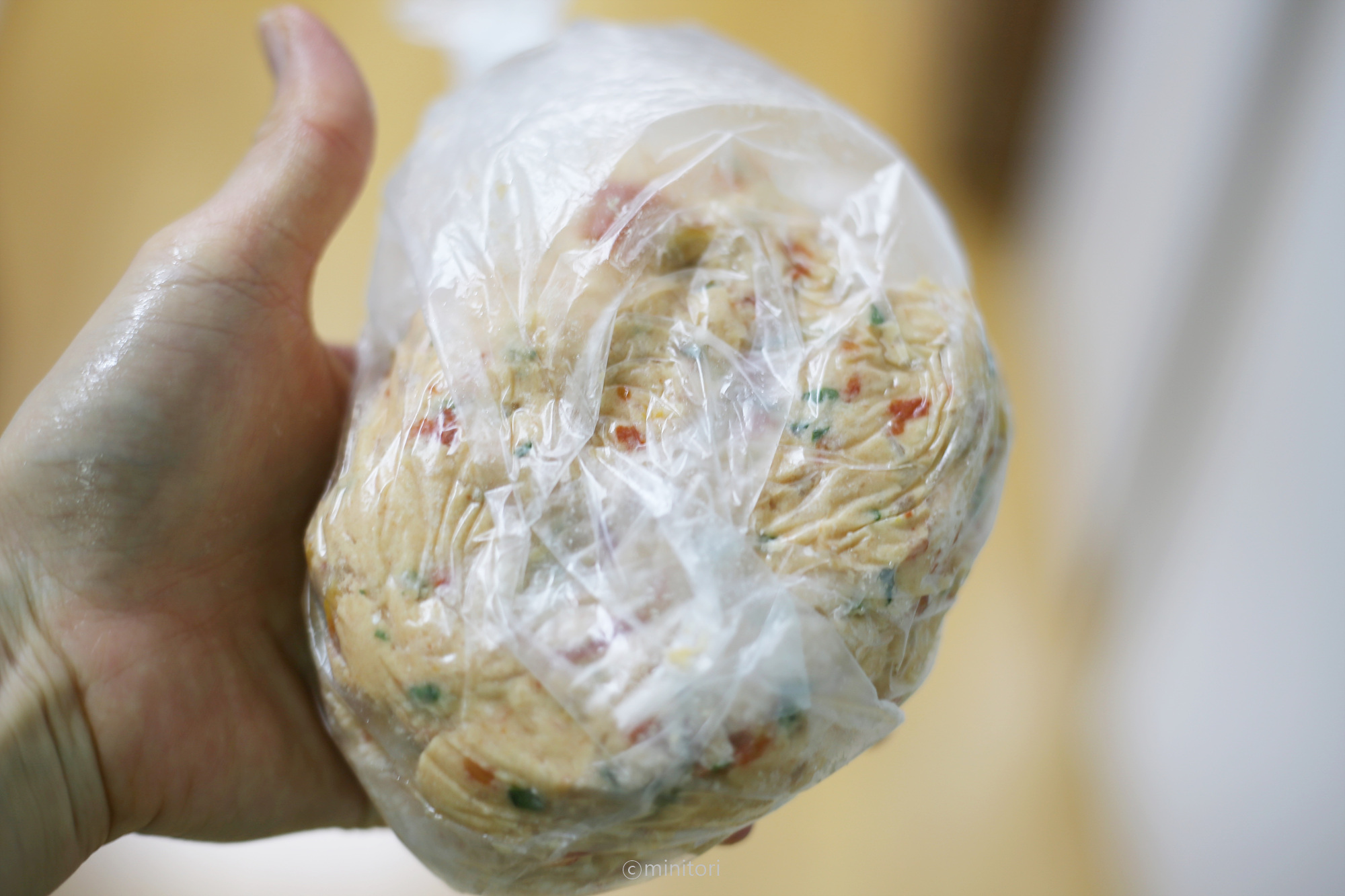 9. 덧가루를 살짝 뿌려 3절접기 한 뒤 반죽을 비닐에 넣어 1시간정도 냉장휴지한다.