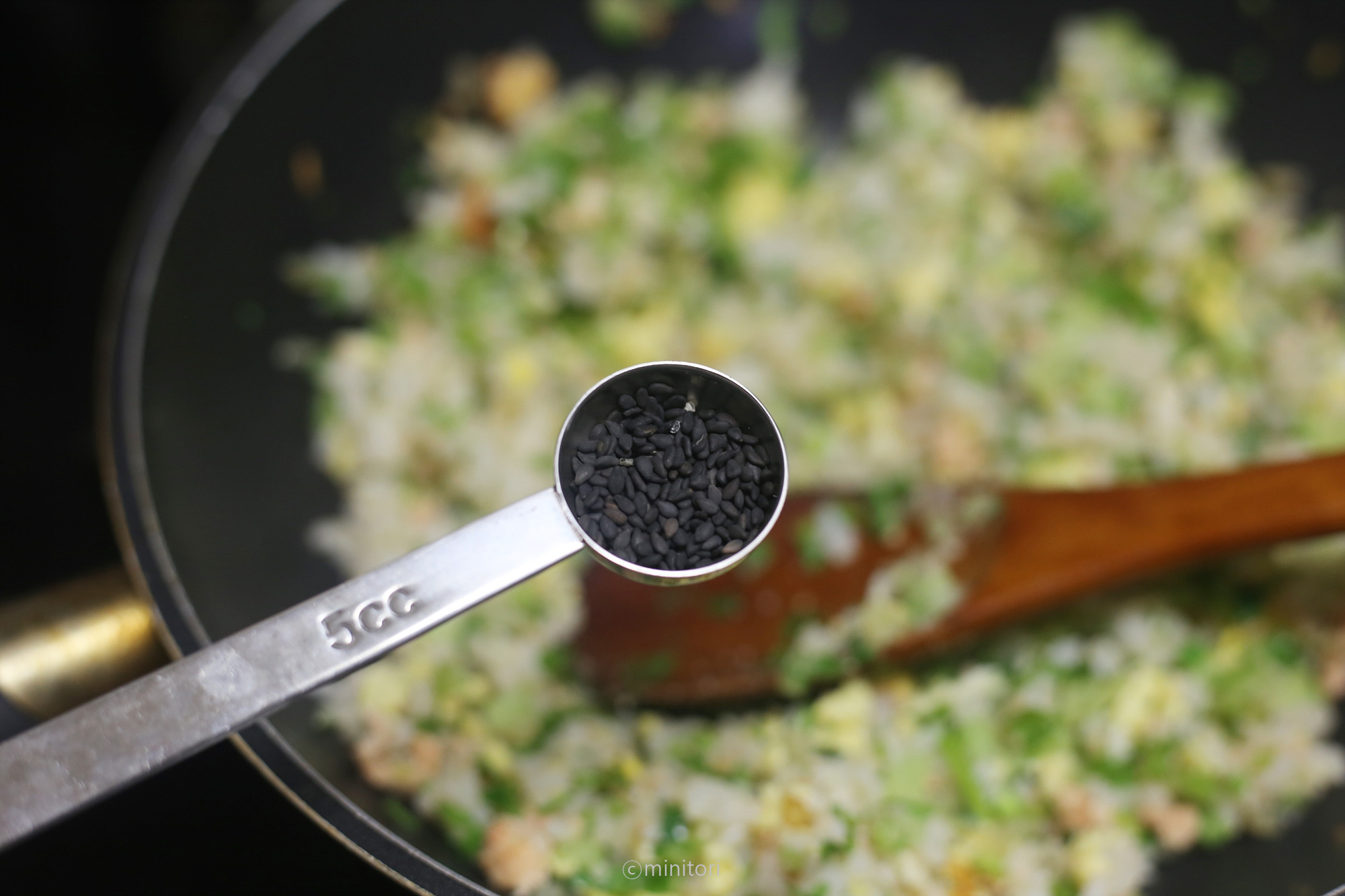 9. 미나리의 숨이 죽으면 검은깨와 참기름을 넣고 센불에 한번더 휘리릭 볶은 뒤 불을 끈다.
