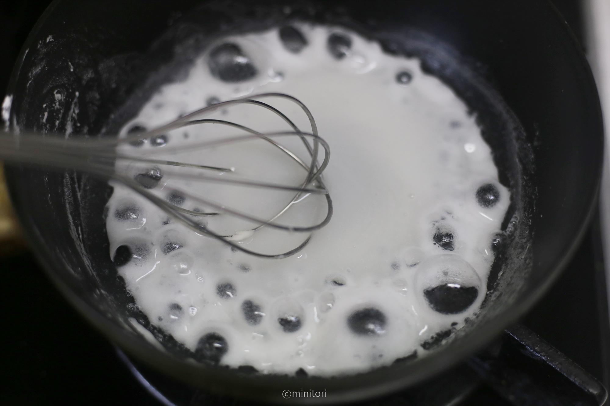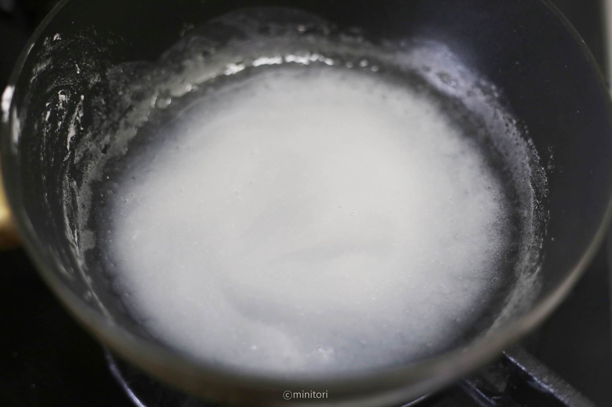 4. 냄비에 분량의 밀가루와 물을 넣고 약한불에서 저어가며 끓입니다. 끓어오르면서 투명한 풀 형태가 되면 불을끄고 식힌다.