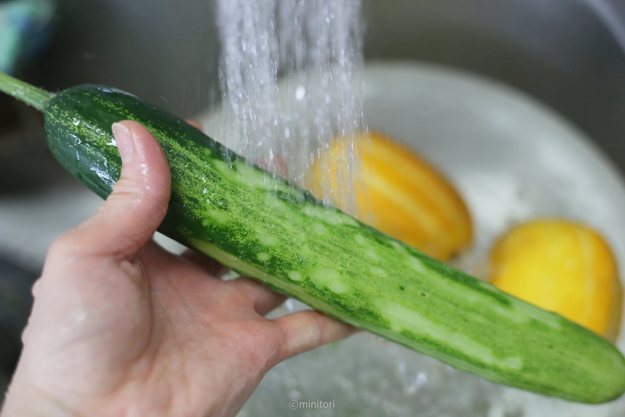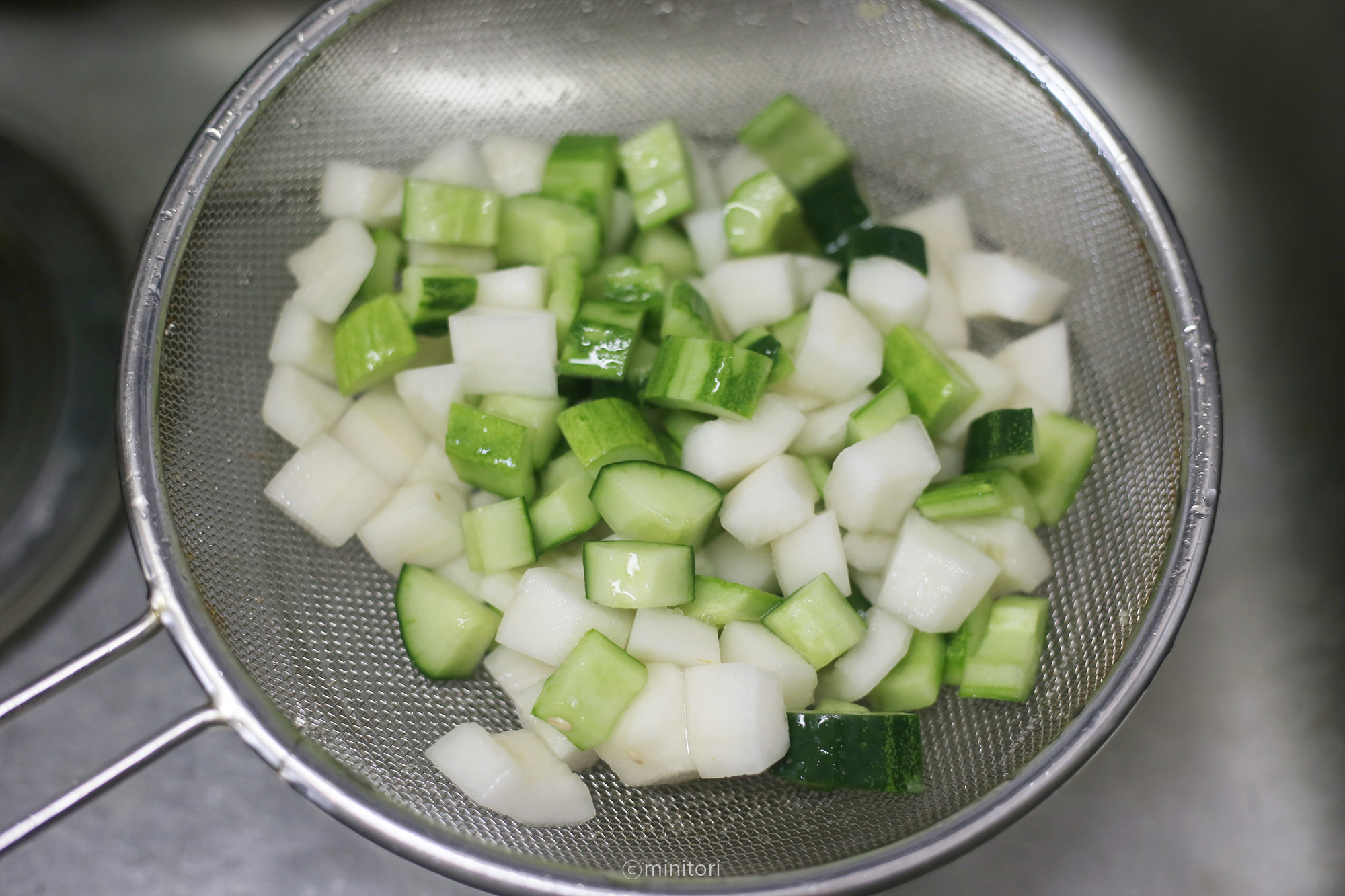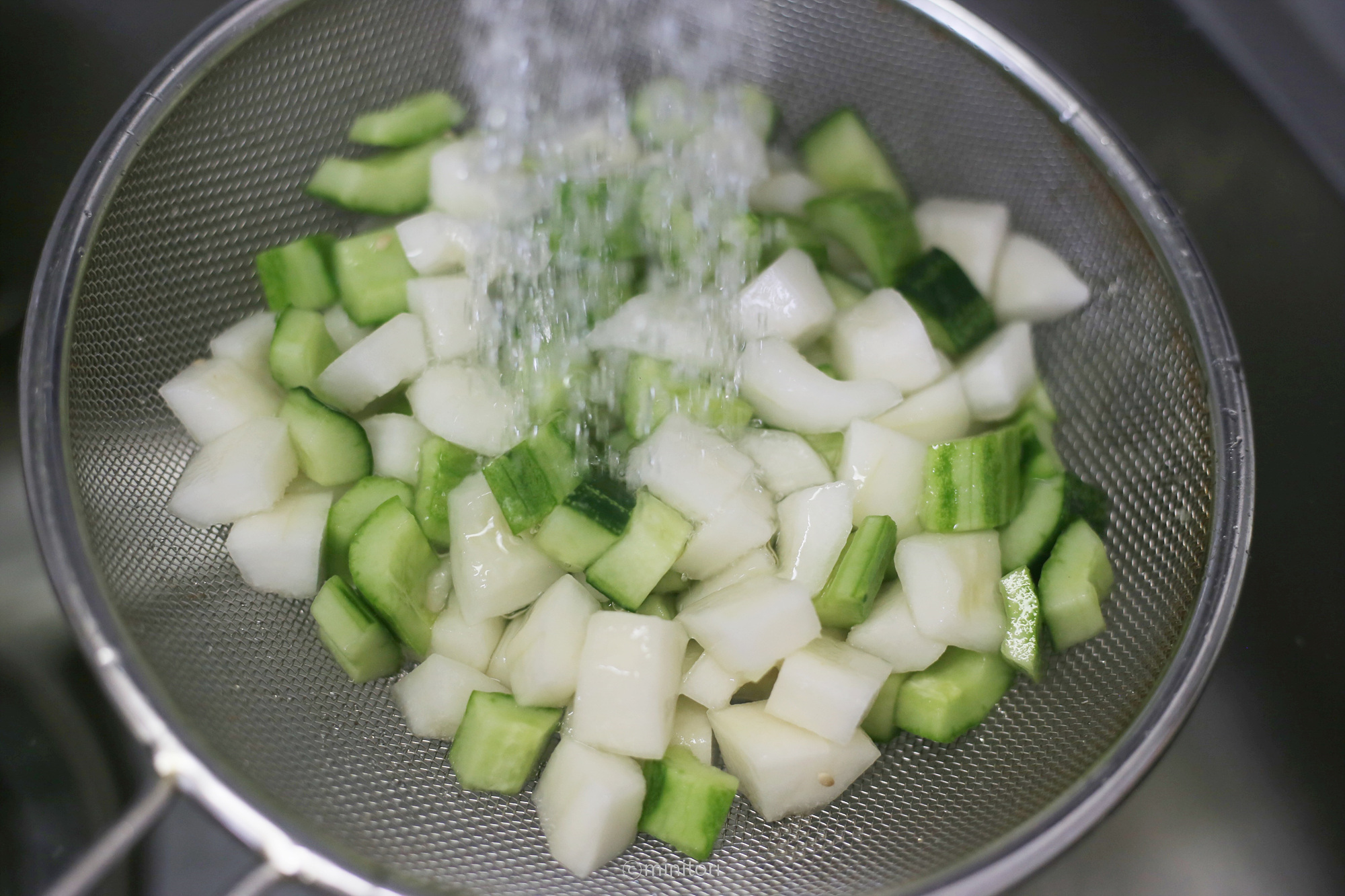 9. 절인 오이와 참외를 체에 밭쳐 흐르는 찬물에 헹구고 그대로 두어 물기를 뺀다.