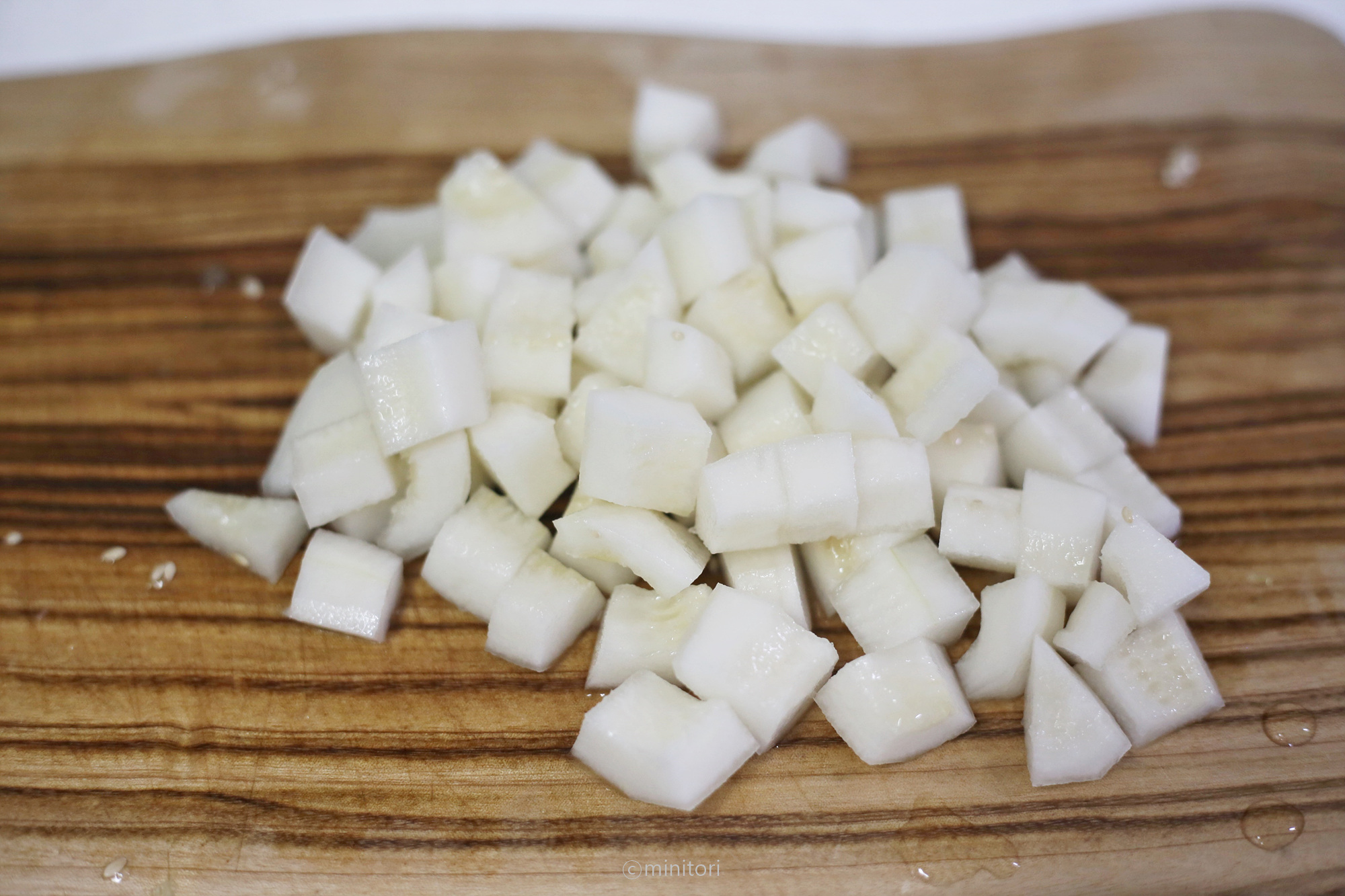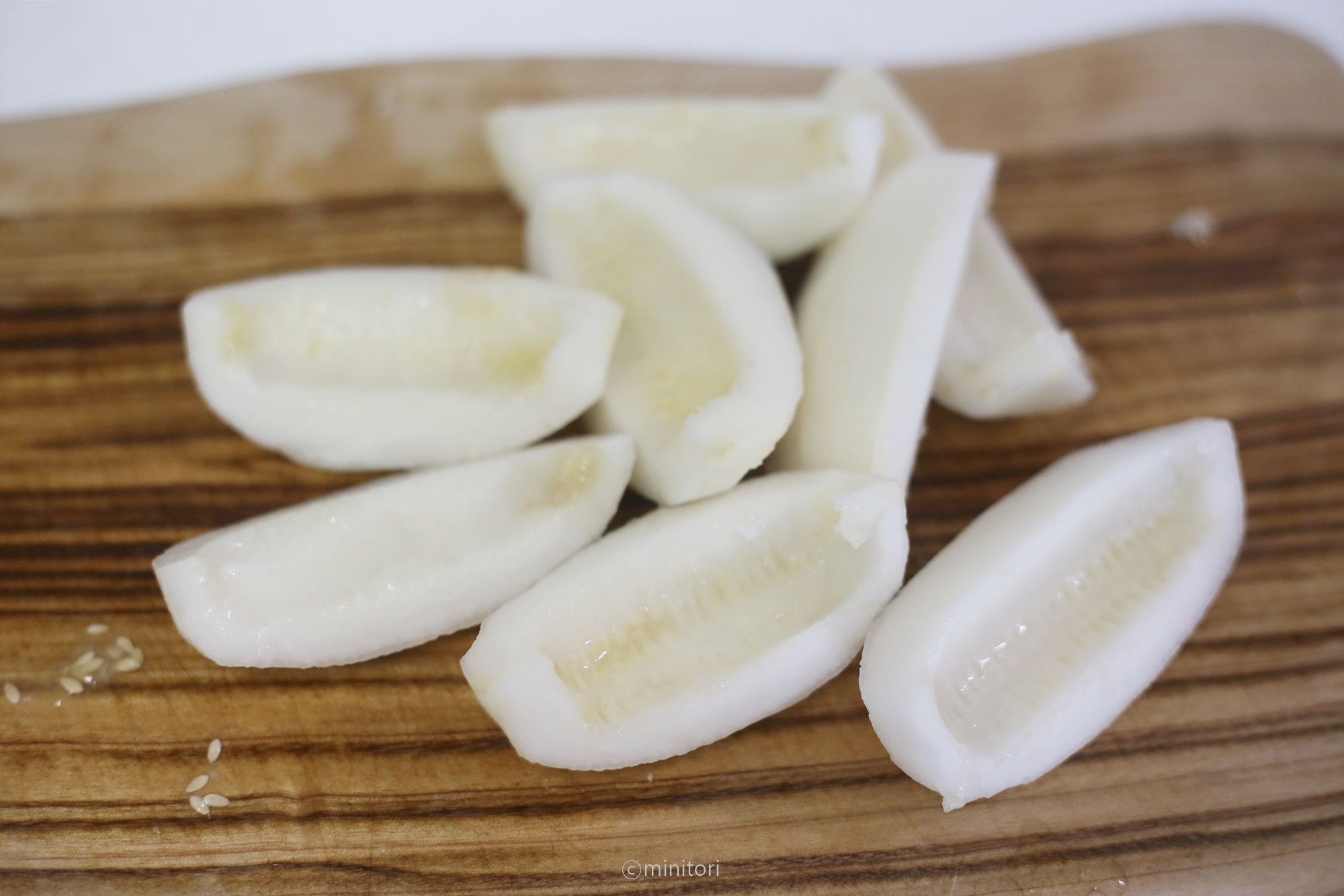 2. 참외는 껍질을 벗기고 씨를 제거하고 오이와 비슷한 크기로 깍둑썬다.
