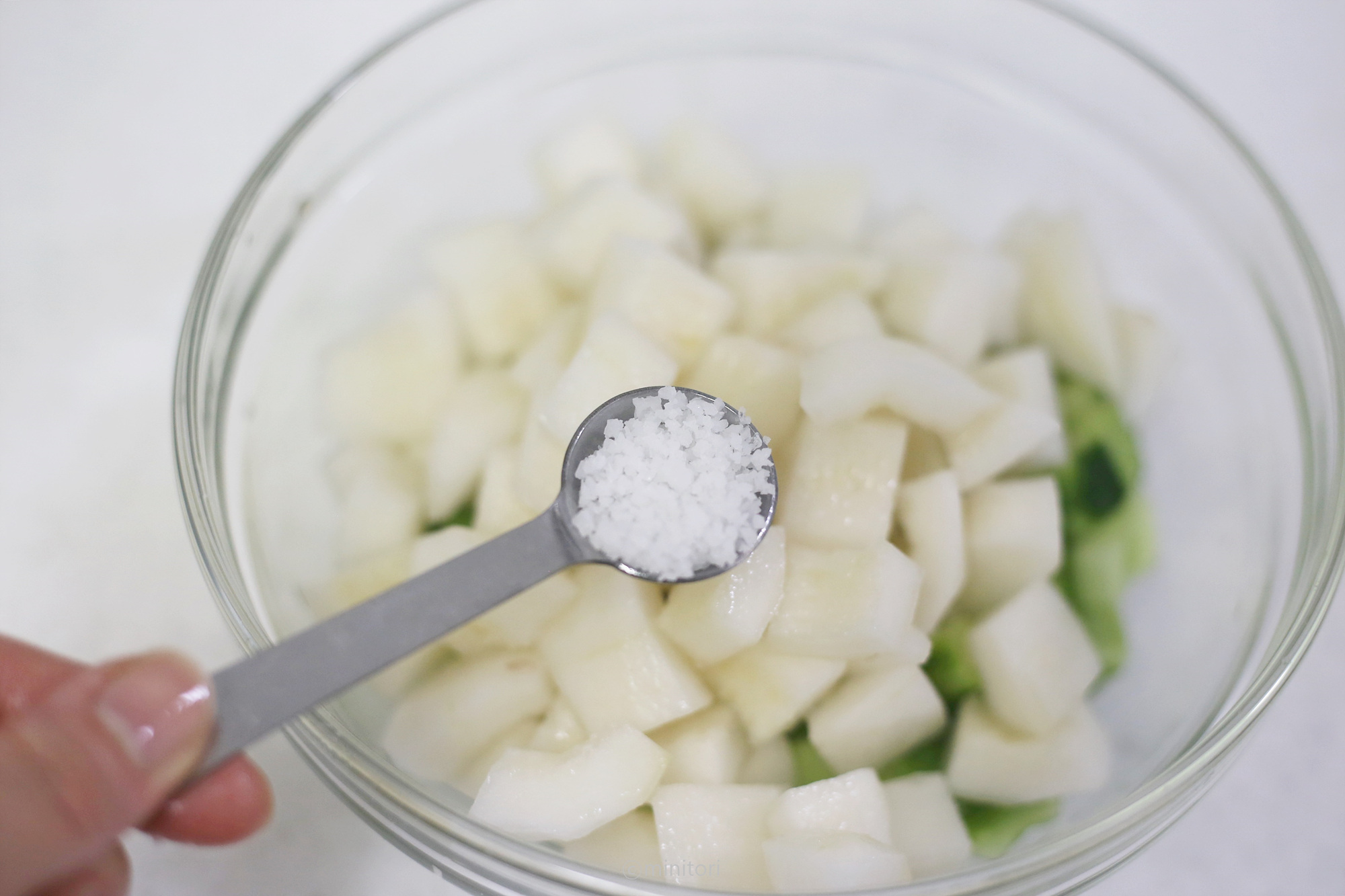 3. 넓은 볼에 참외와 깍두기를 넣고 소금 1/2t를 넣고 골고루 버무려 10~15분정도 절인다.