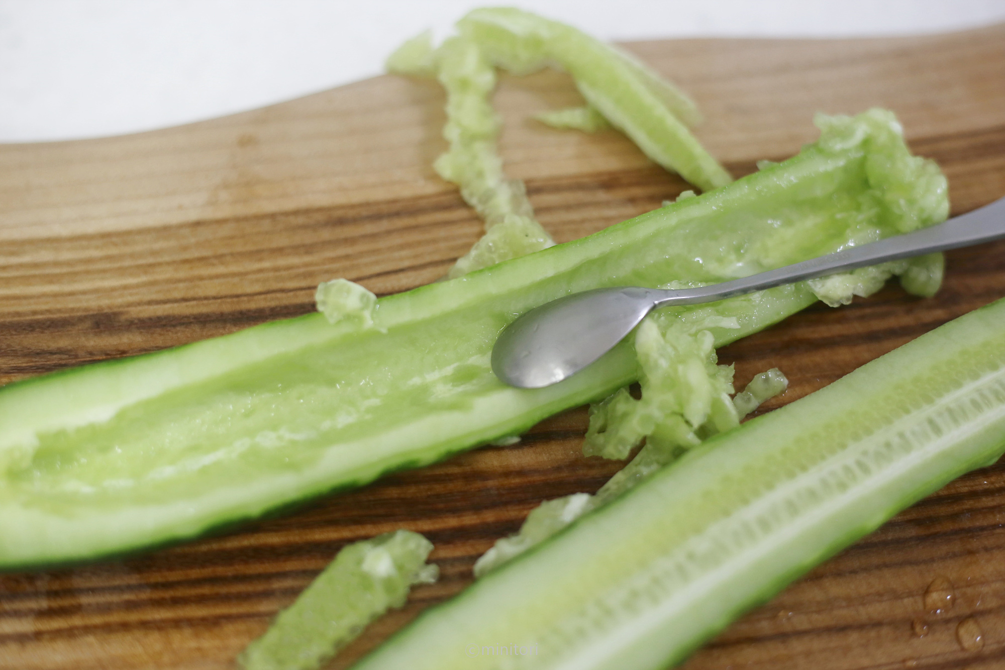 1. 오이는 필러로 가시부분을 제거하고 깨끗이 세척하여 반으로 갈라 씨를 제거하고 아기가 먹기좋은 크기로 깍둑썰기 한다
