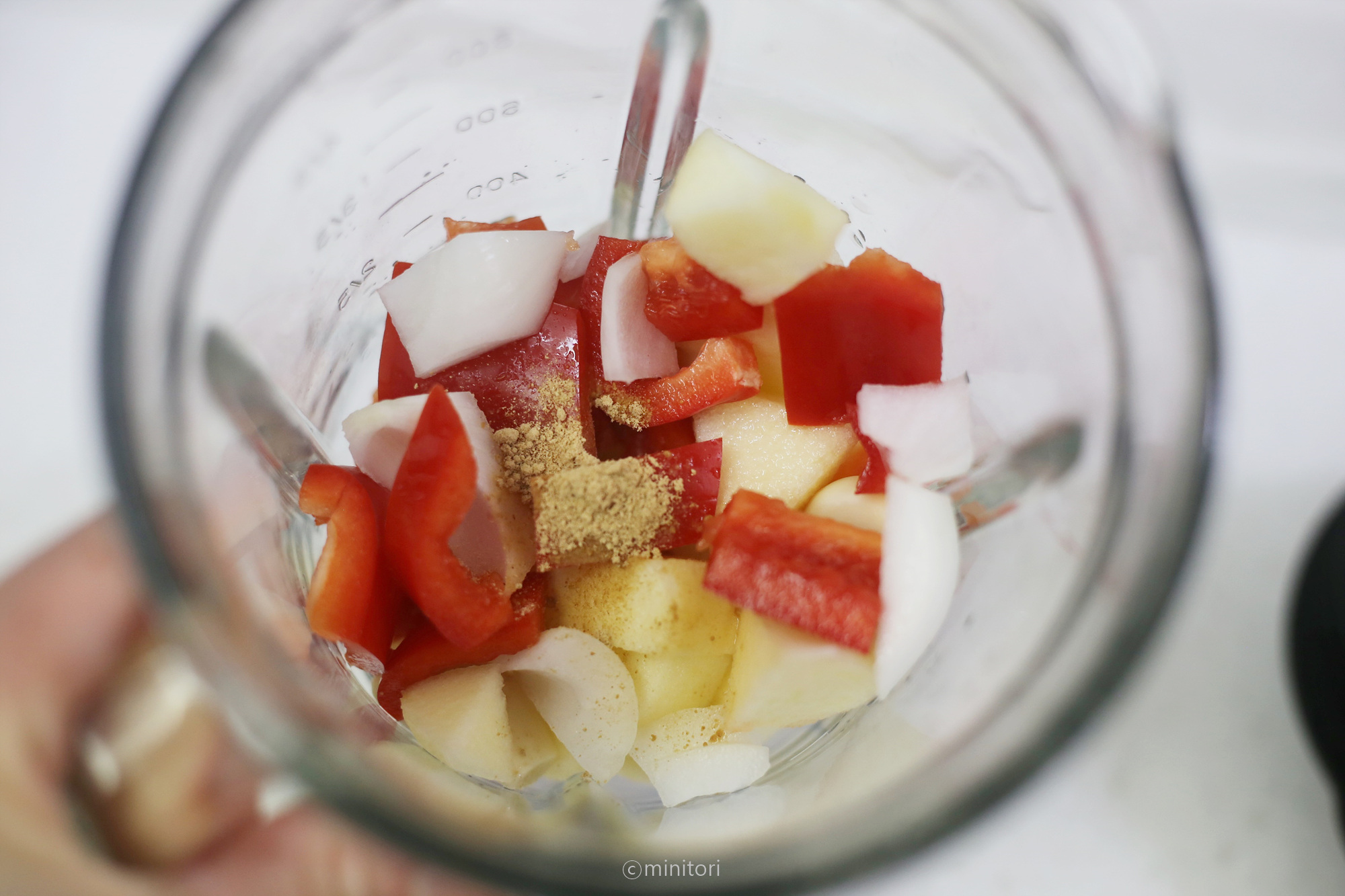 7. 믹서에 손질한 양파, 파프리카, 사과, 마늘, 생강가루를 넣고 재료를 곱게 갈아준다.
