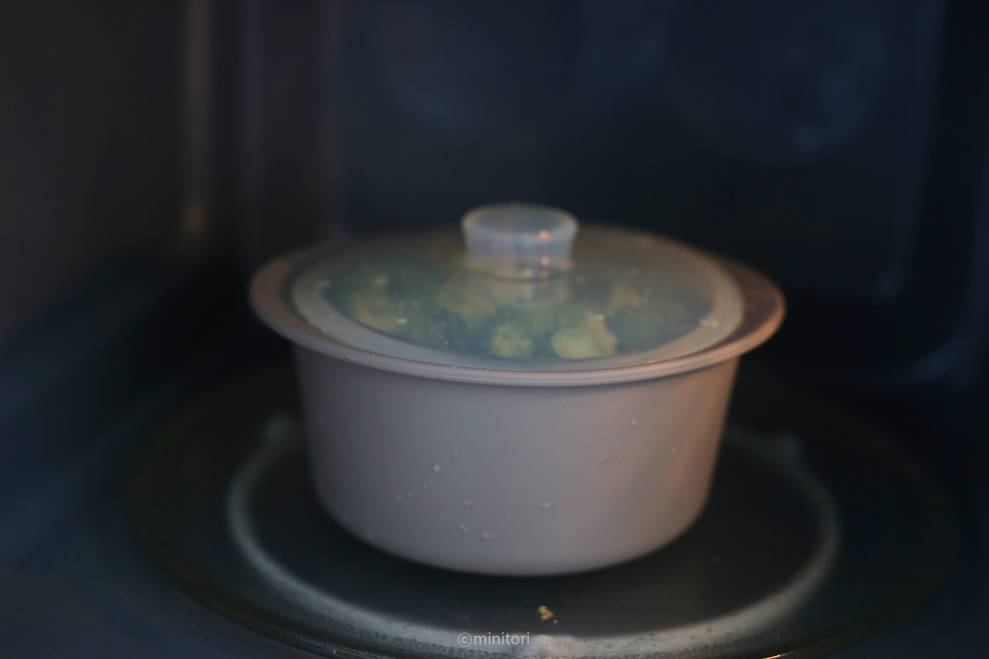 3. 브로콜리는 머리부분만 잘라 깨끗이 세척 후 전자레인지 사용가능한 용기에 담아 3분정도 돌려 익힌 후 식혀둔다.