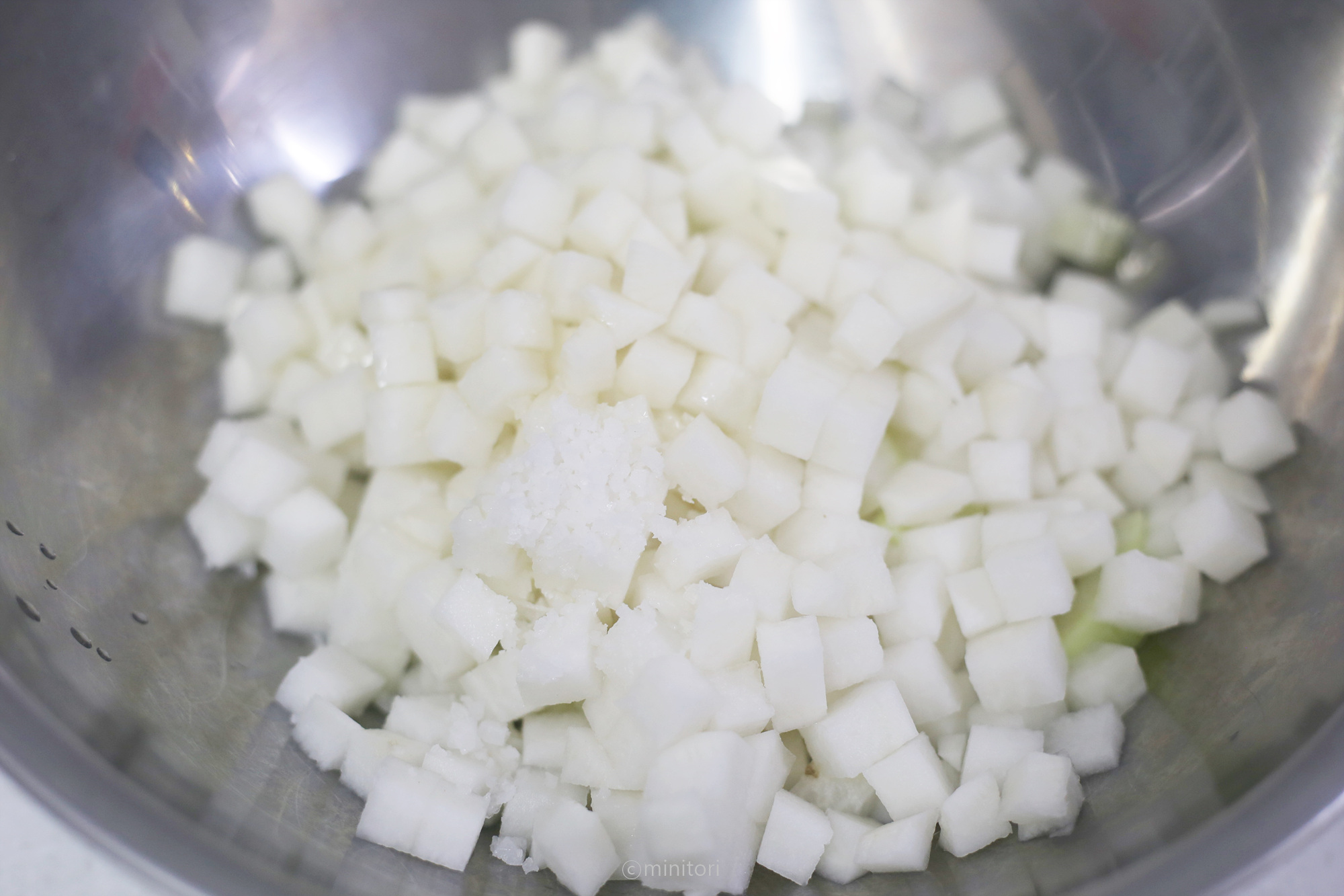 2. 깍둑썬무를 큰 볼에 담고 소금 2.5t, 올리고당 2t를 넣어 섞어 30분정도 절인다.