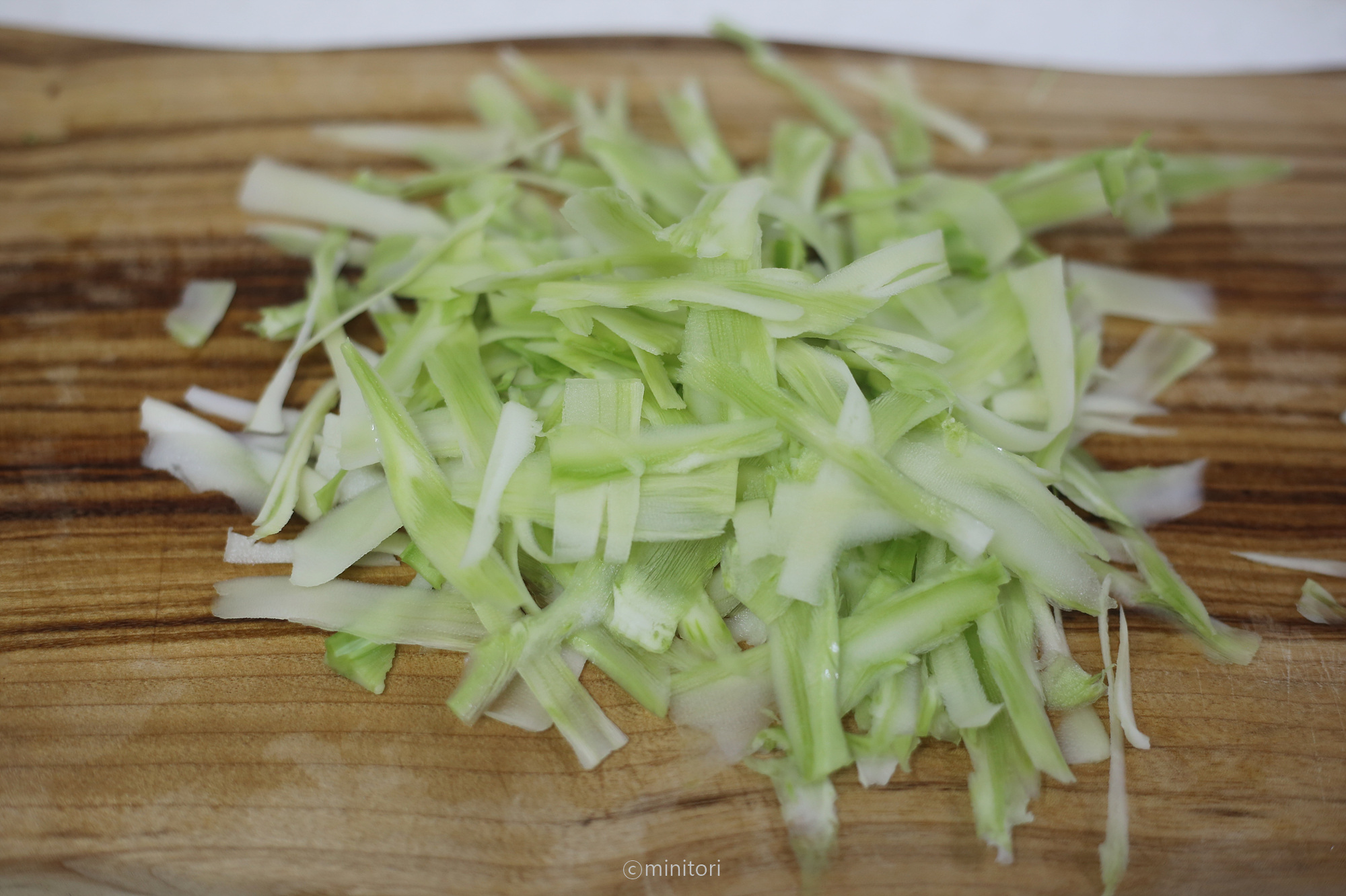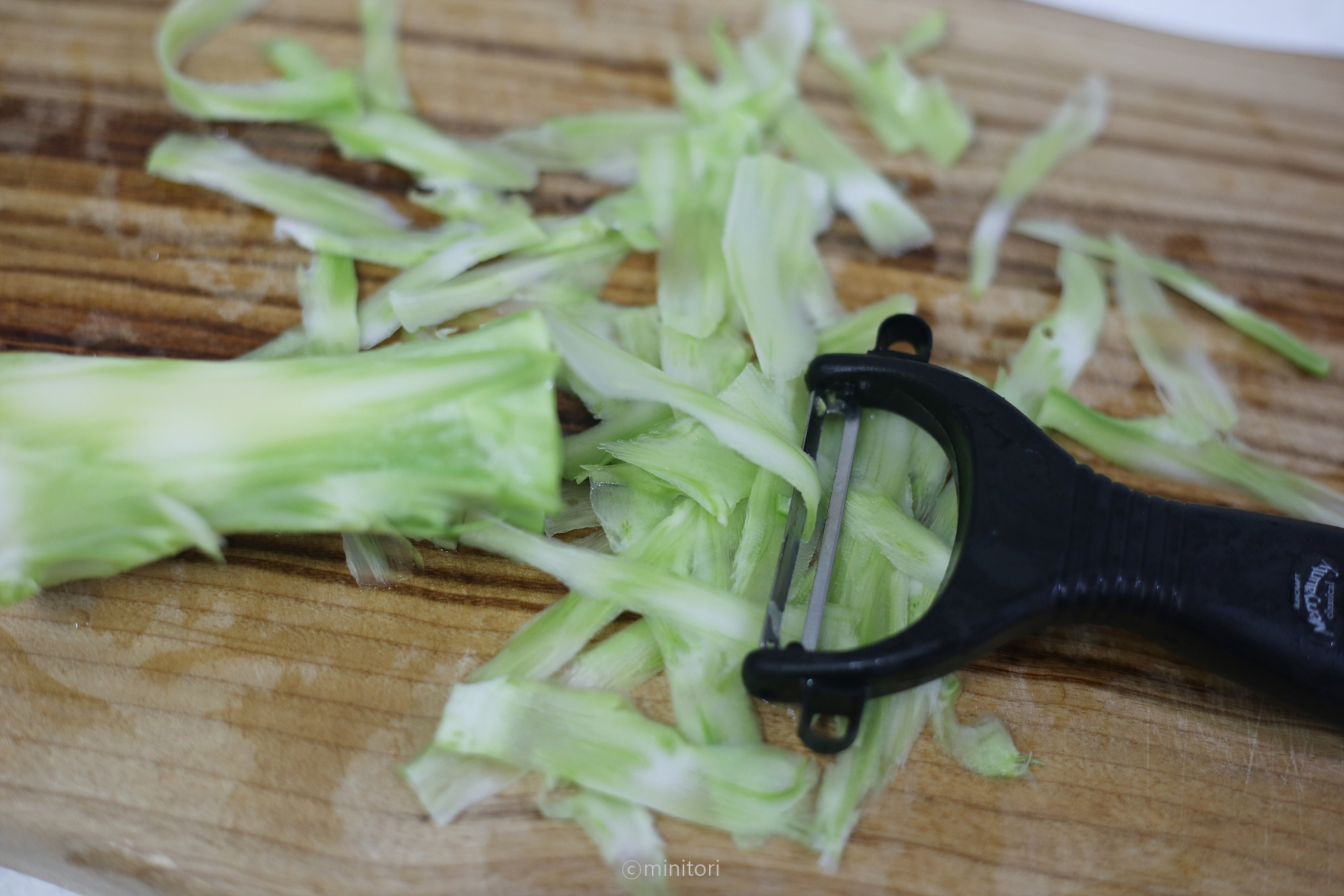1. 브로콜리 줄기는 깨끗이 씻어 초록 겉껍질은 벗겨내고 필러로 얇게 채썬다. (겉껍질은 식감이 질겨 벗겨내고 만드는걸 추천드려요)