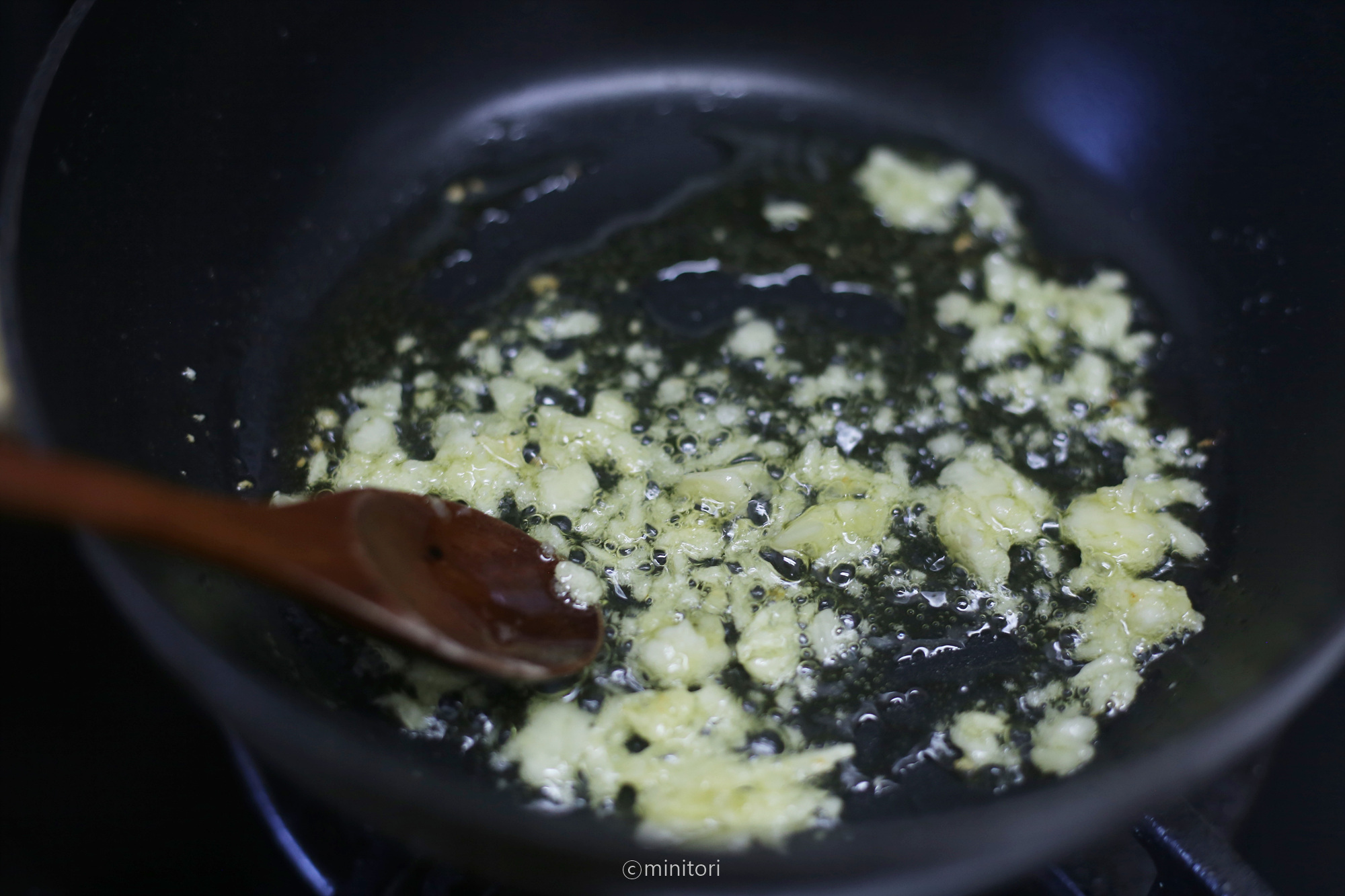 3. 팬에 올리브유를 두르고 다진마늘을 넣고 약한불에서 노릇하게 볶는다.